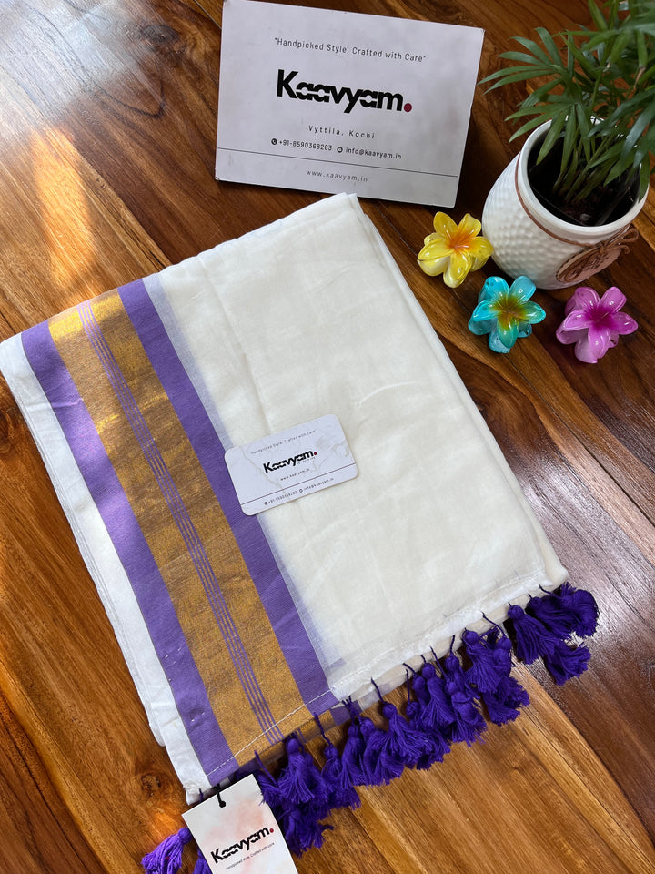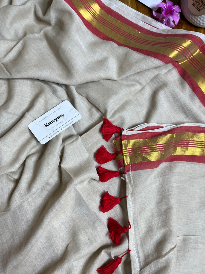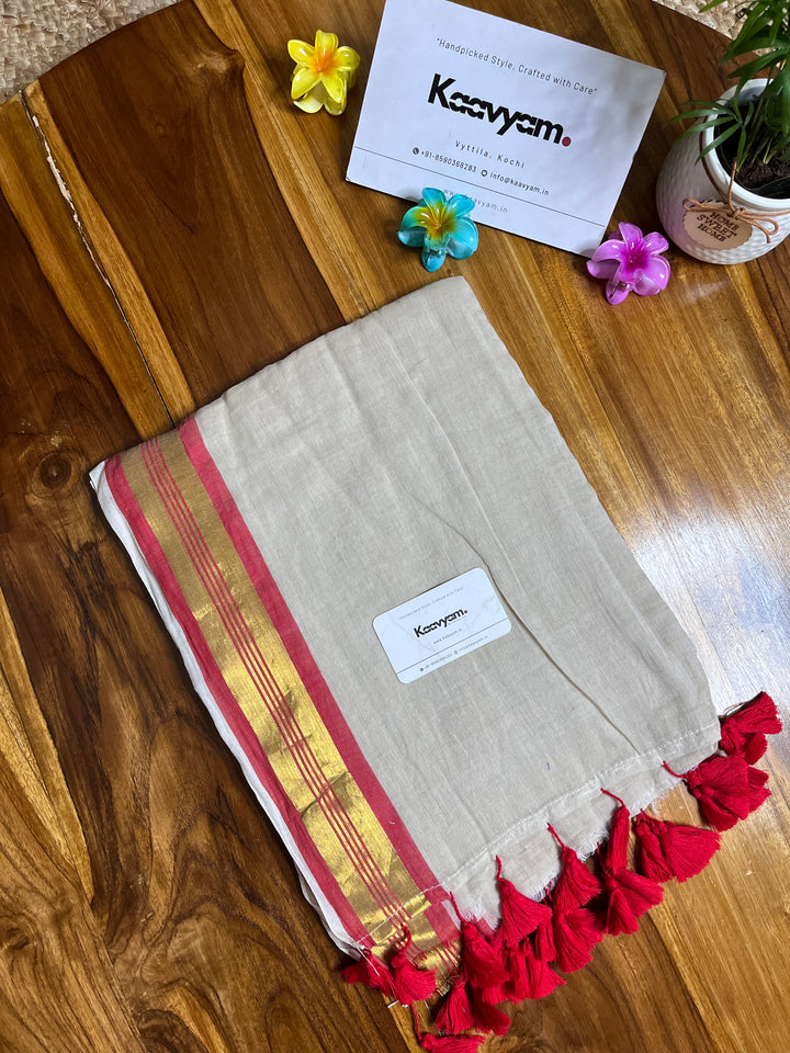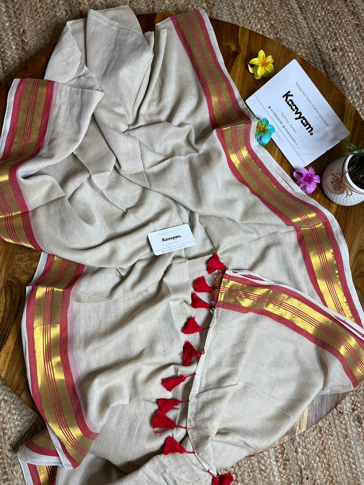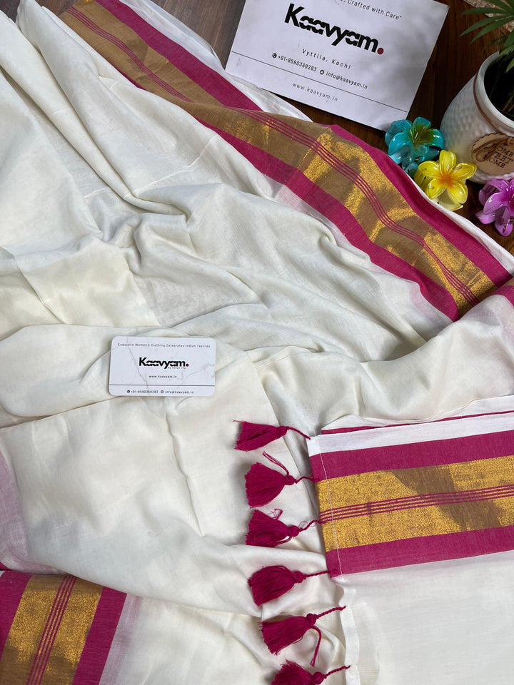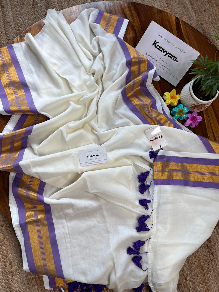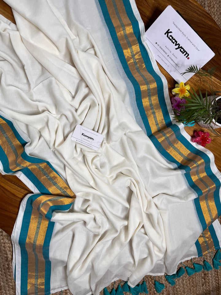 Pure cotton mul mul plain saree with kasav & kara border all over the saree ended with handmade tassels on pallu