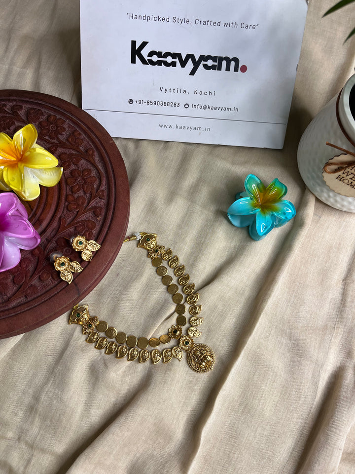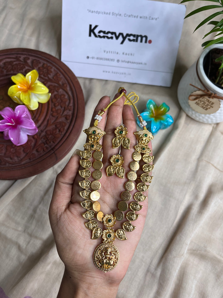 Elevate your jewelry collection with the Lakshmi Layer Coin Neckpiece & Earrings set. Expertly crafted, this ensemble features intricately designed coin motifs layered to create a rich, traditional aesthetic. Perfect for...