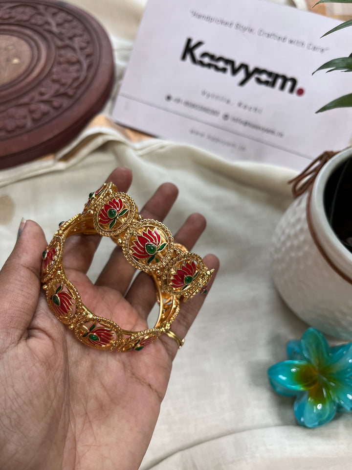 Most viral and trending lotus bangles now available in store Gold pleated bangles One pair bangles included in this package Actual pics shared, No changes from this. Color may slightly...