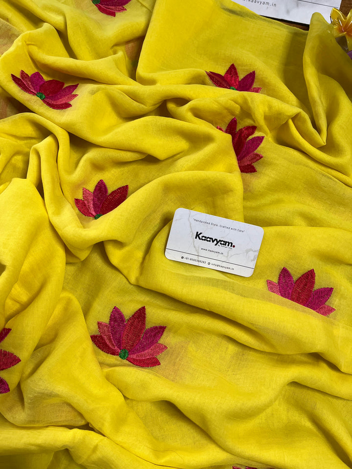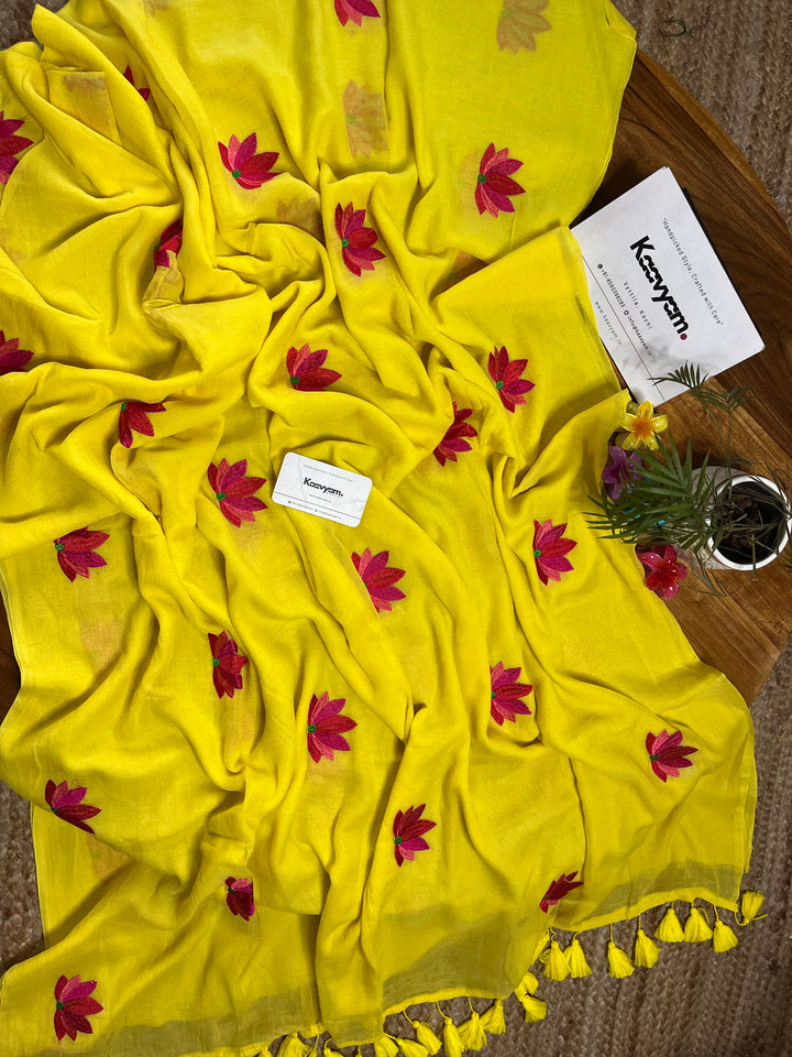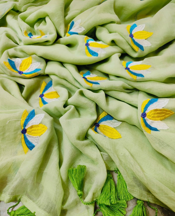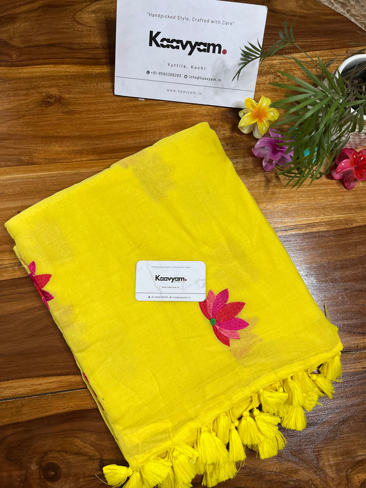 Plain mul cotton saree with lotus embroidery all over the saree ended with handmade tassels on pallu.