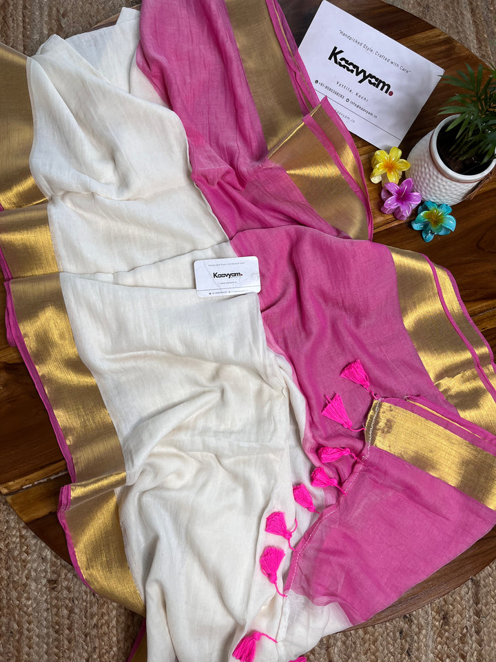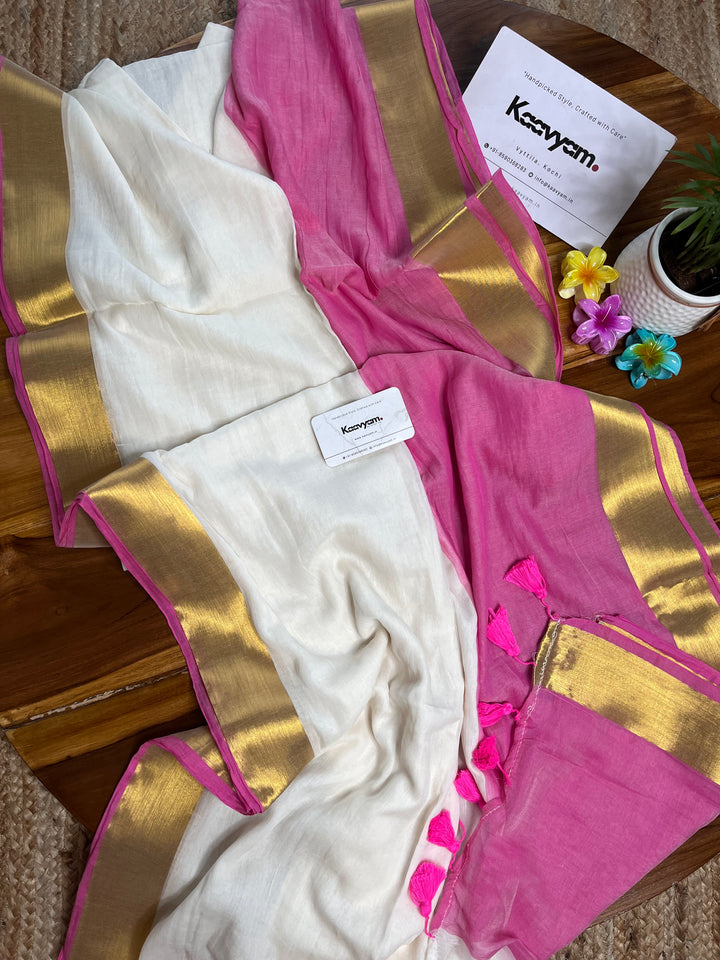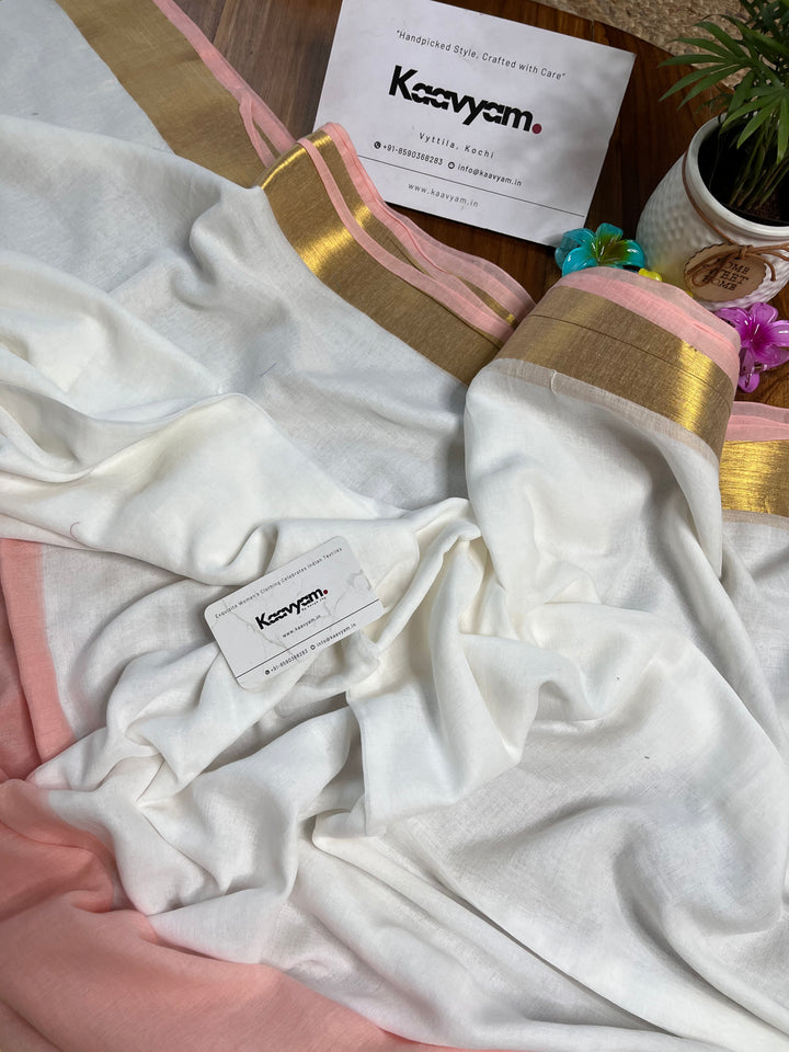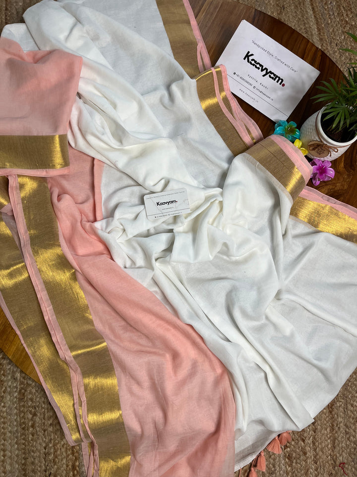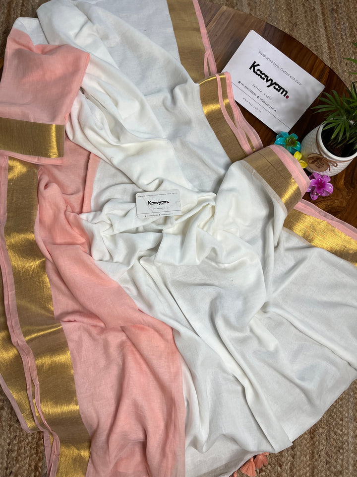Step into a fairytale with this off white Kerala kasav inspired saree, a whimsical blend of elegance and charm