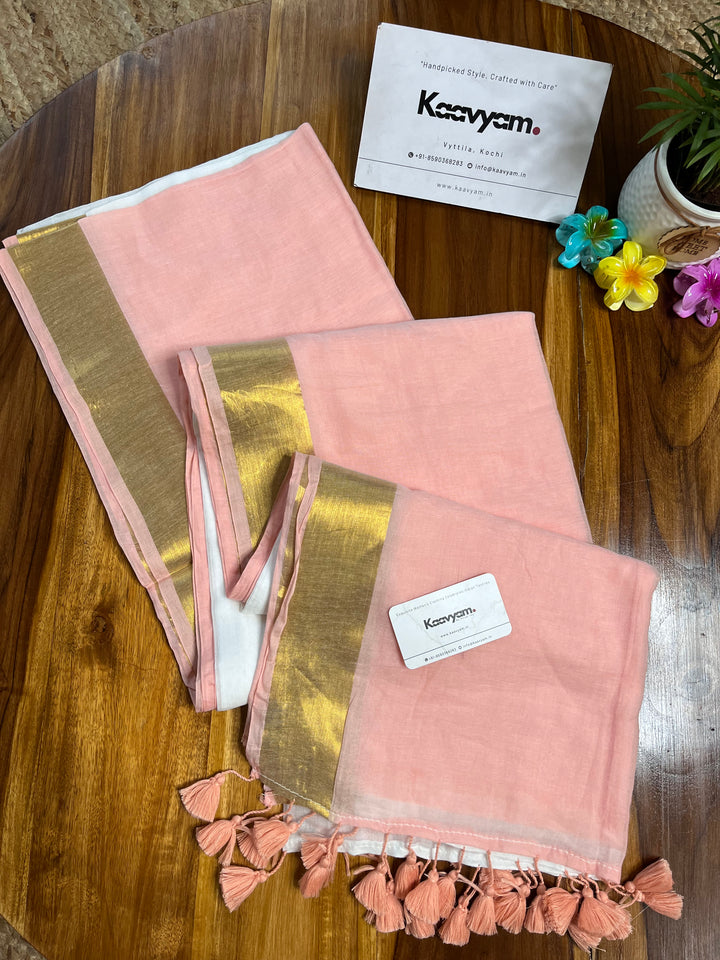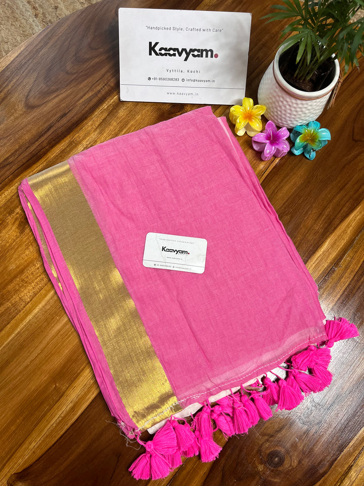 Pure mul cotton saree with kasav border and colorful broad border all over the saree ended with handmade tassels on pallu.