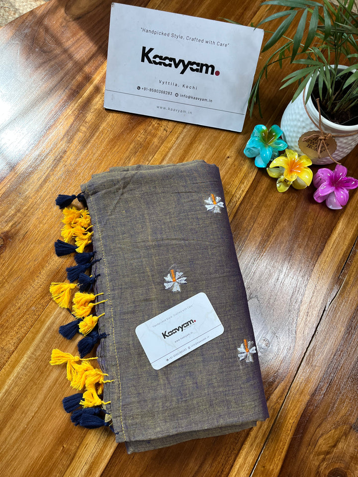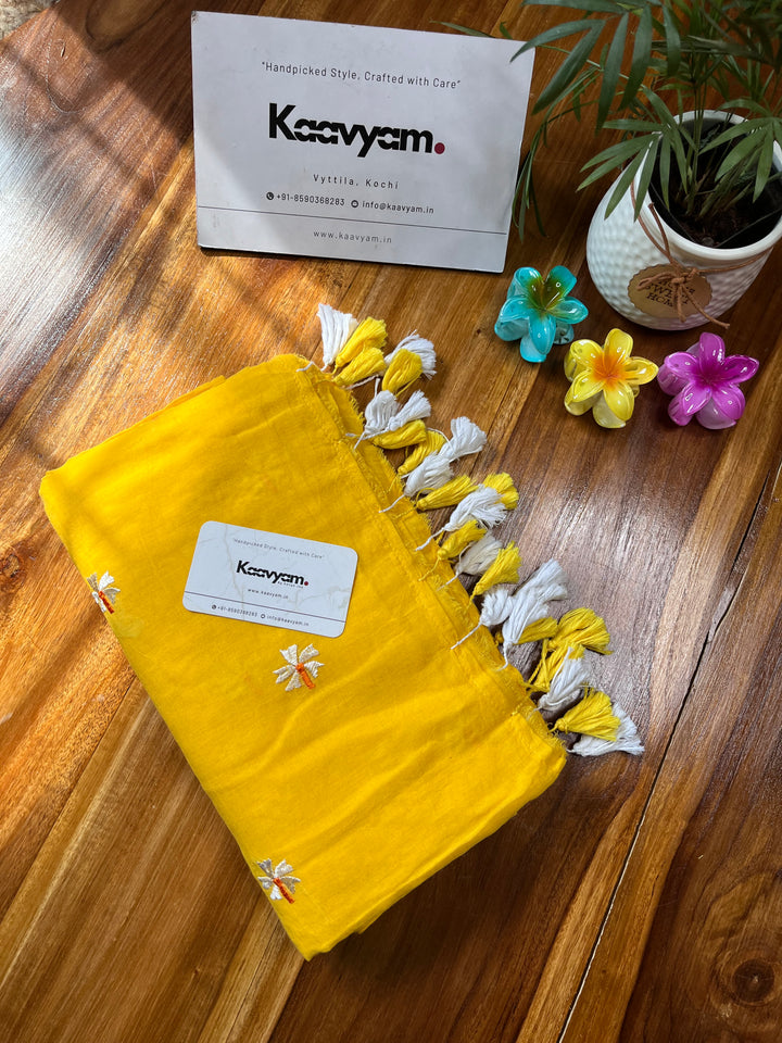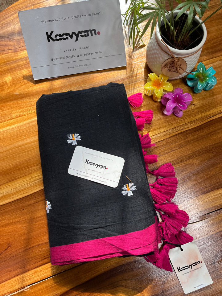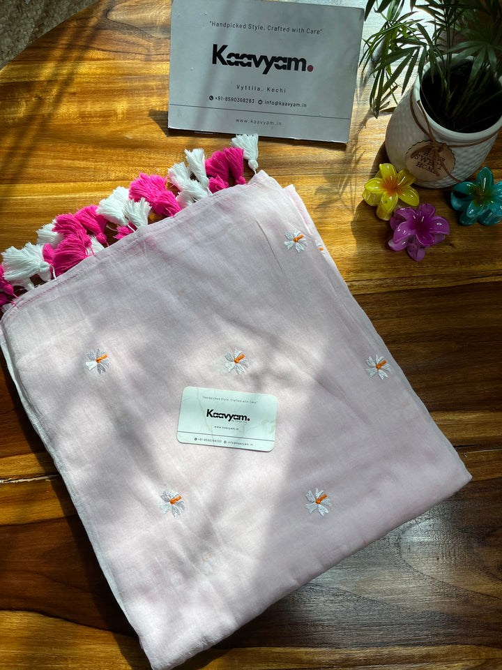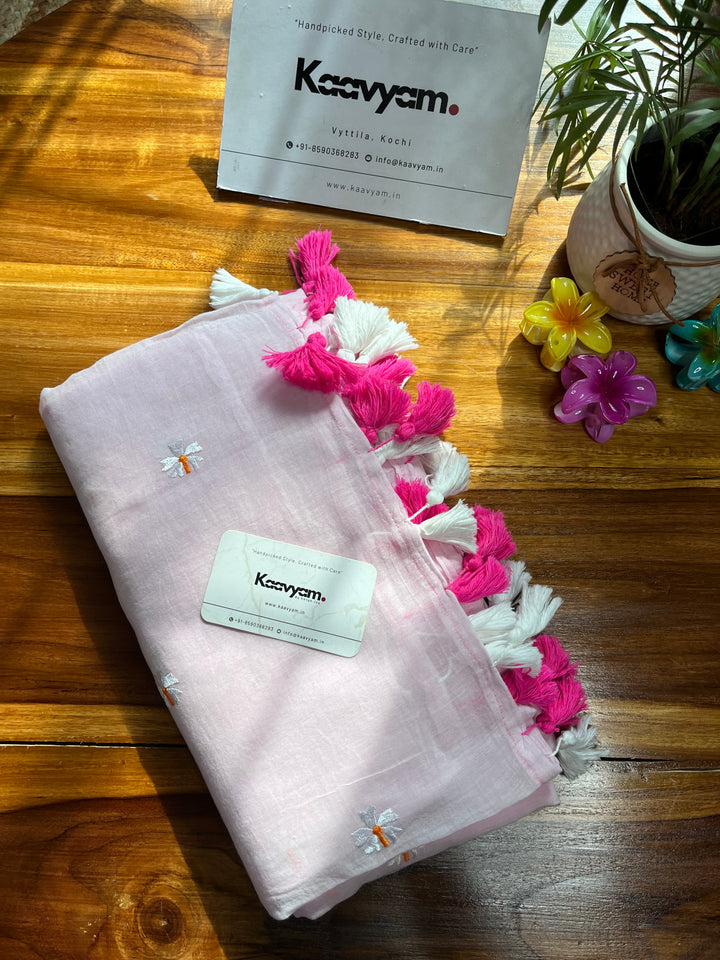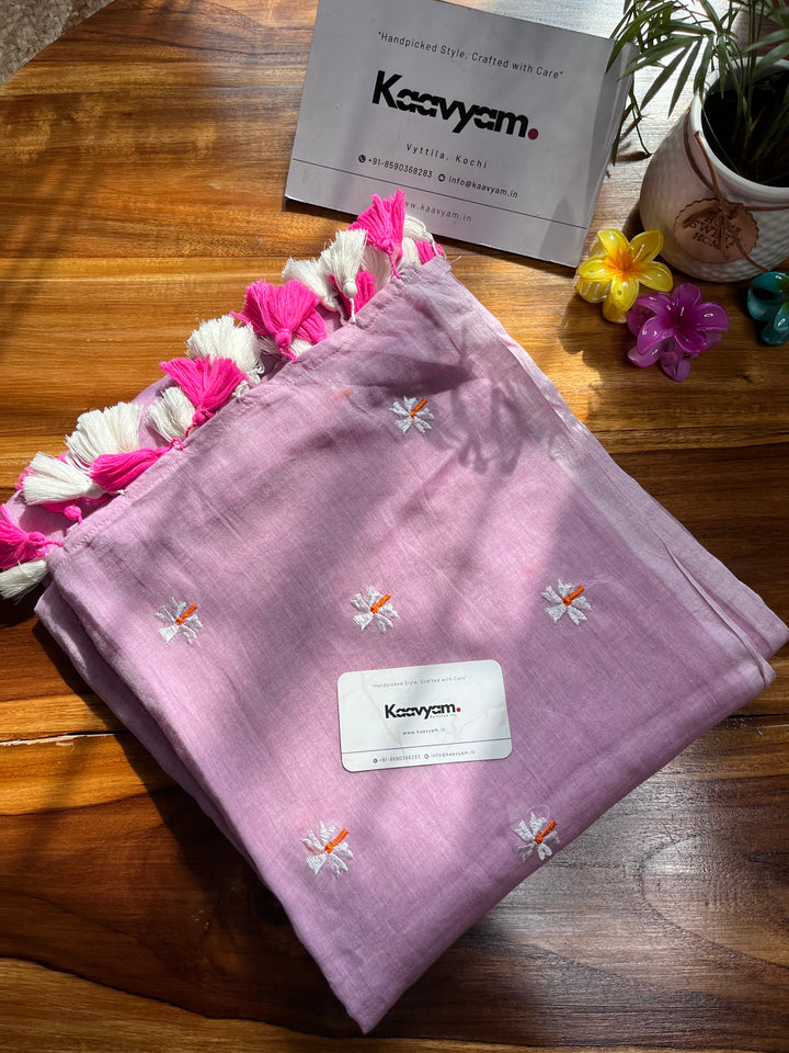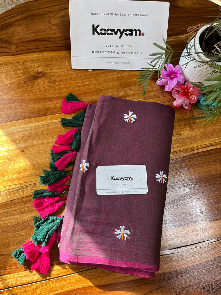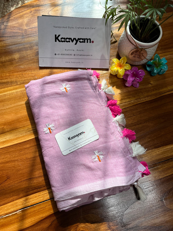 Plain color mul cotton saree with mallippoo embroidery all over the saree ended with handmade tassels