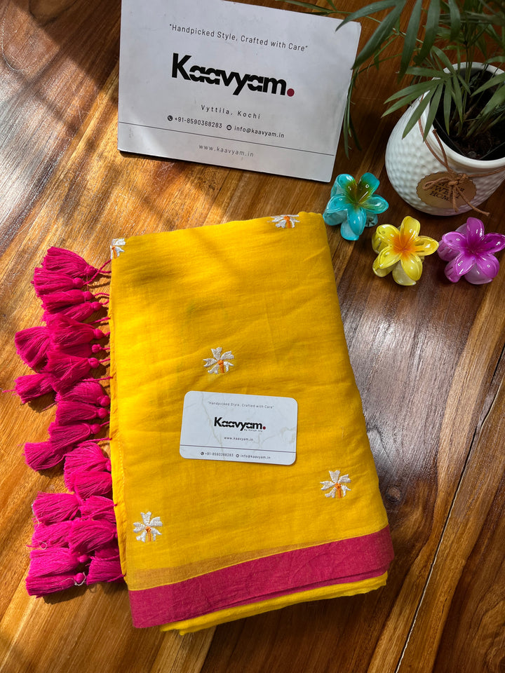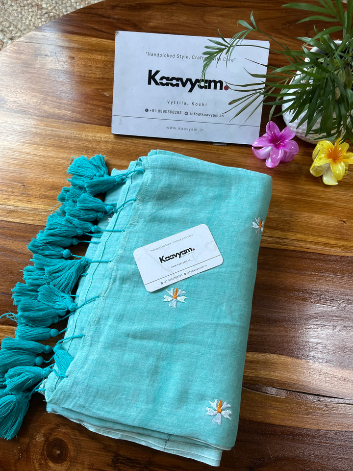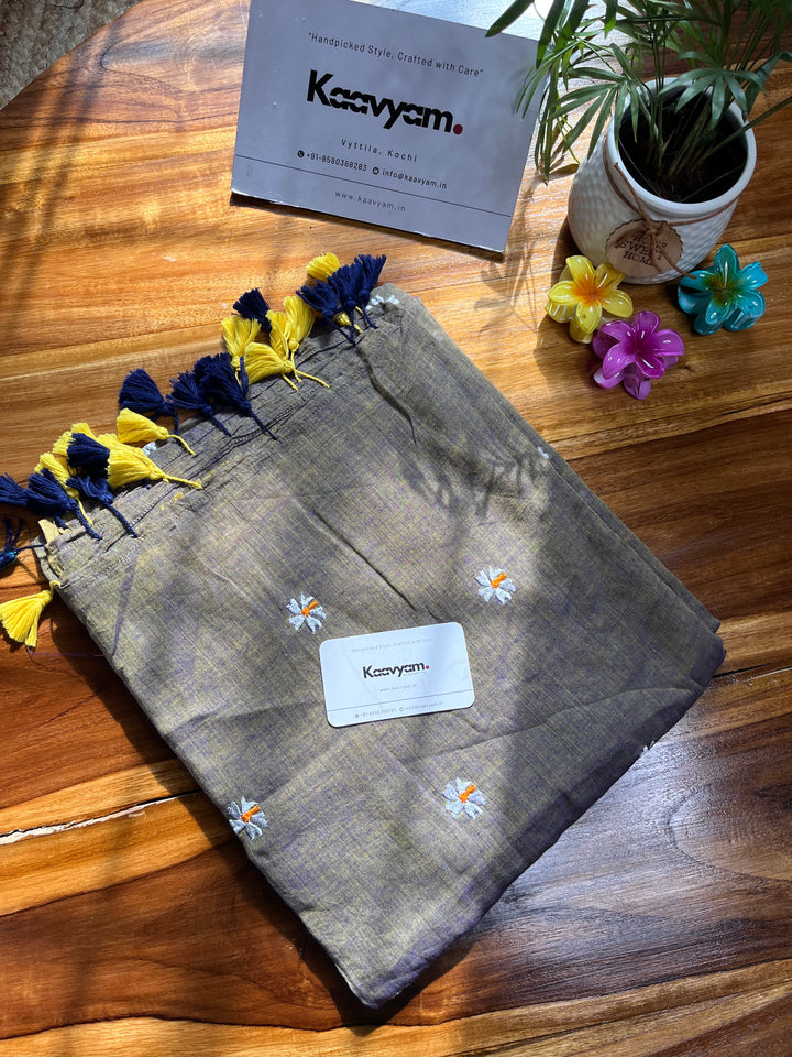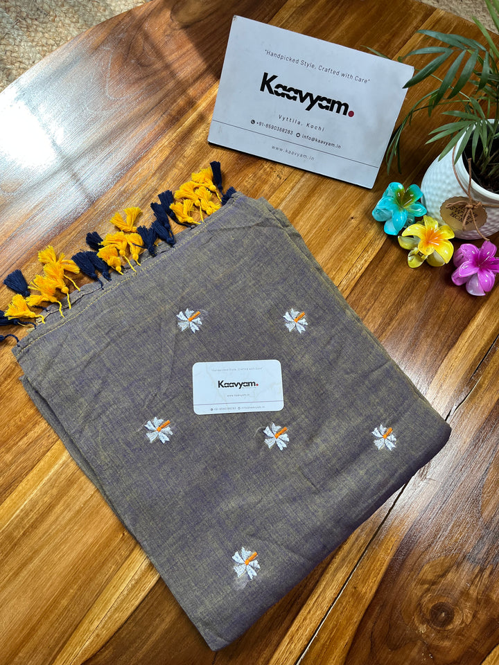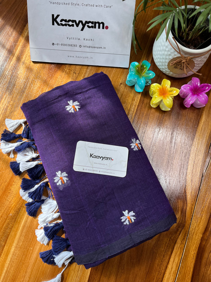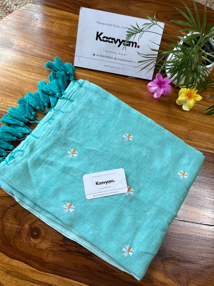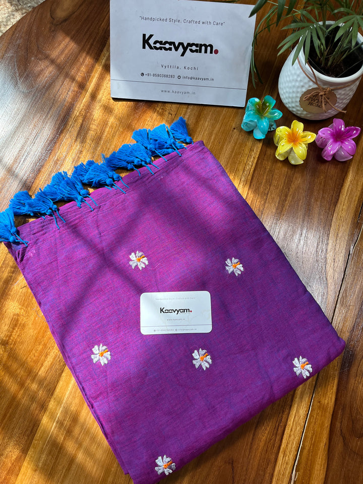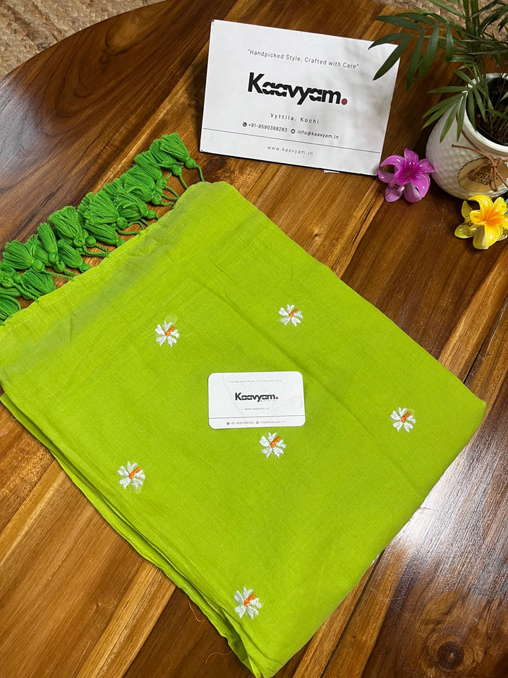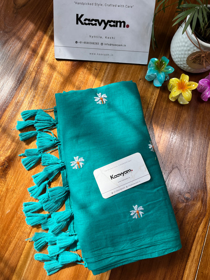 Plain color mul cotton saree with mallippoo embroidery all over the saree ended with handmade tassels