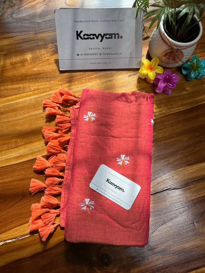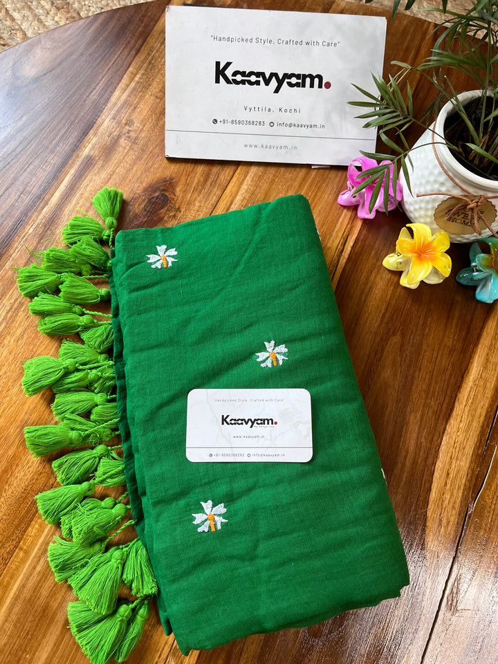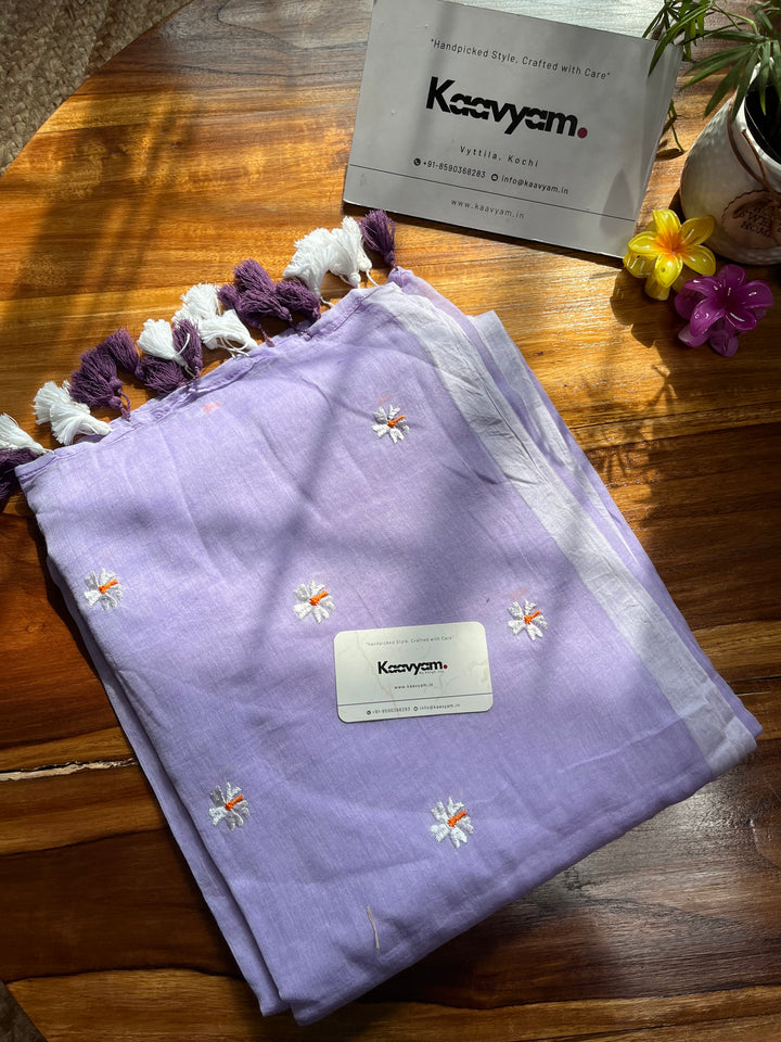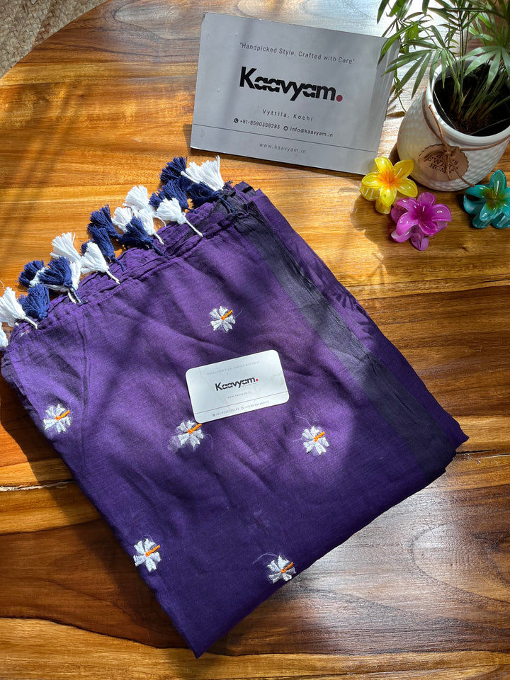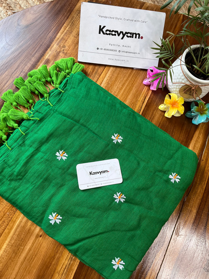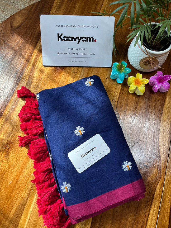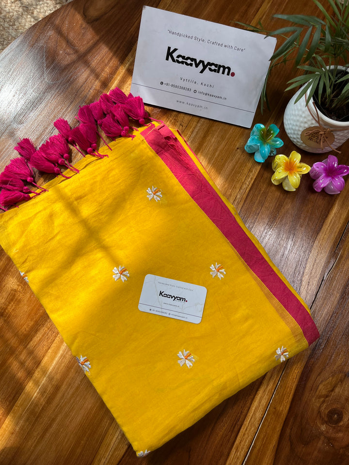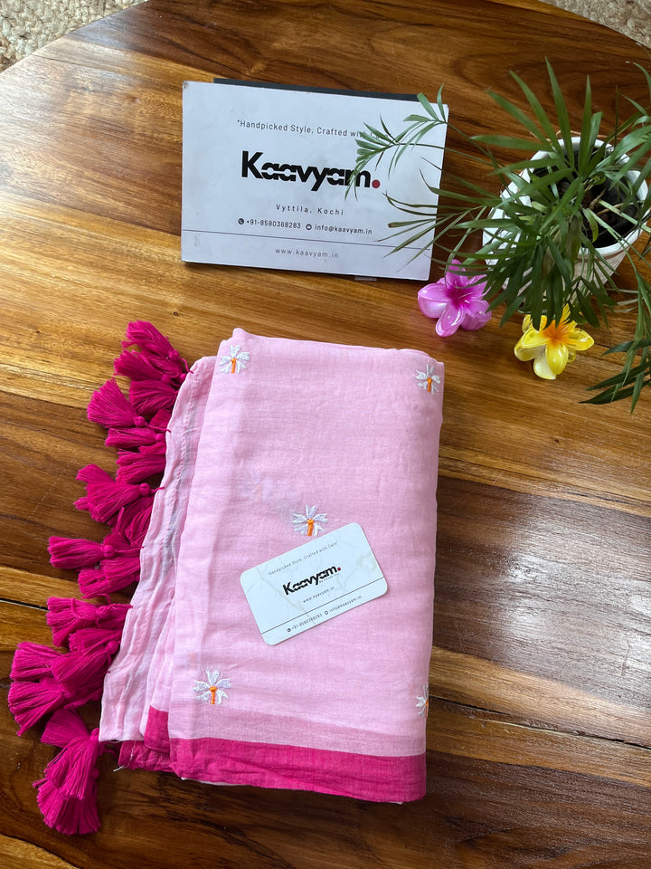 Plain color mul cotton saree with mallippoo embroidery all over the saree ended with handmade tassels