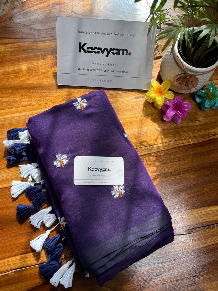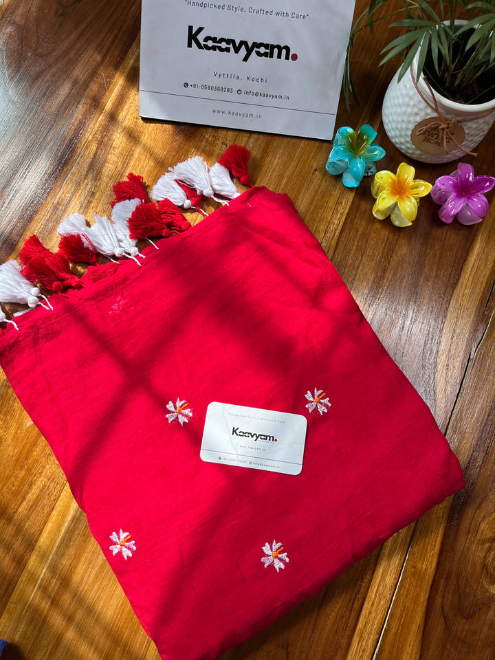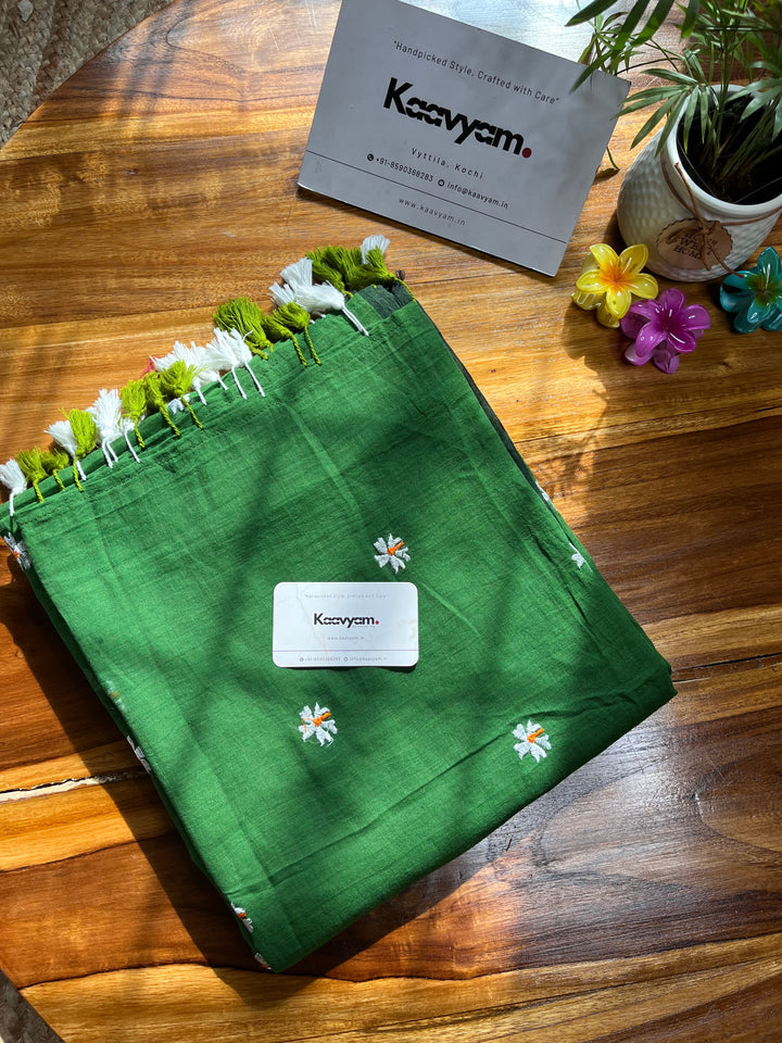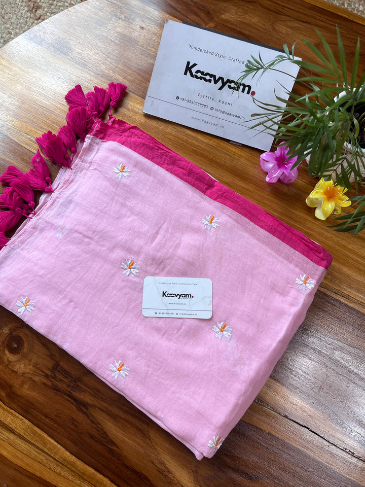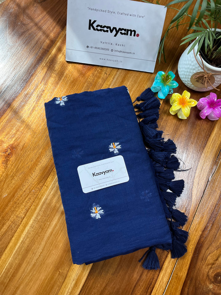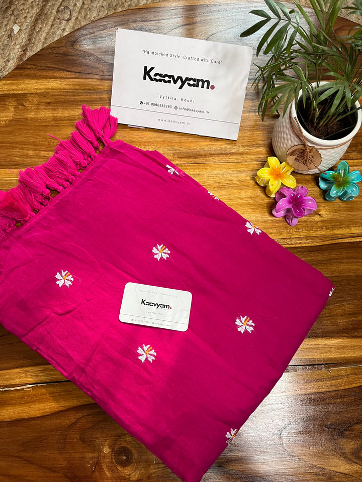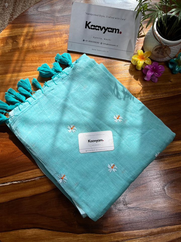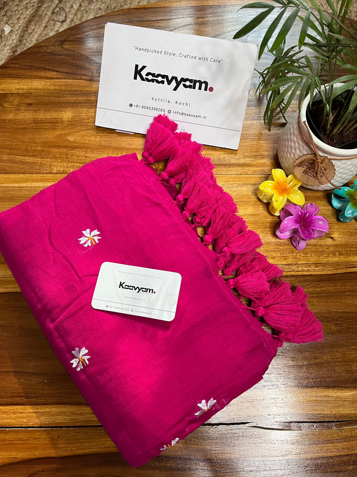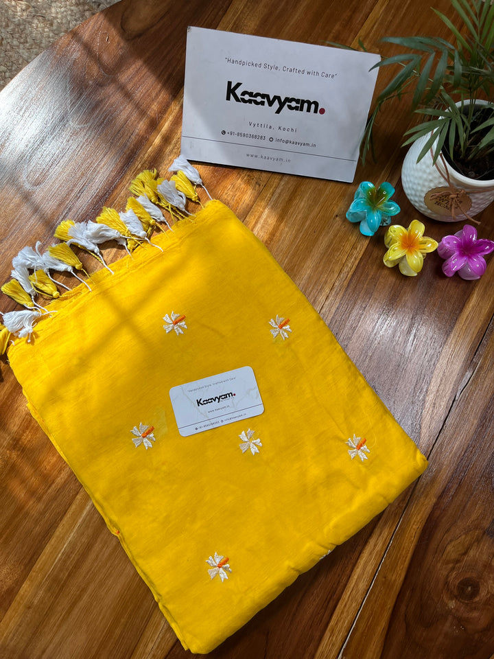 Plain color mul cotton saree with mallippoo embroidery all over the saree ended with handmade tassels