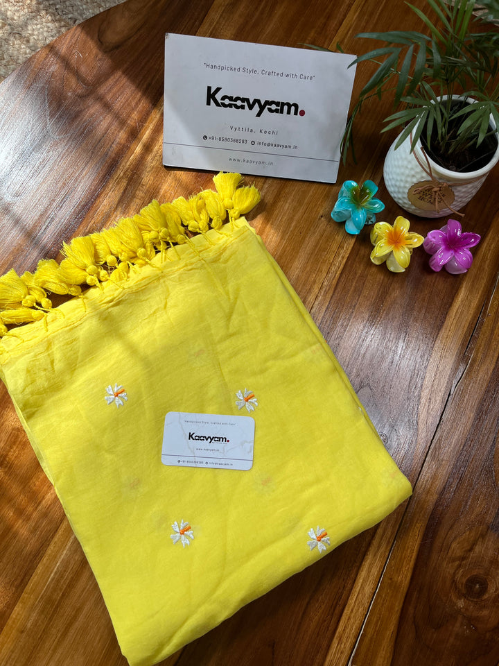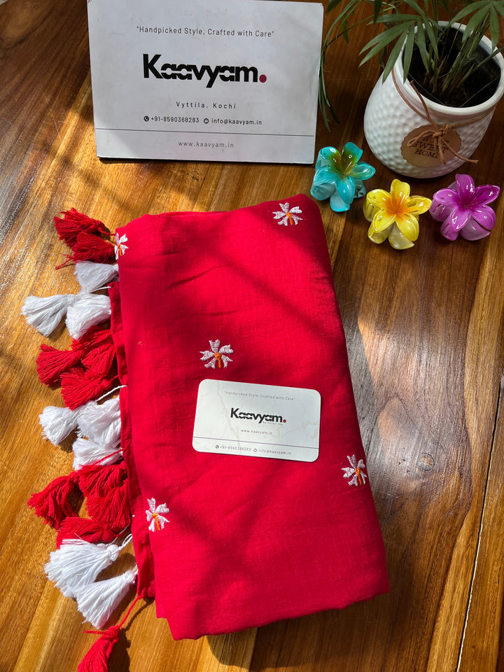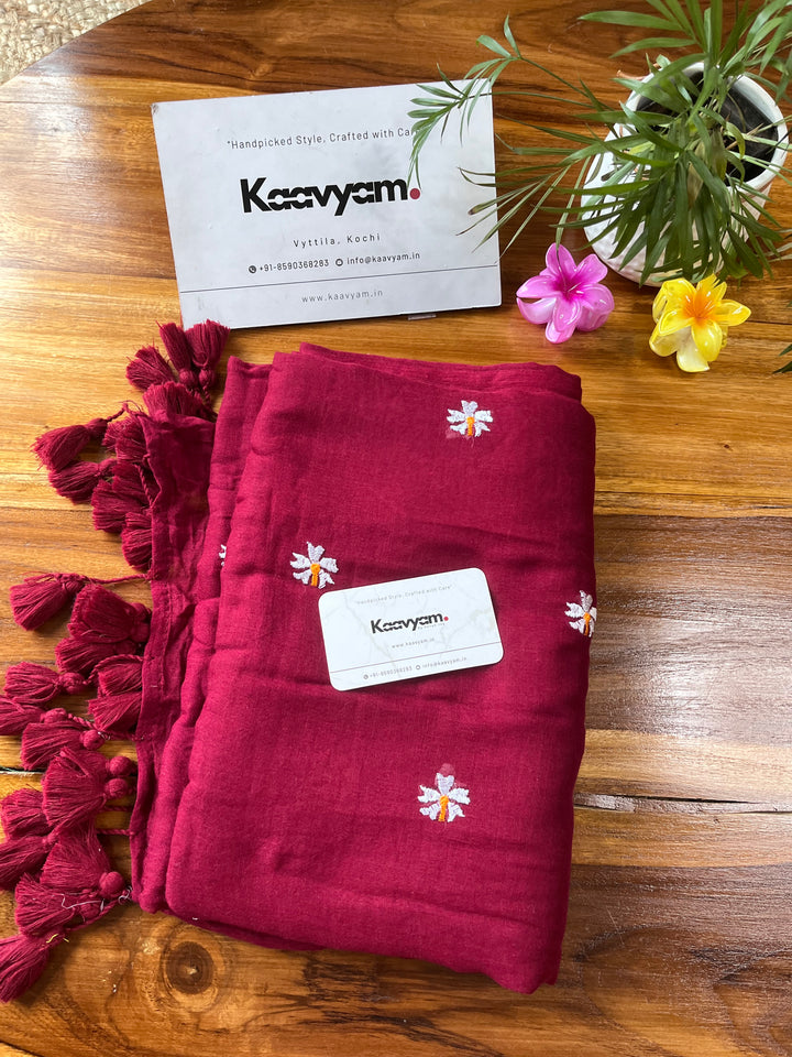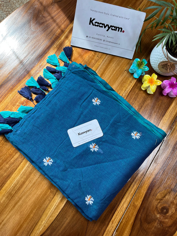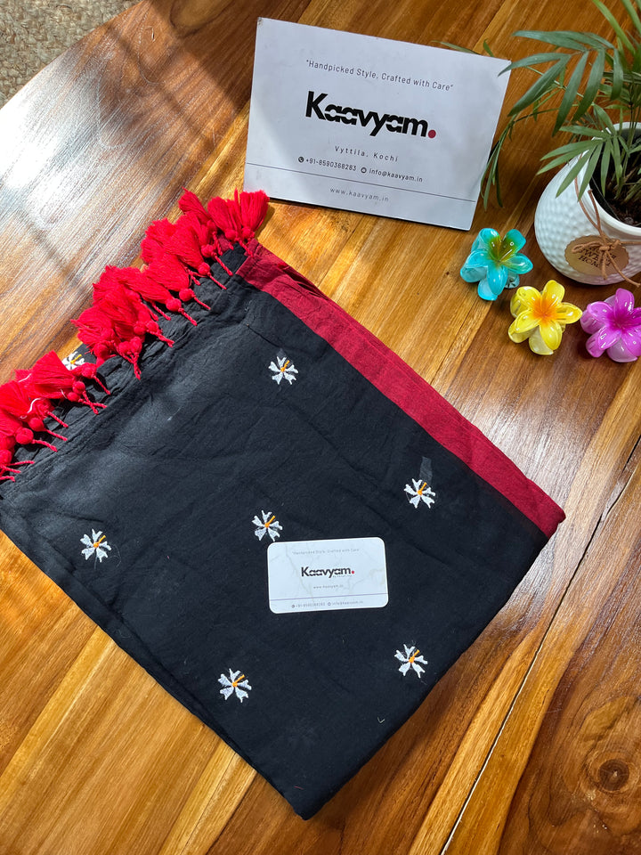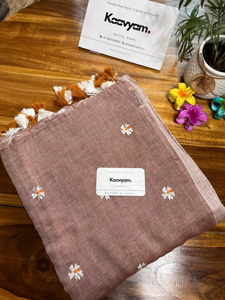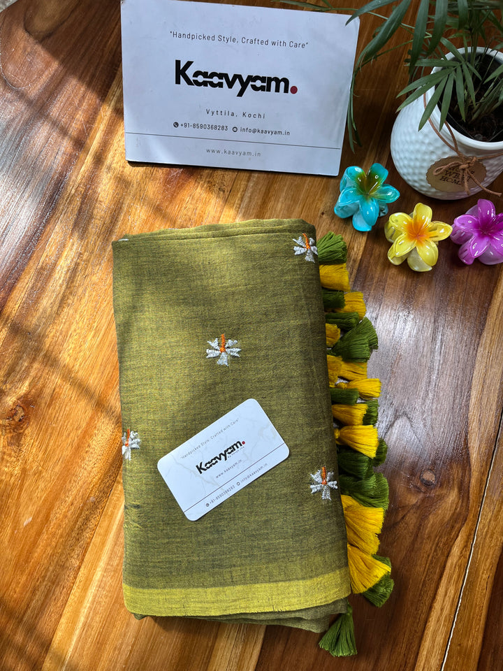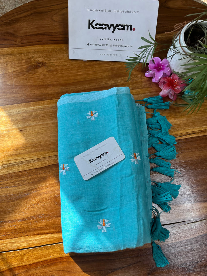 Plain color mul cotton saree with mallippoo embroidery all over the saree ended with handmade tassels