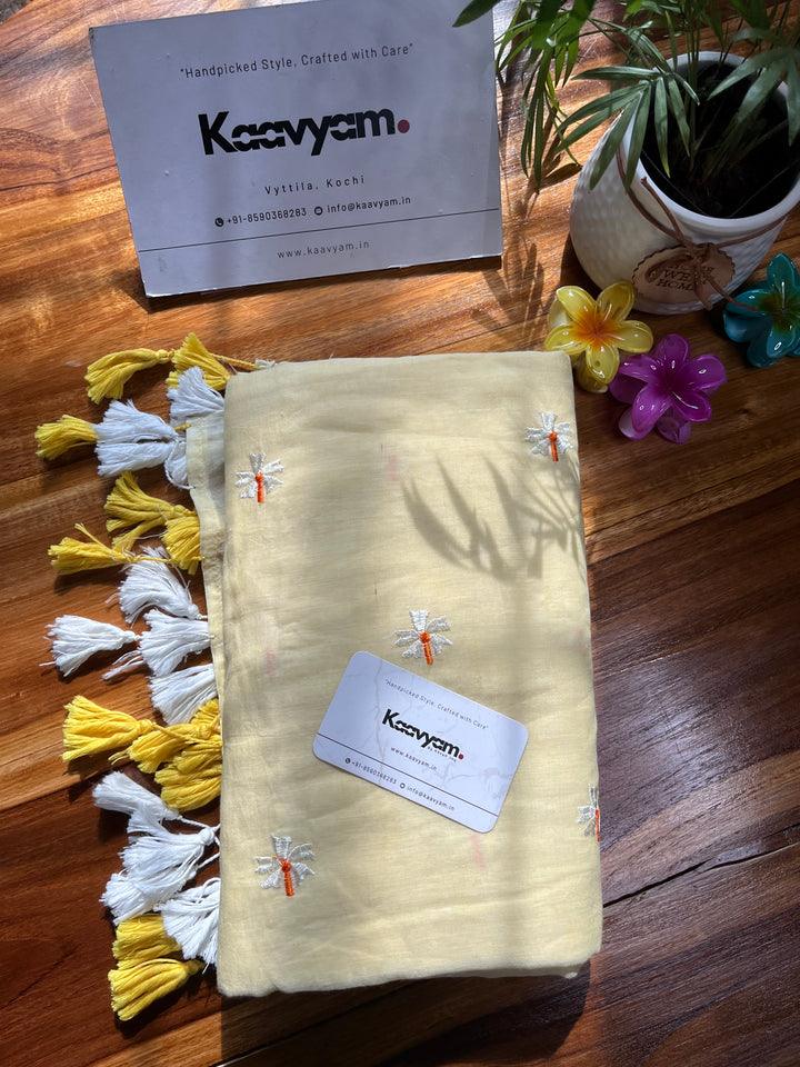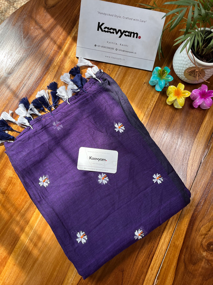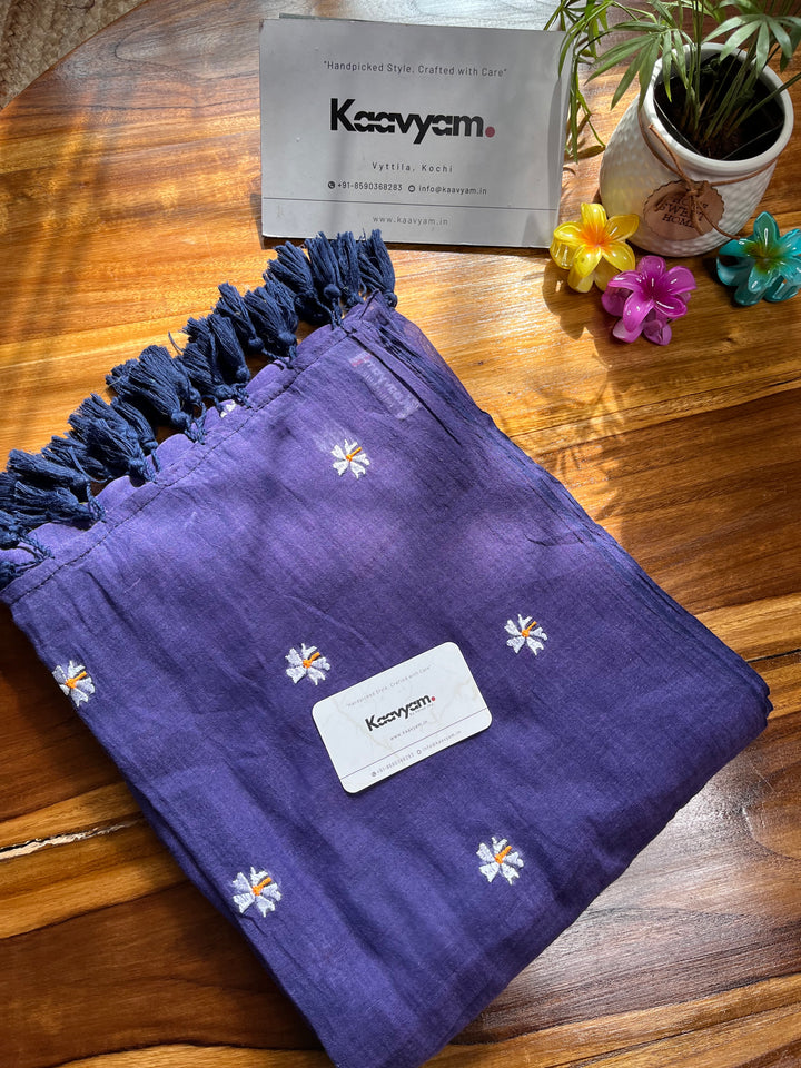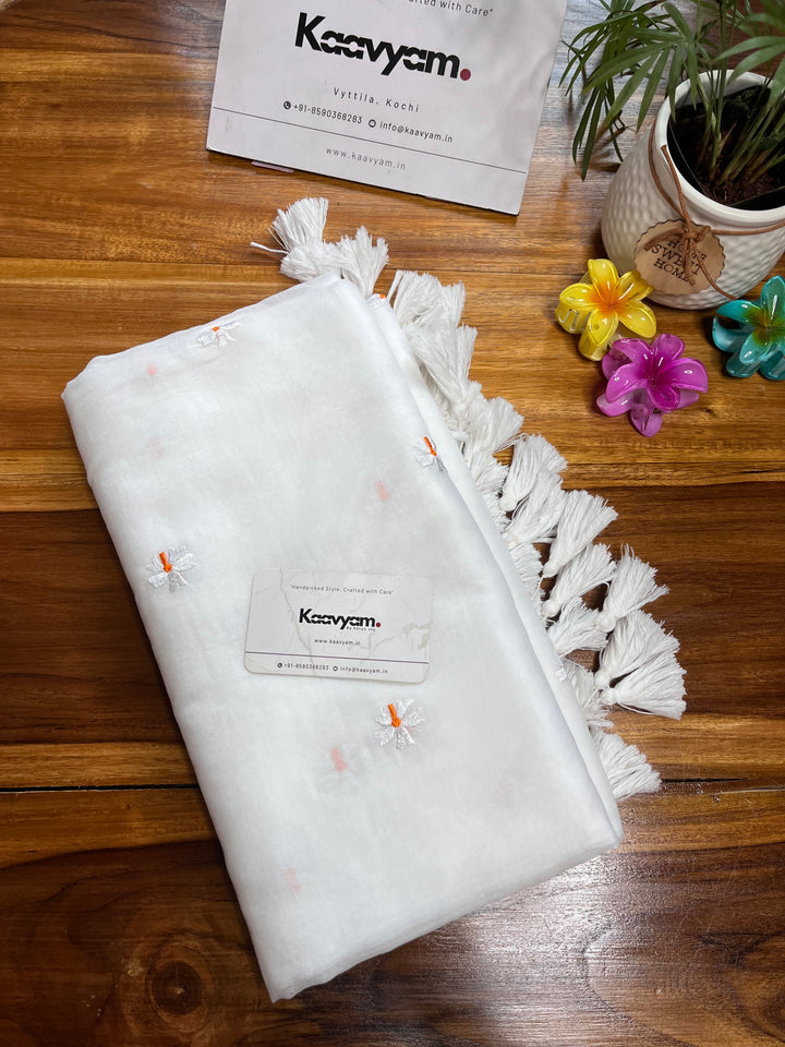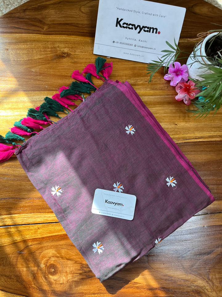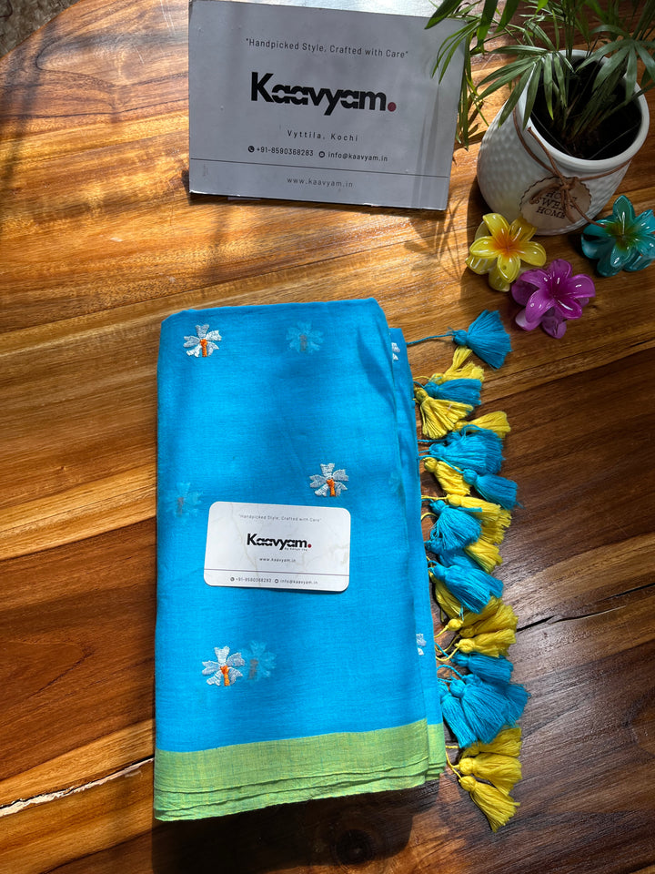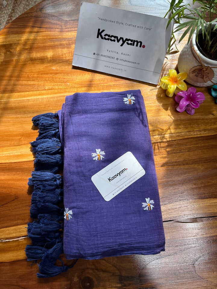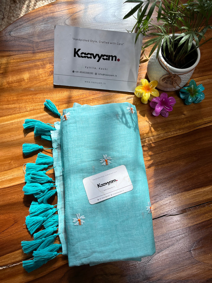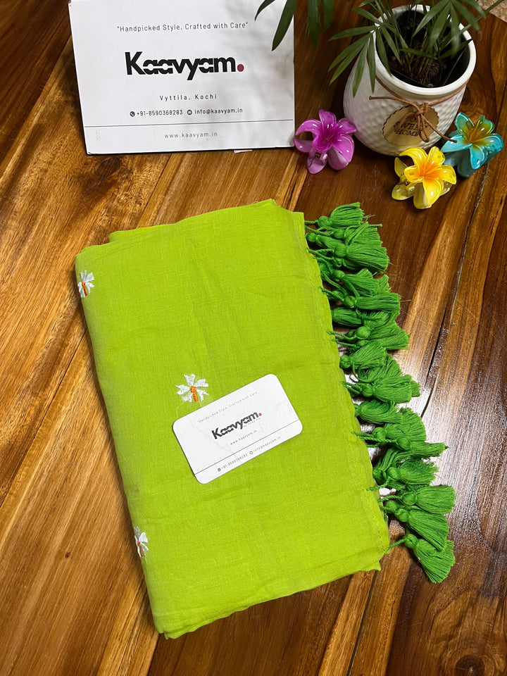Plain color mul cotton saree with mallippoo embroidery all over the saree ended with handmade tassels