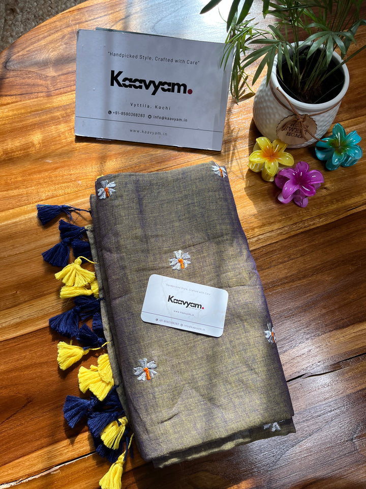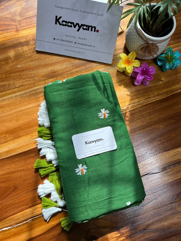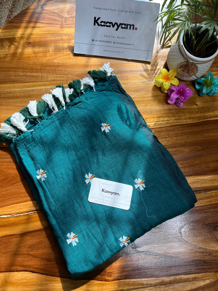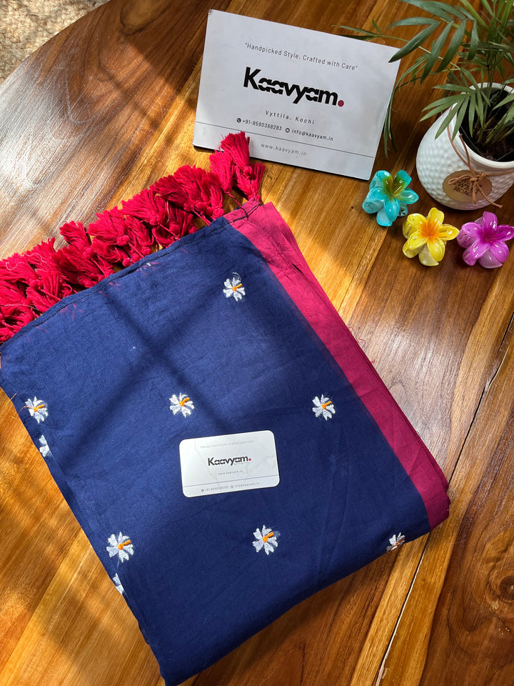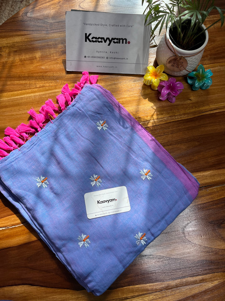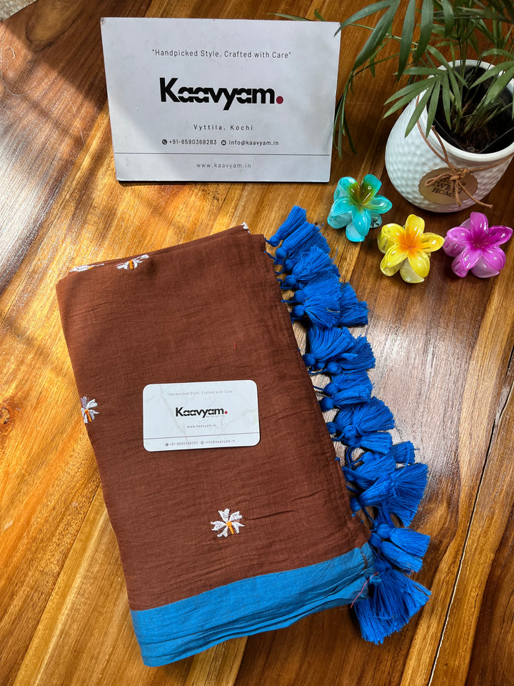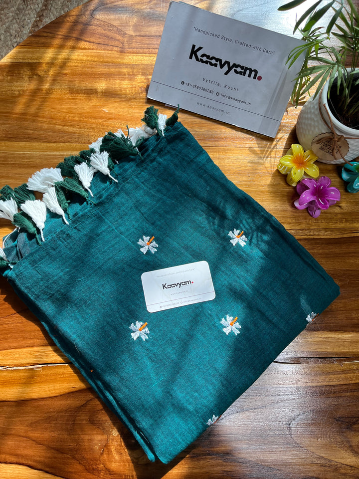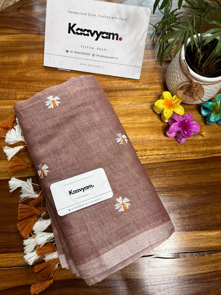 Plain color mul cotton saree with mallippoo embroidery all over the saree ended with handmade tassels