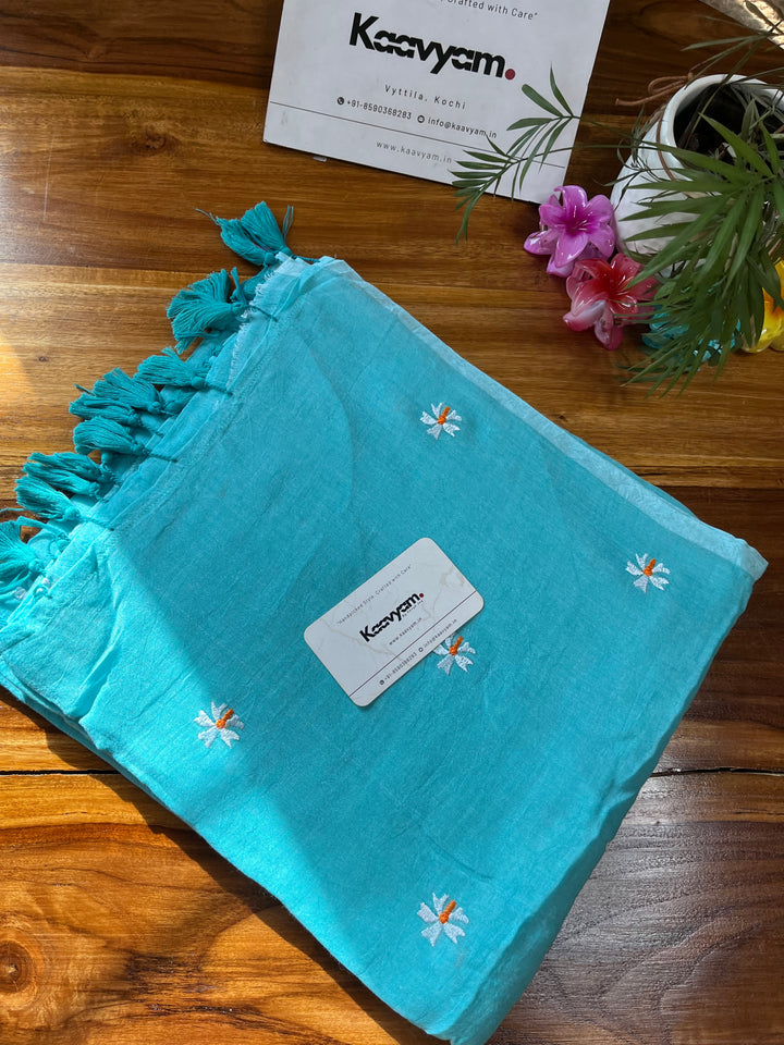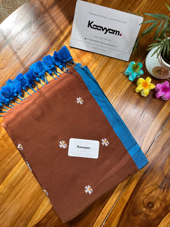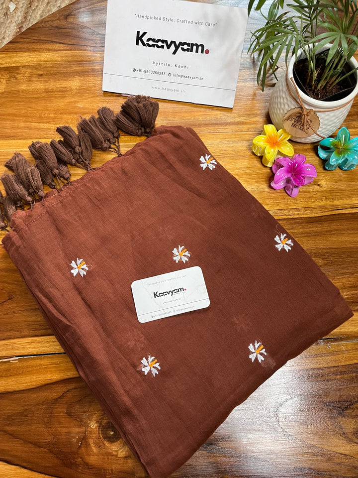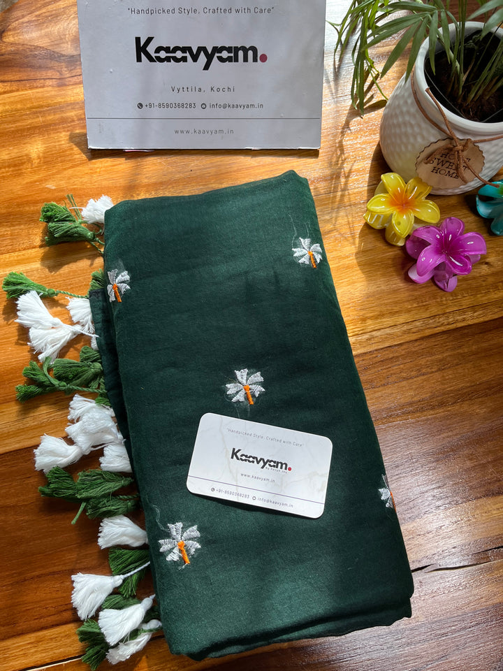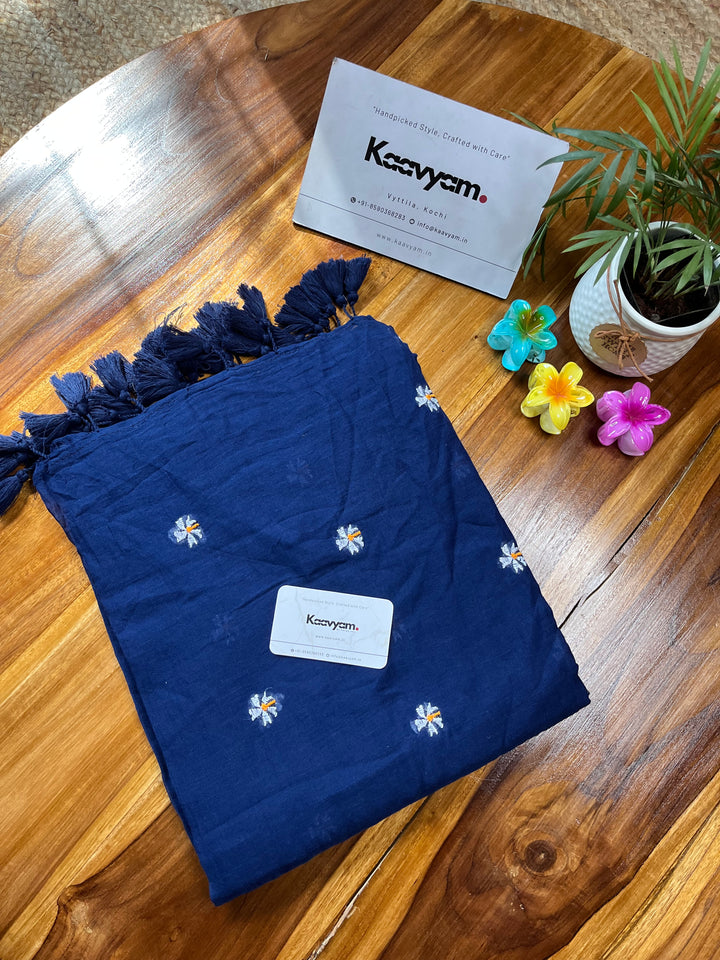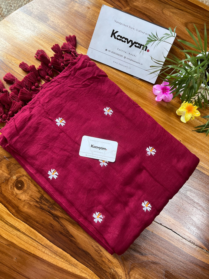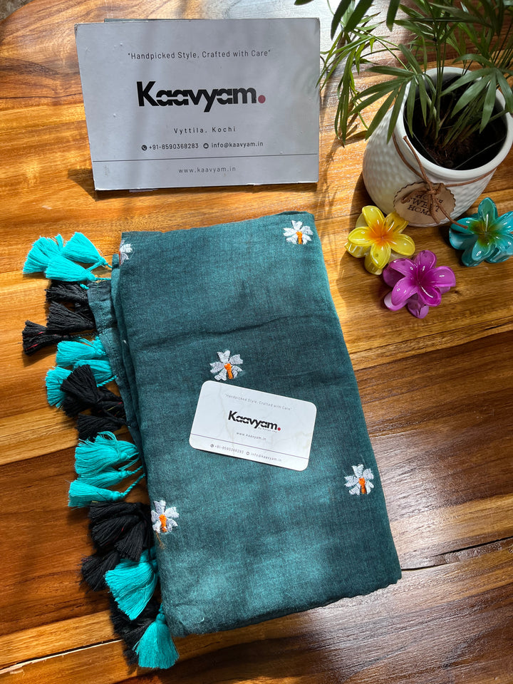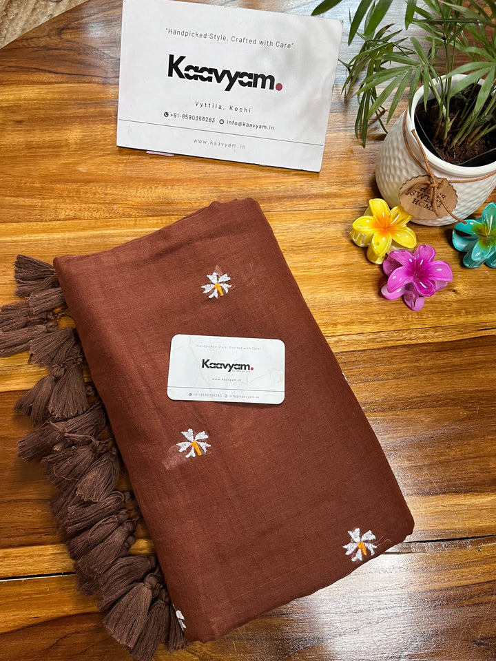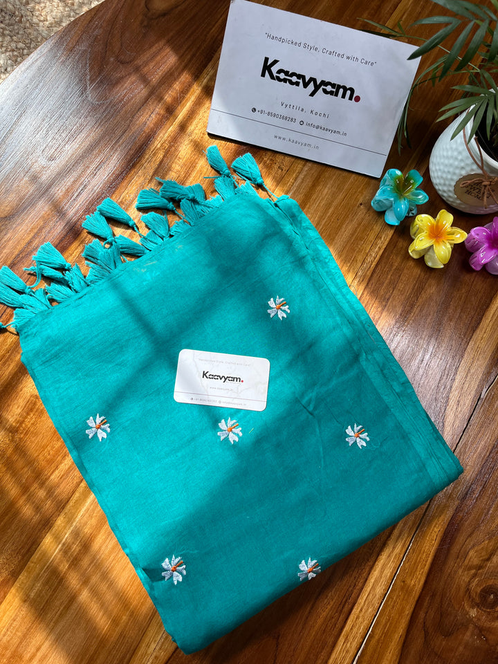 Plain color mul cotton saree with mallippoo embroidery all over the saree ended with handmade tassels
