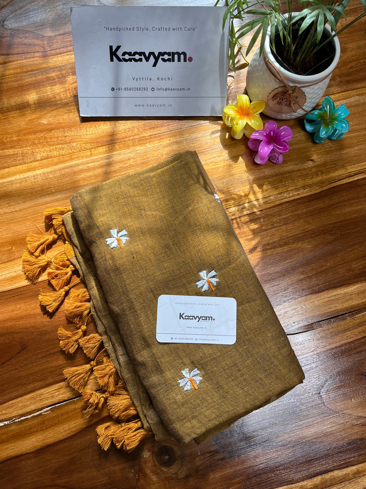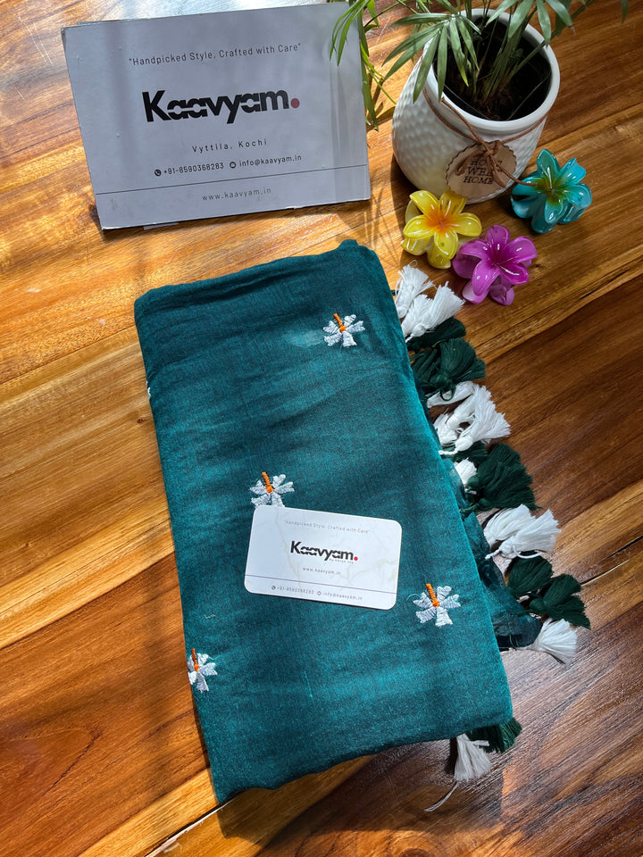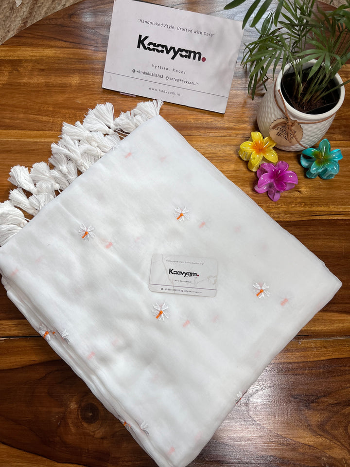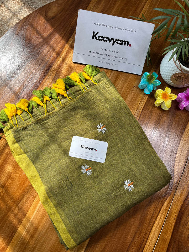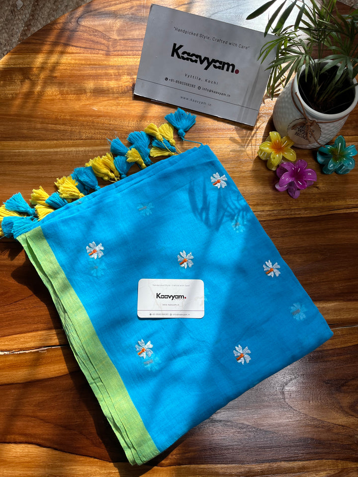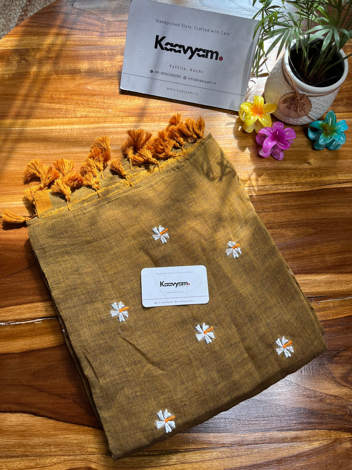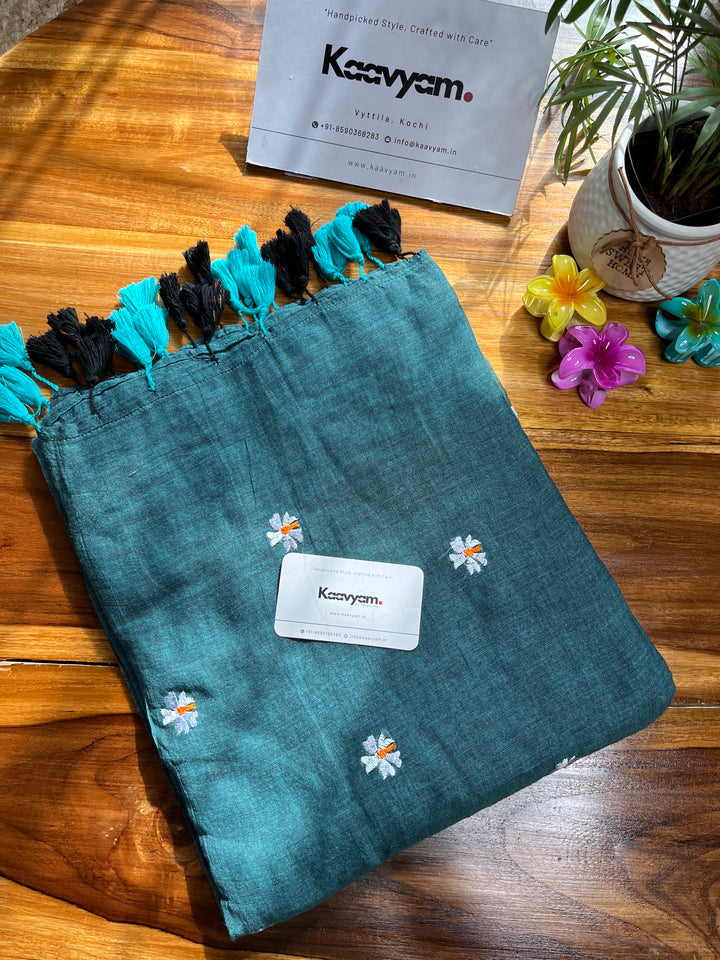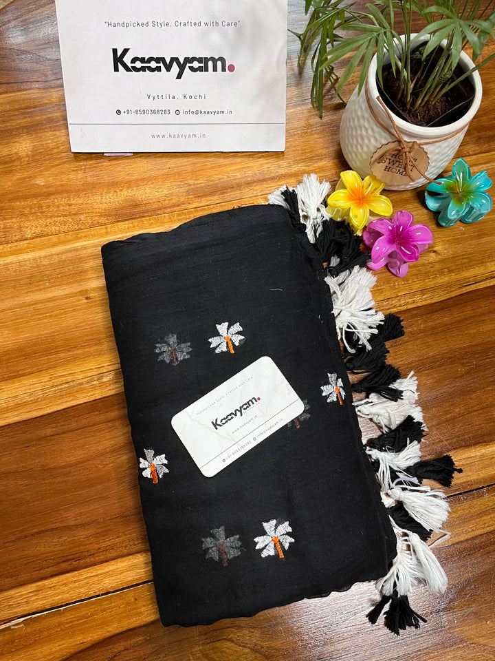 Plain color mul cotton saree with mallippoo embroidery all over the saree ended with handmade tassels