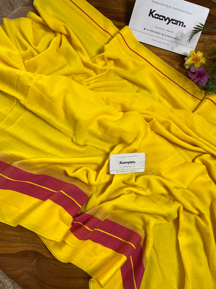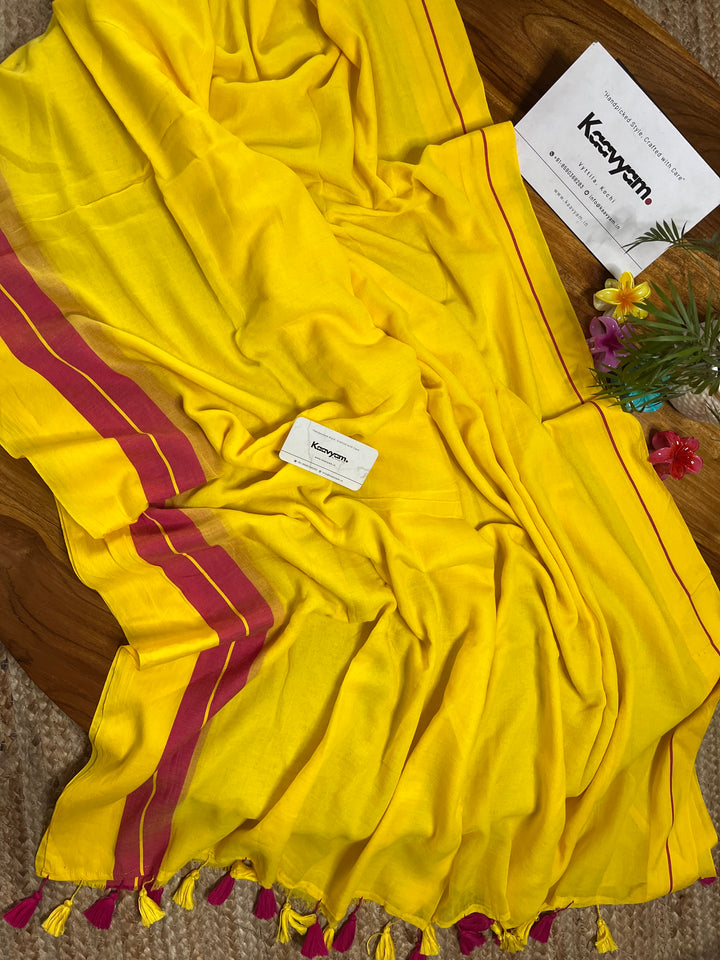 Yellow plain color mul cotton saree with contrast pink borders all over the saree ended with handmade tassels on pallu.