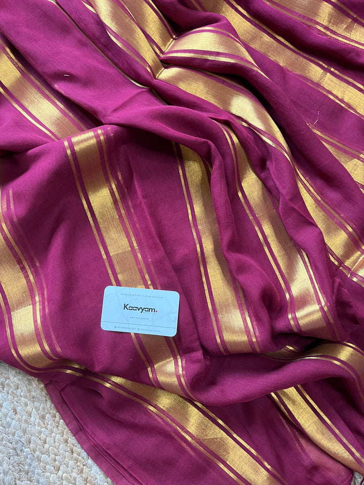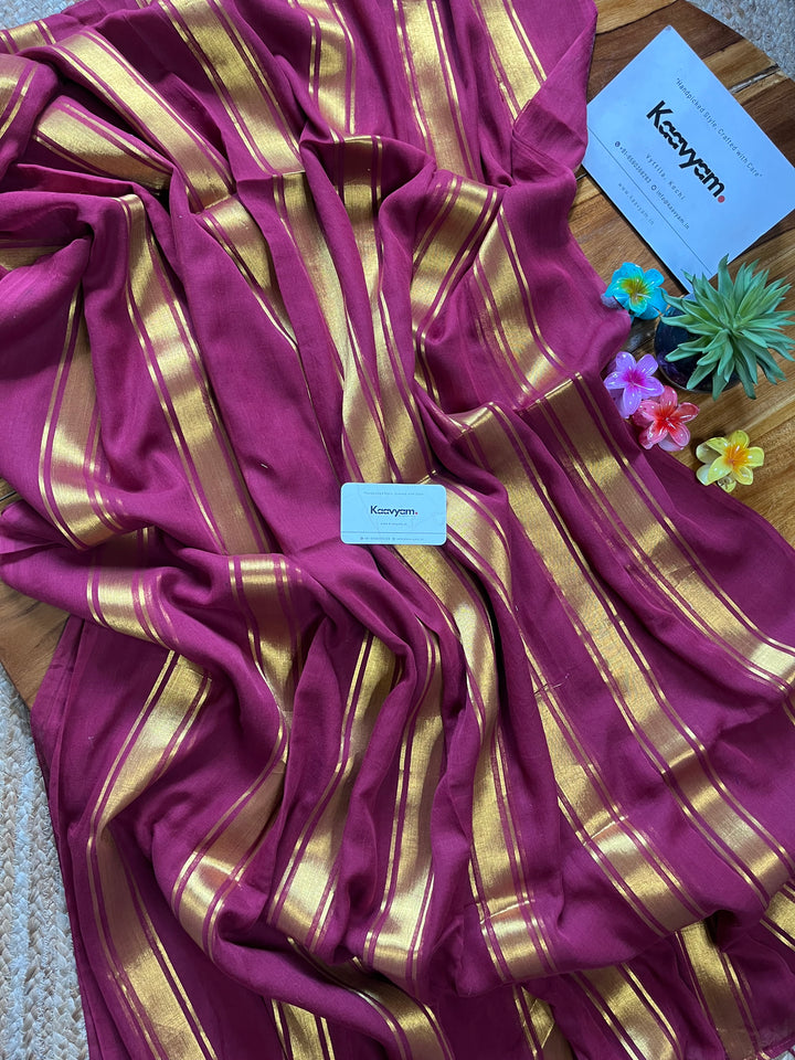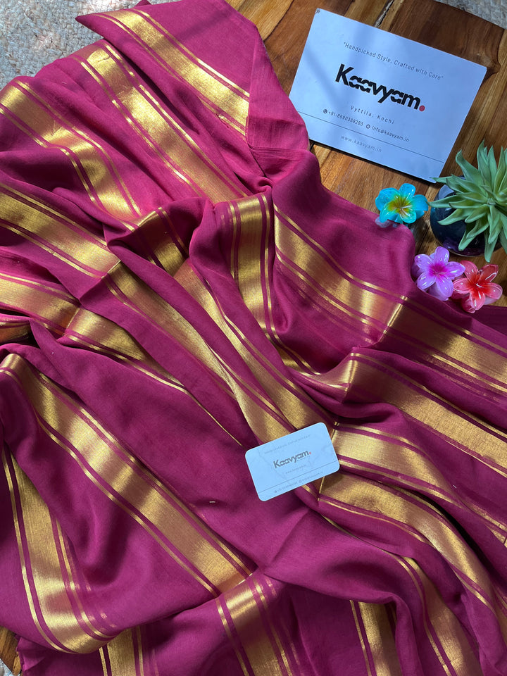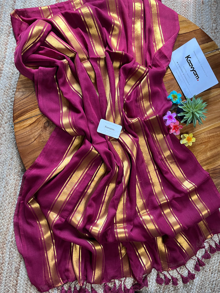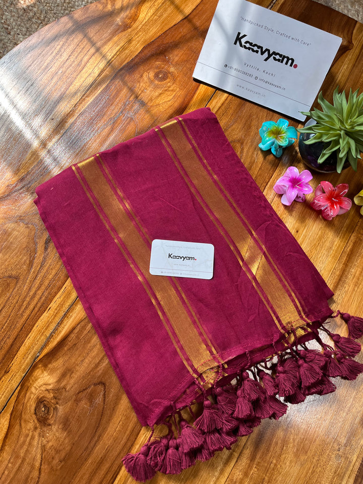 Pure cotton mul mul cotton maroon saree with golden jari woven stripes all over the saree ended with handmade tassels on pallu