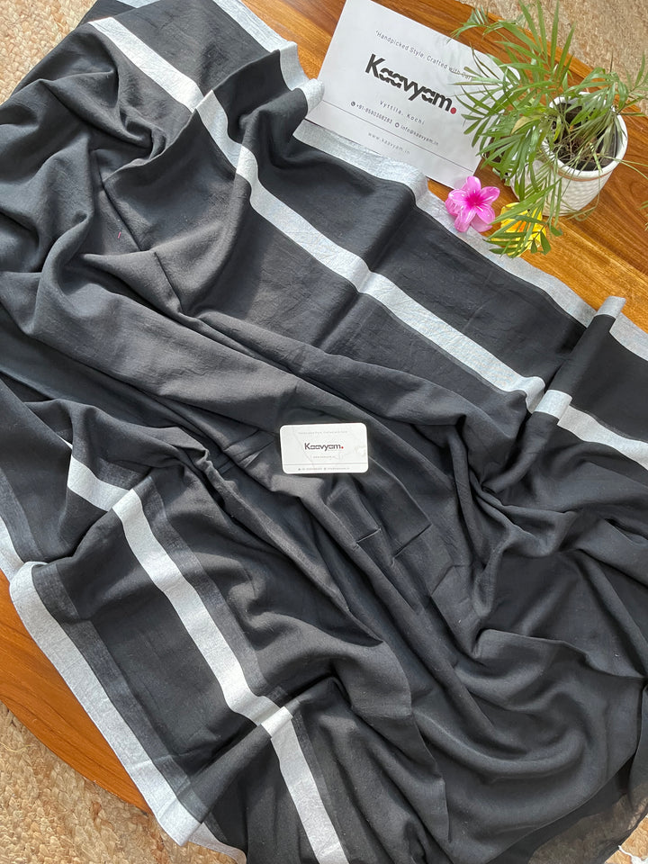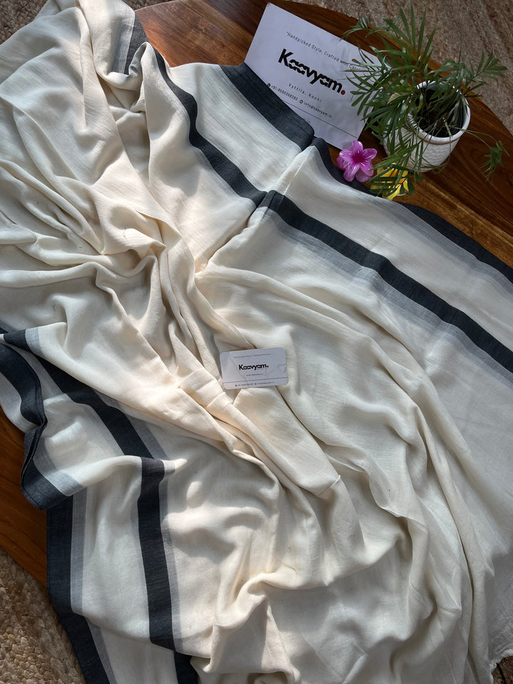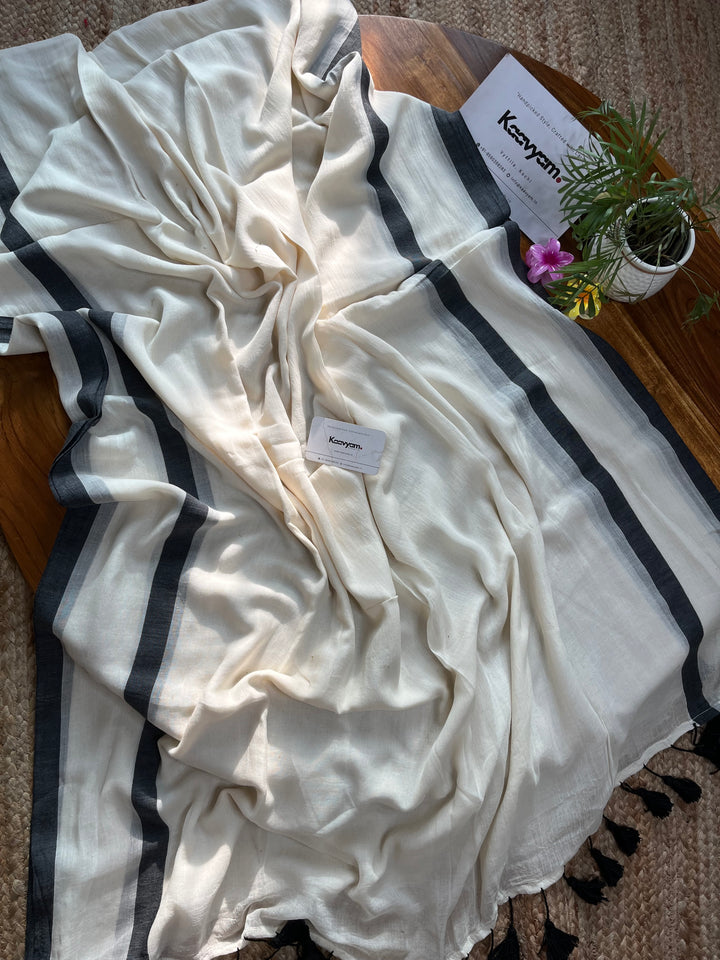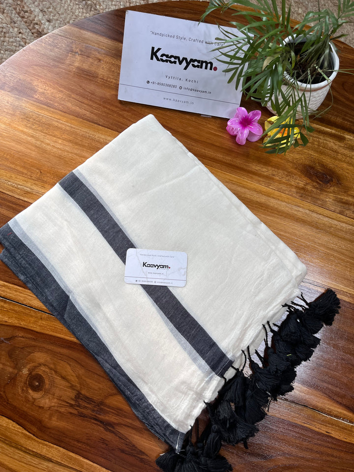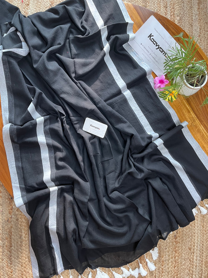 Pure cotton 120 count mul mul cotton with contrast double kara border all over the saree ended with handmade tassels on pallu