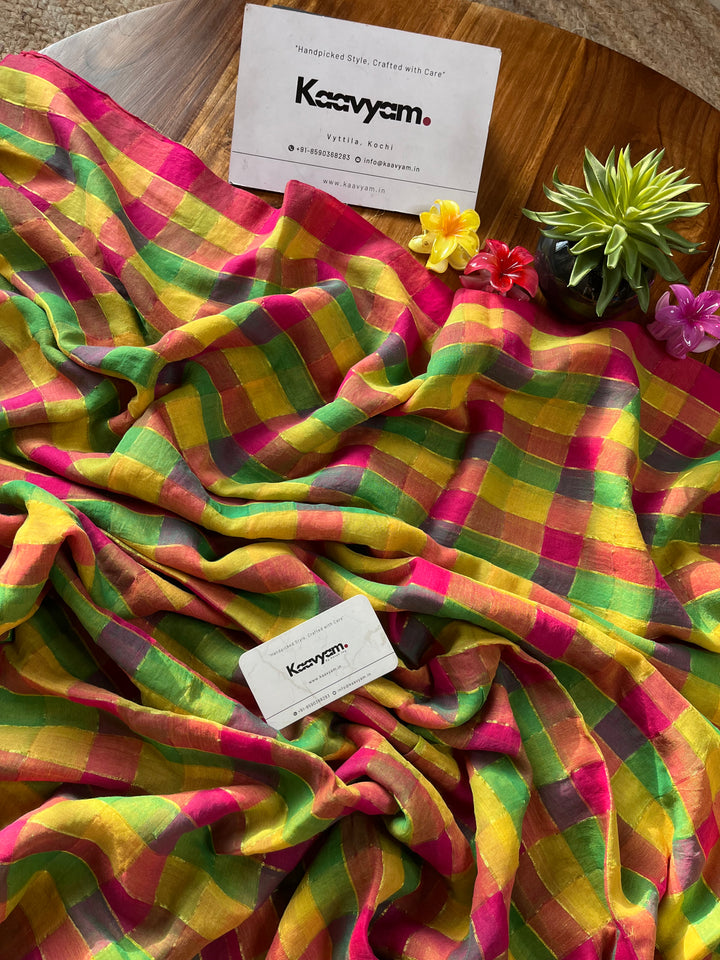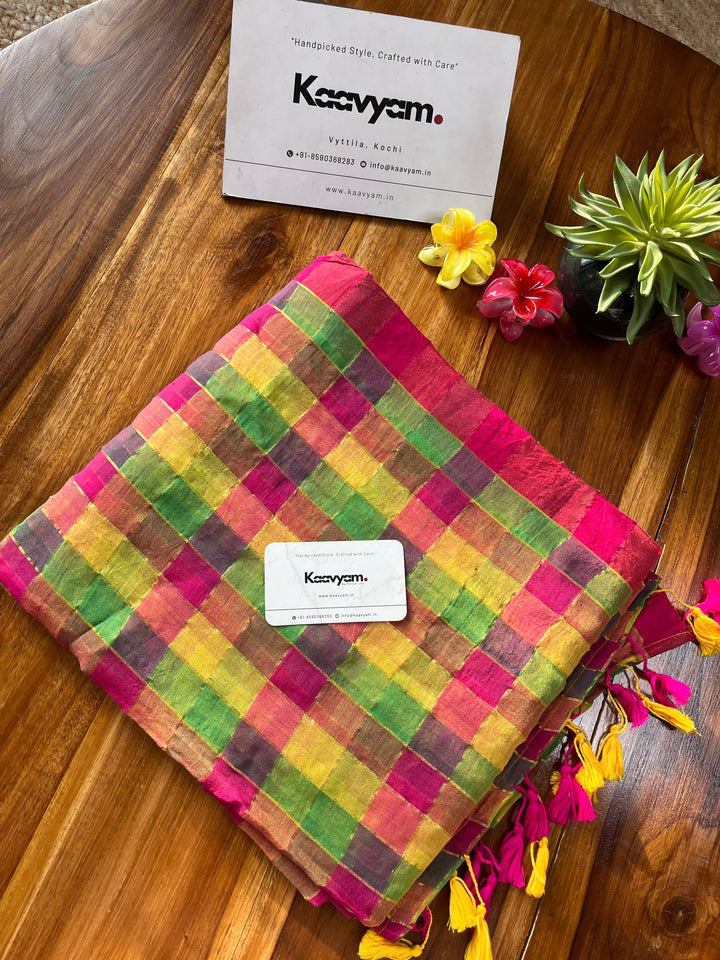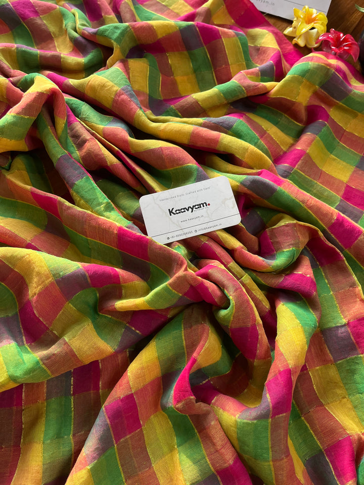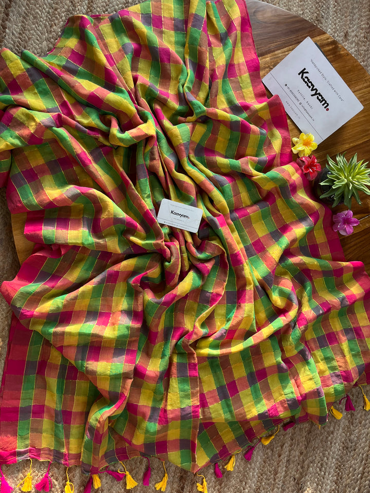 Multicolor checks saree along with golden zari woven checks all over the saree ended with handmade tassels on pallu.