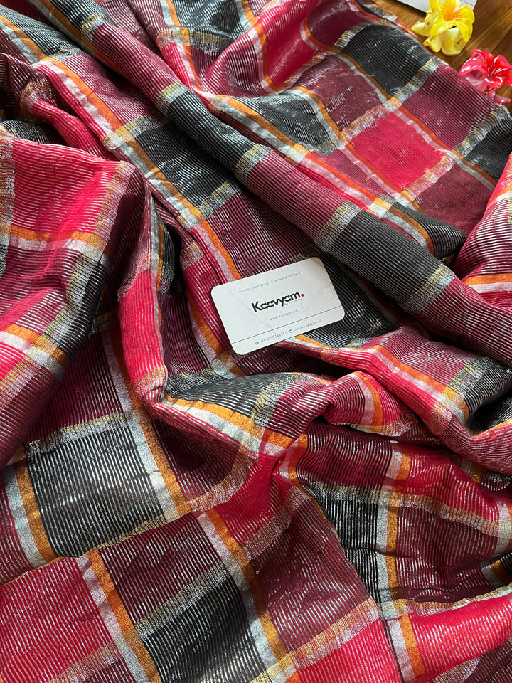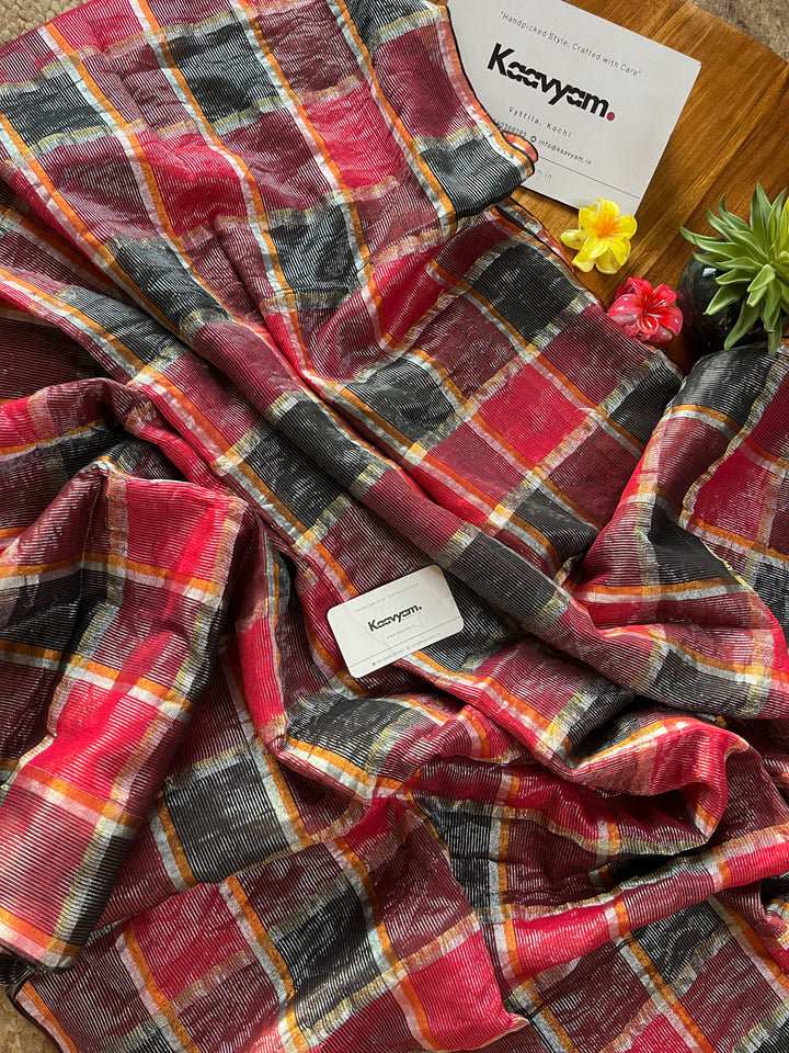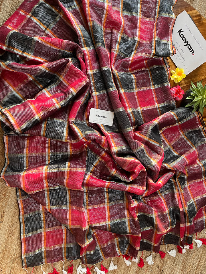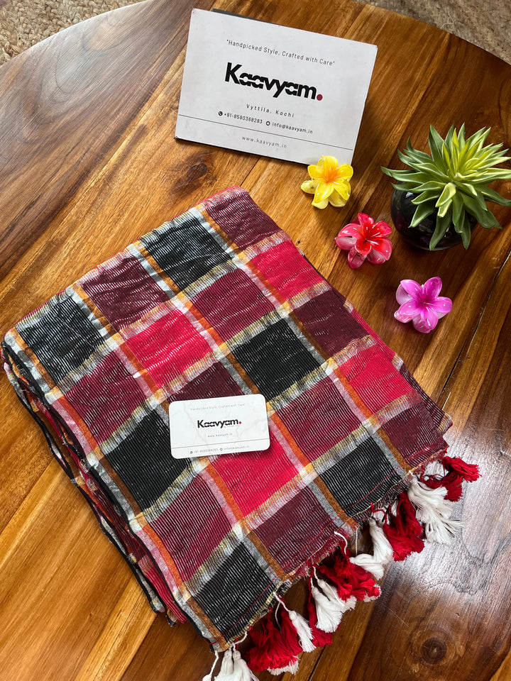Multicolor checks saree along with silver zari woven checks all over the saree ended with handmade tassels on pallu.
