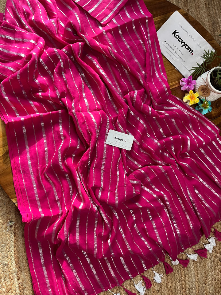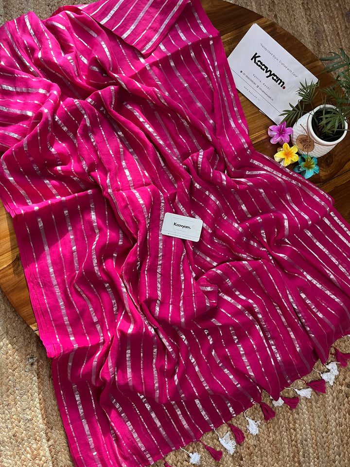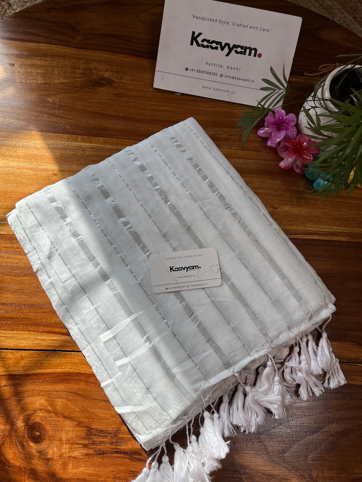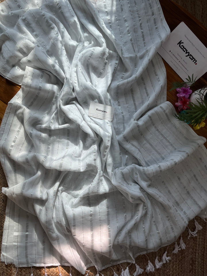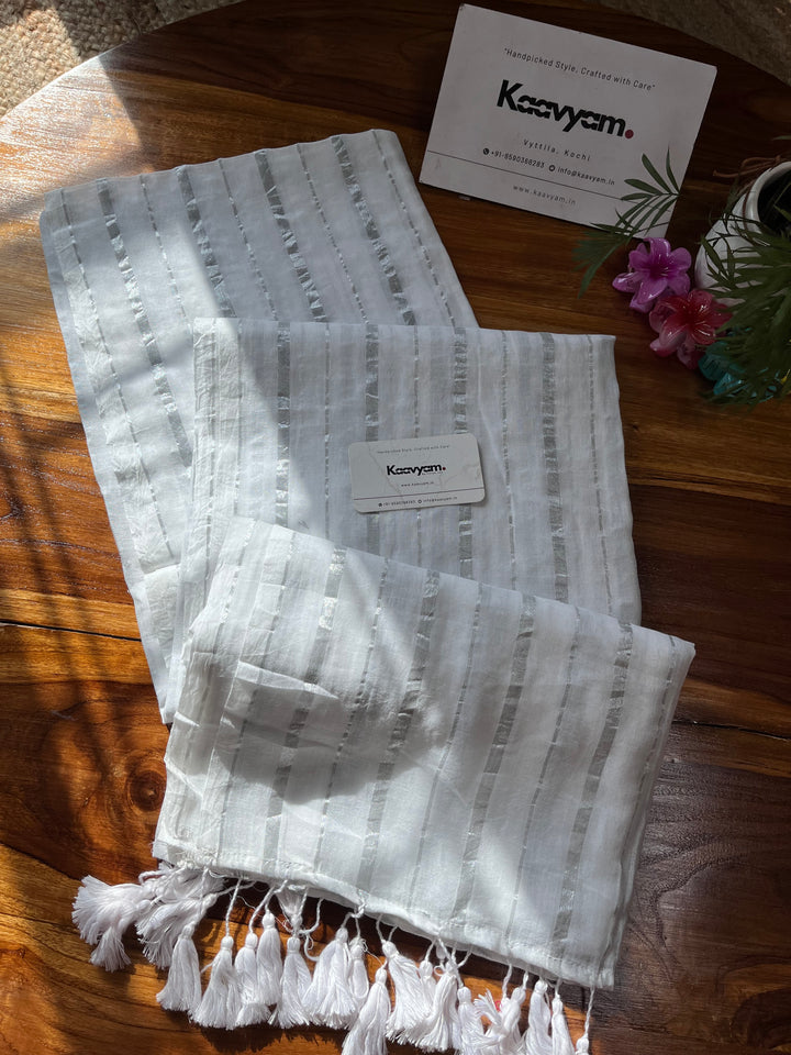 Pure mul cotton saree with rich silver stripes all over the saree ended with handmade tassels on pallu.