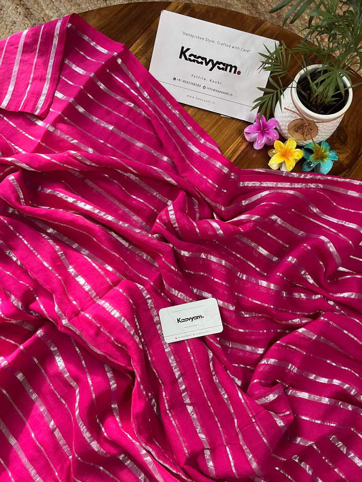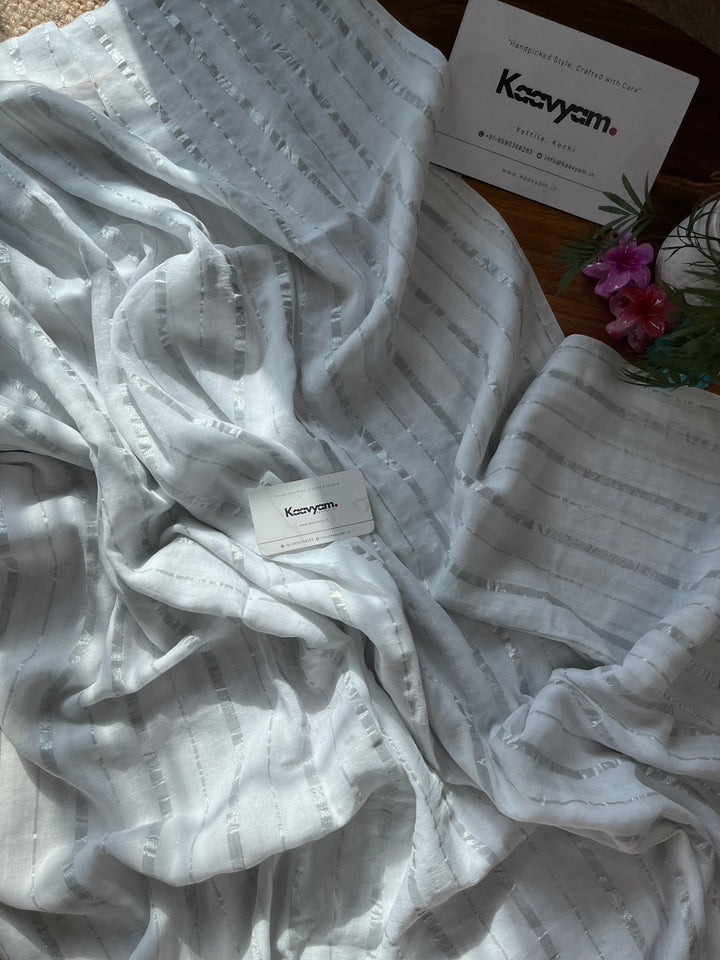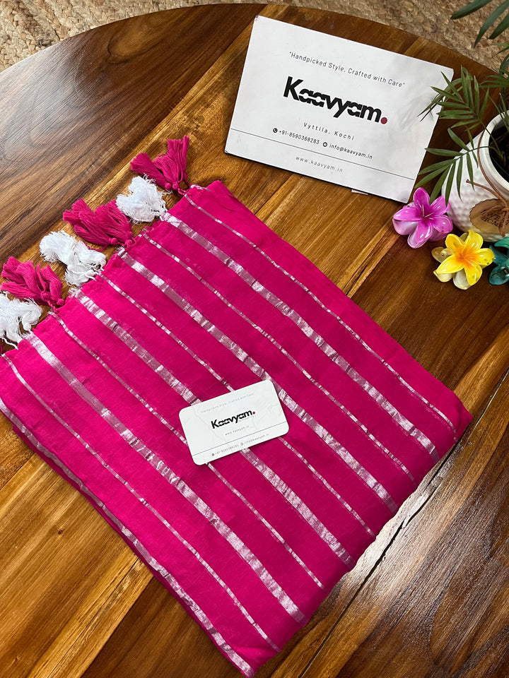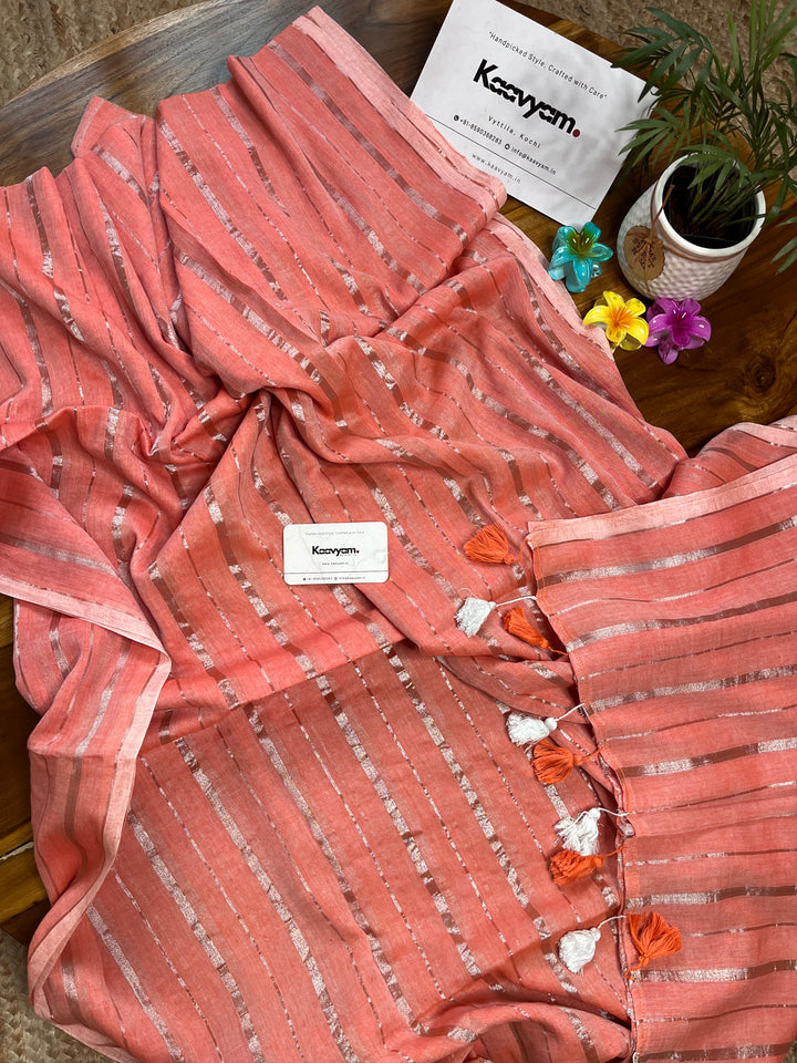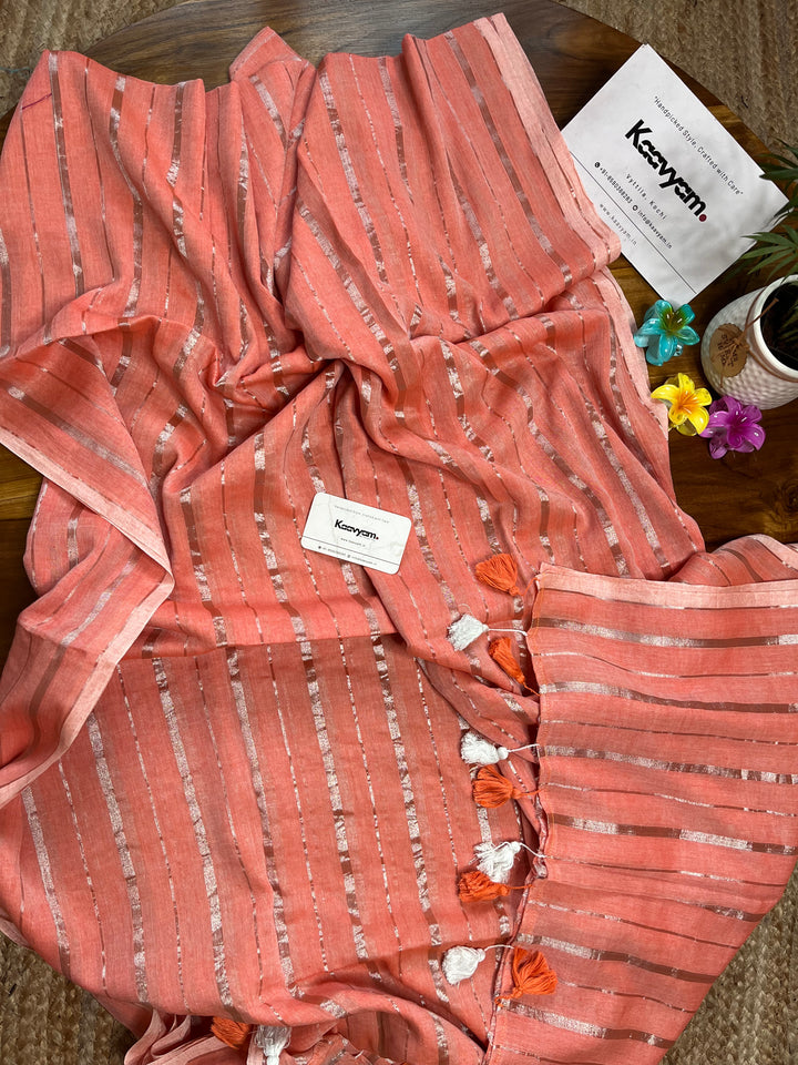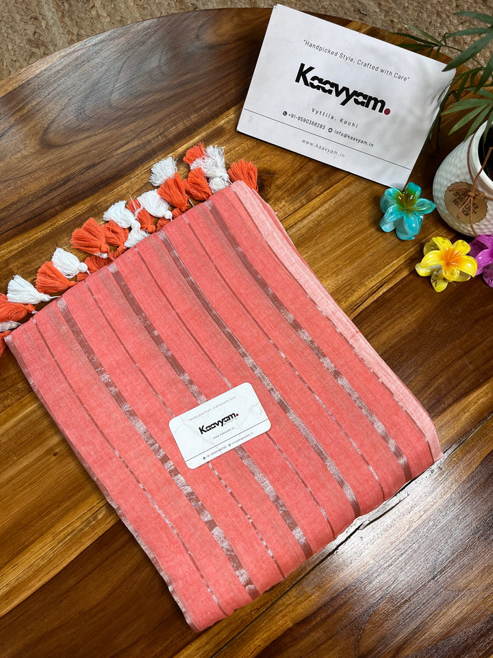 Pure mul cotton saree with rich silver stripes all over the saree ended with handmade tassels on pallu.