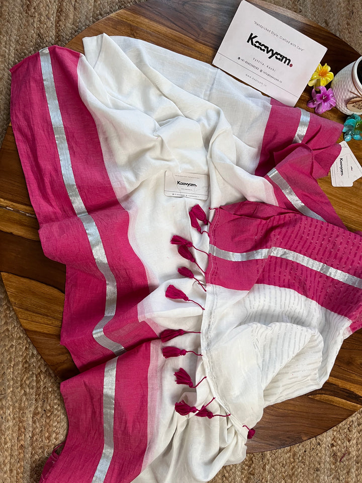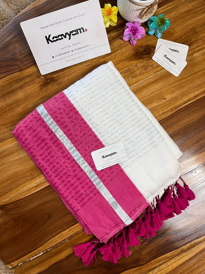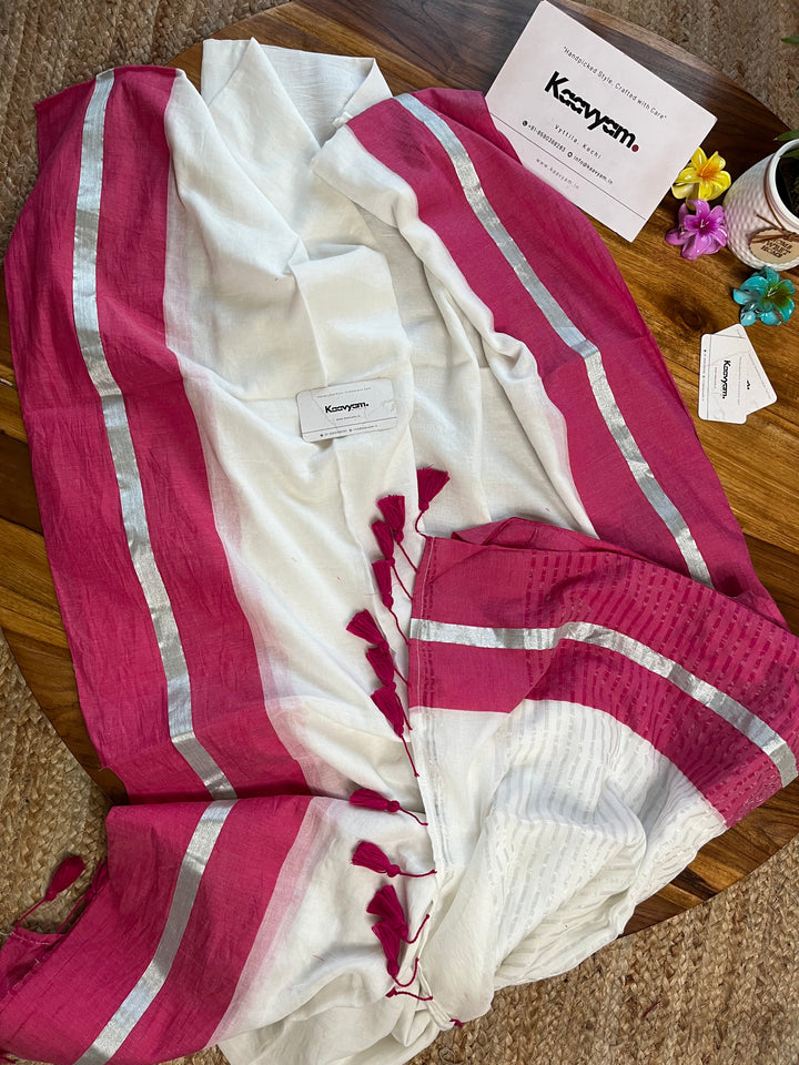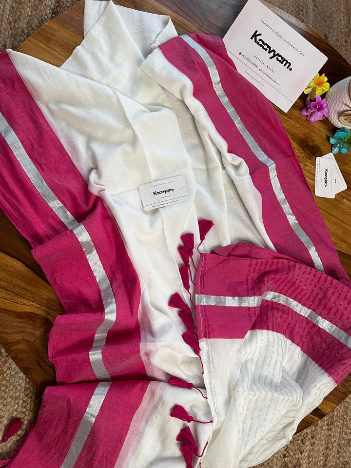 Plain color saree with pink and silver and silver kasav rich border all obver the saree ended with kasav stripes pallu finished with big handmade tassels.
