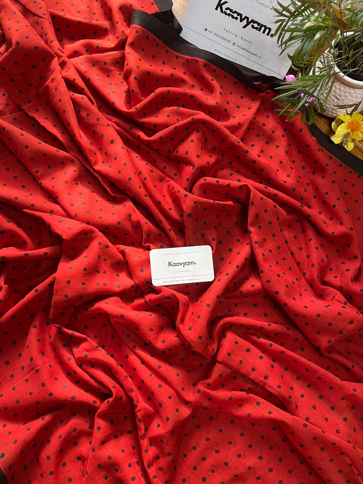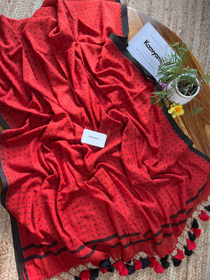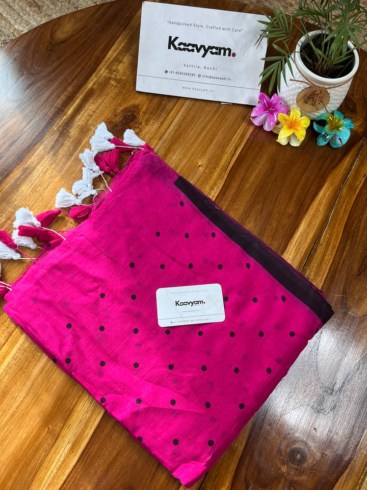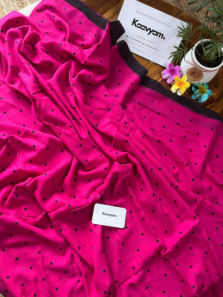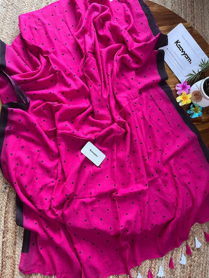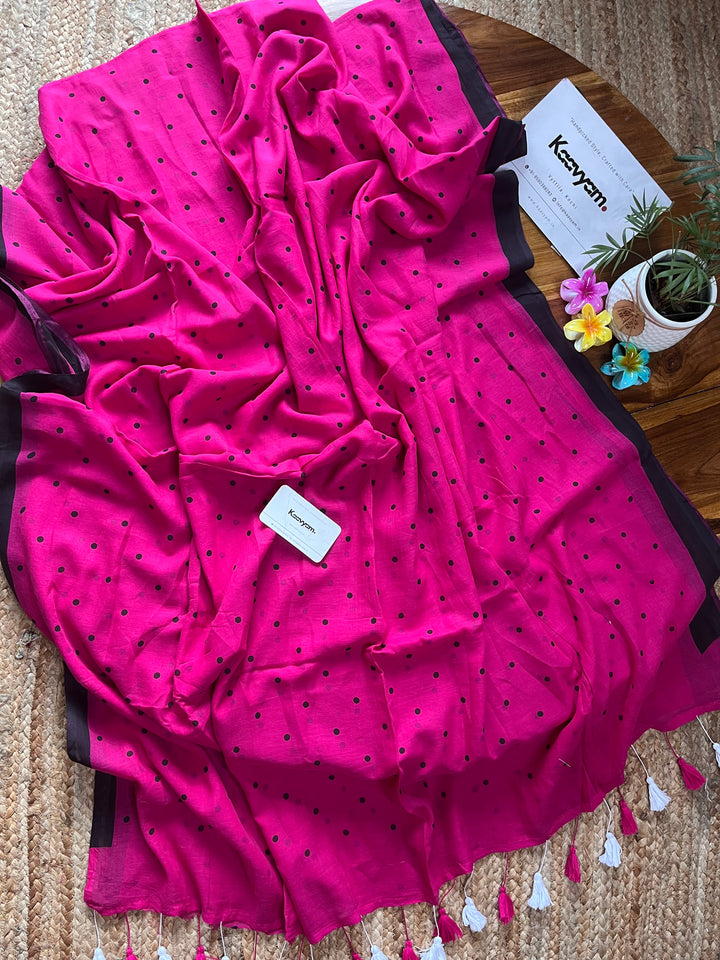 Pure mul cotton saree with polka dot print and contrast half inch contrast kara border all over the saree ended with handmade tassels