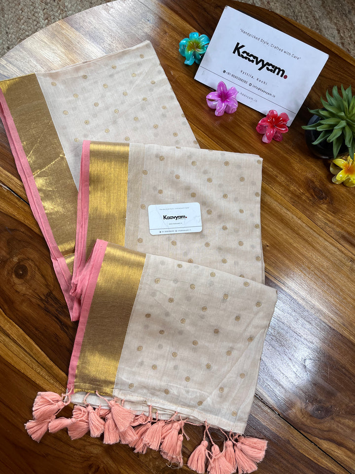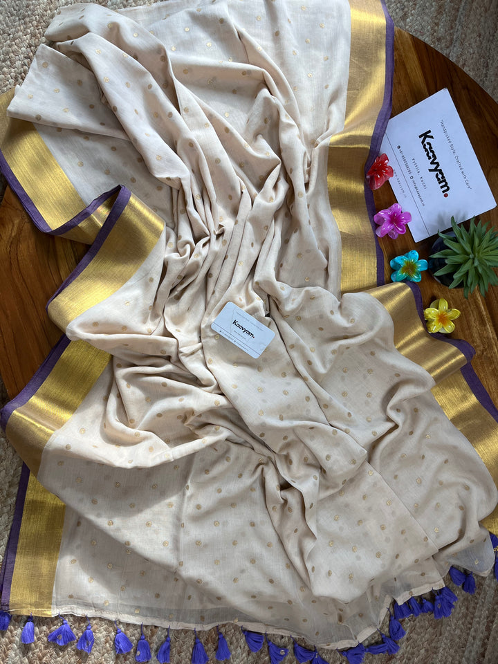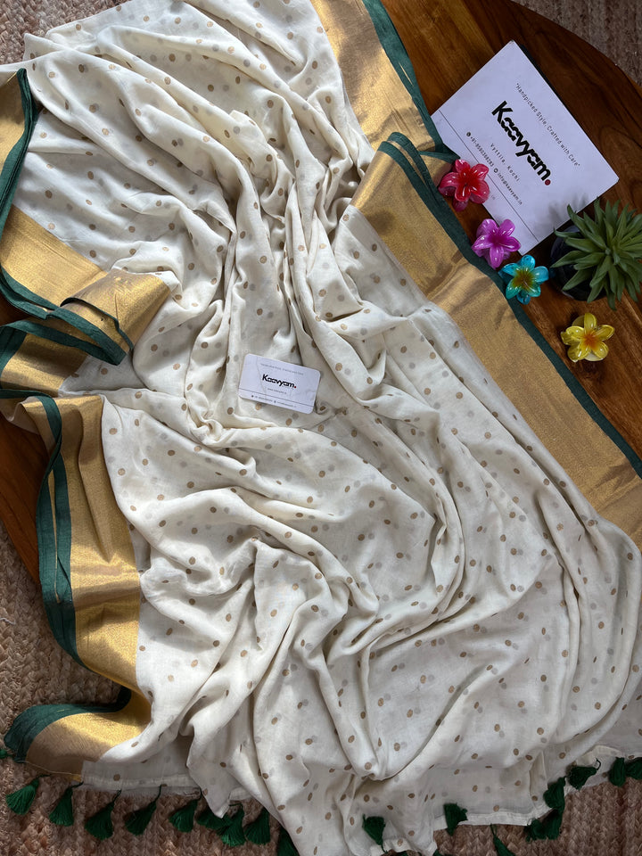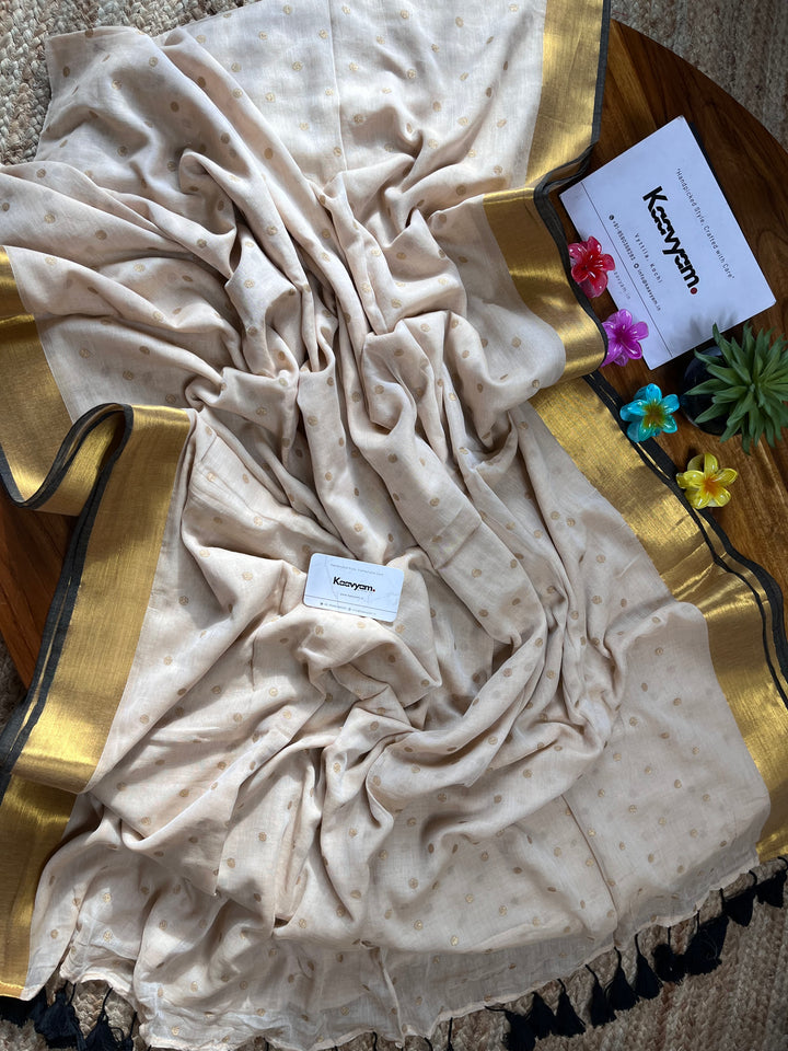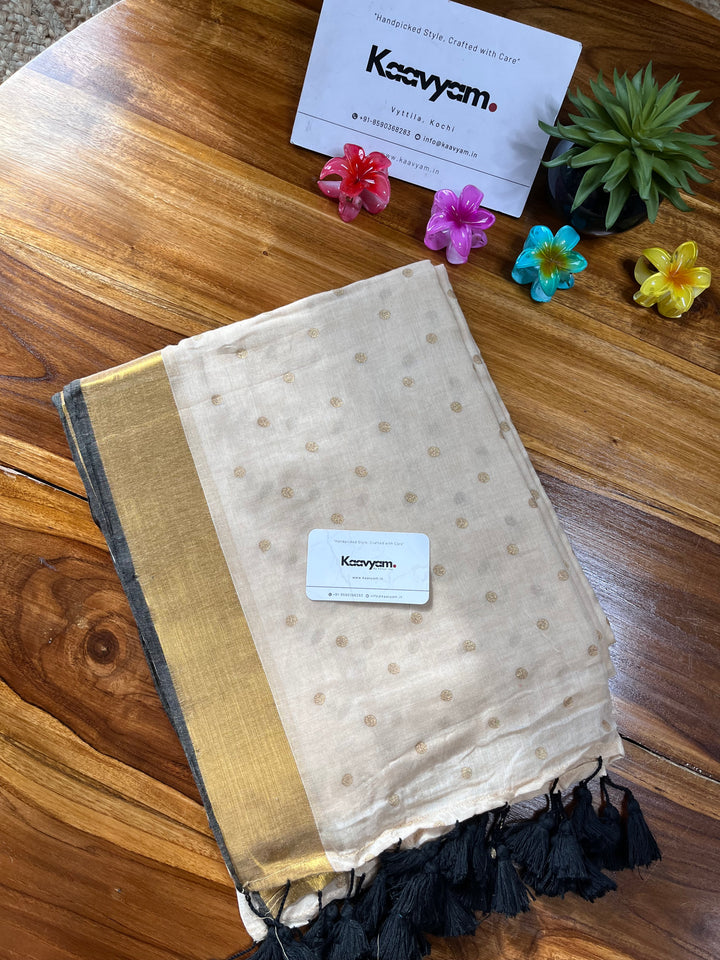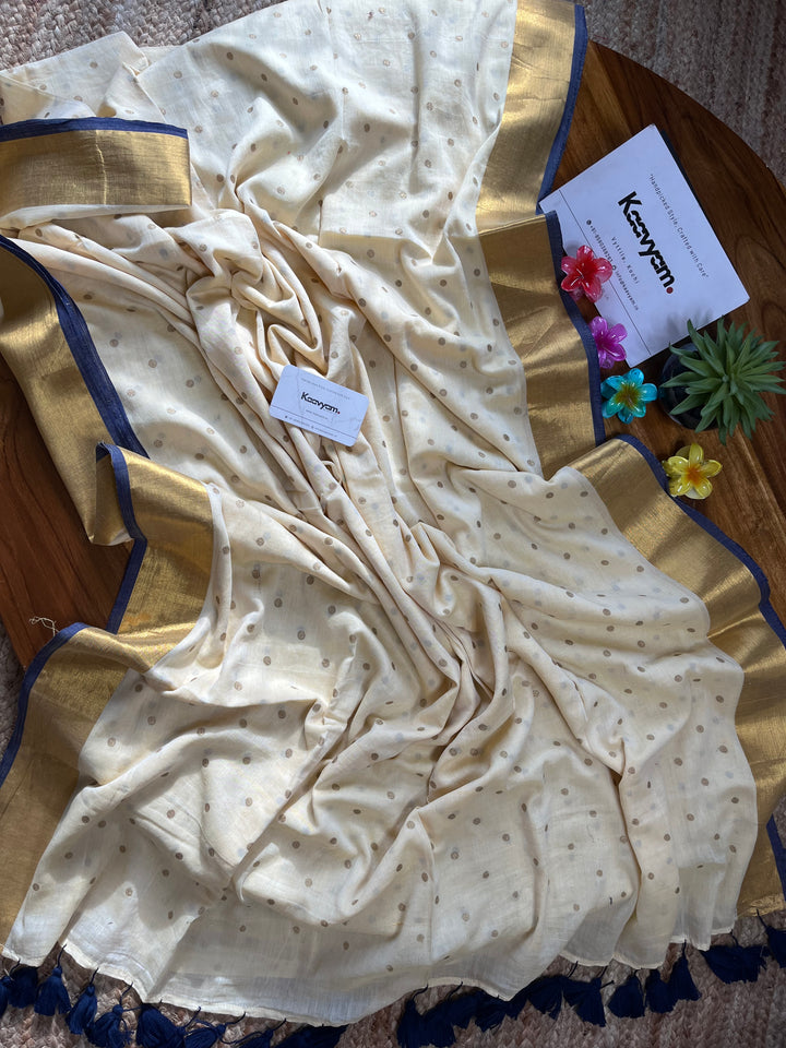 Light weight breathable mul cotton saree with golden polka and kasav and kara border all over the saree ended with finished tassels