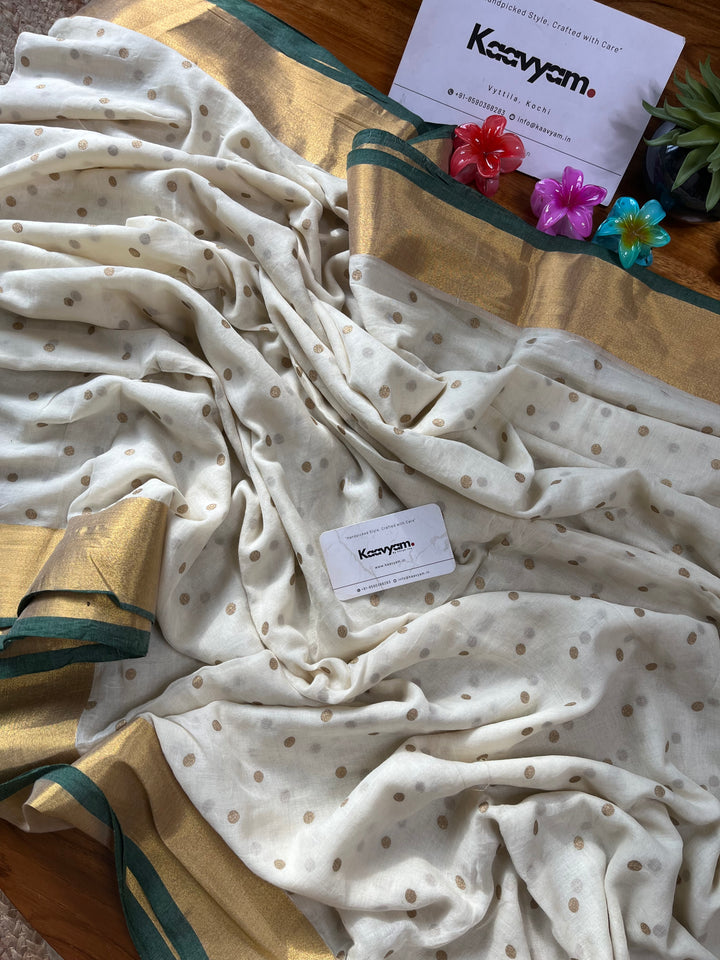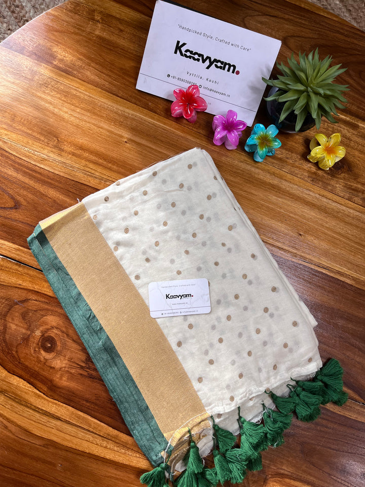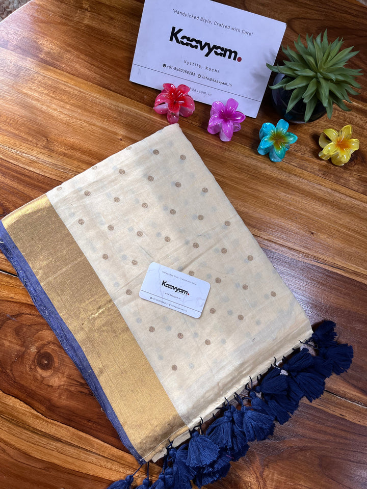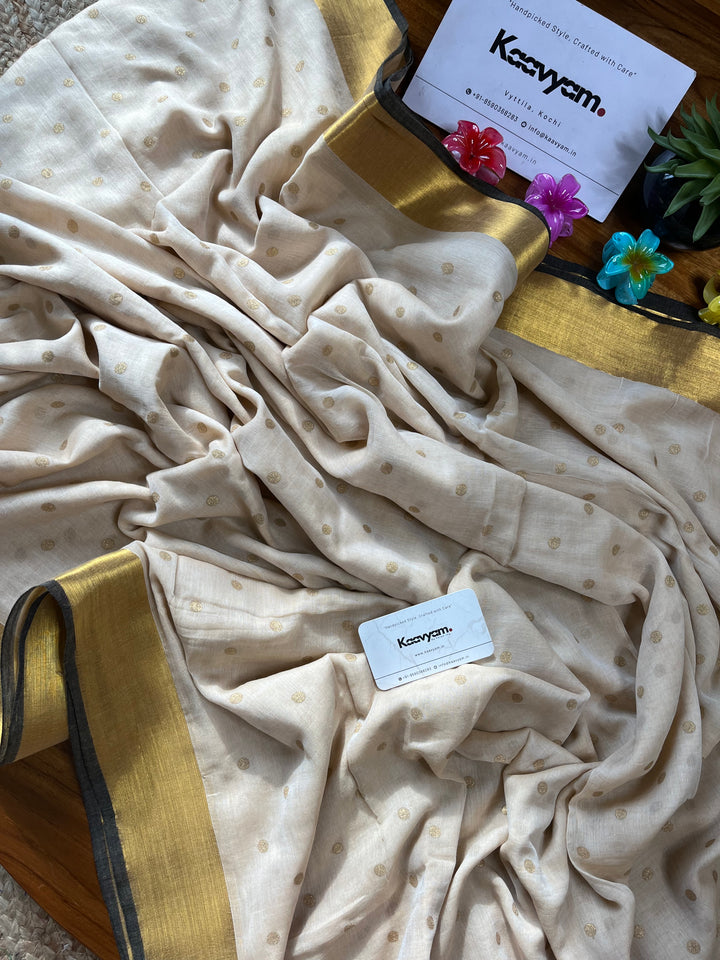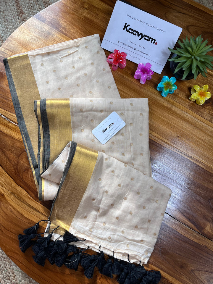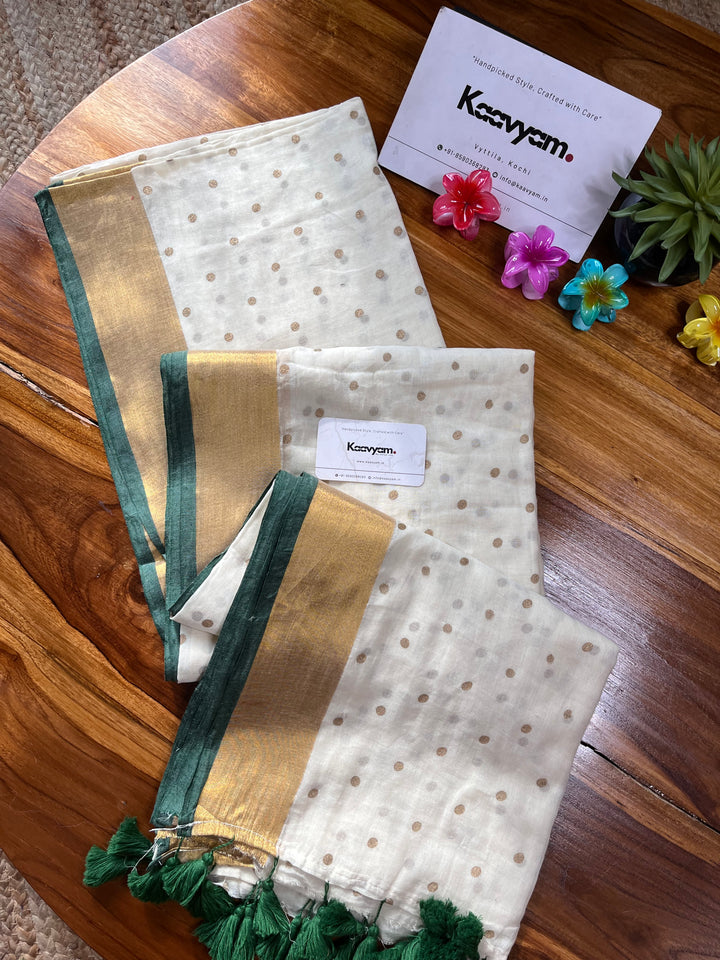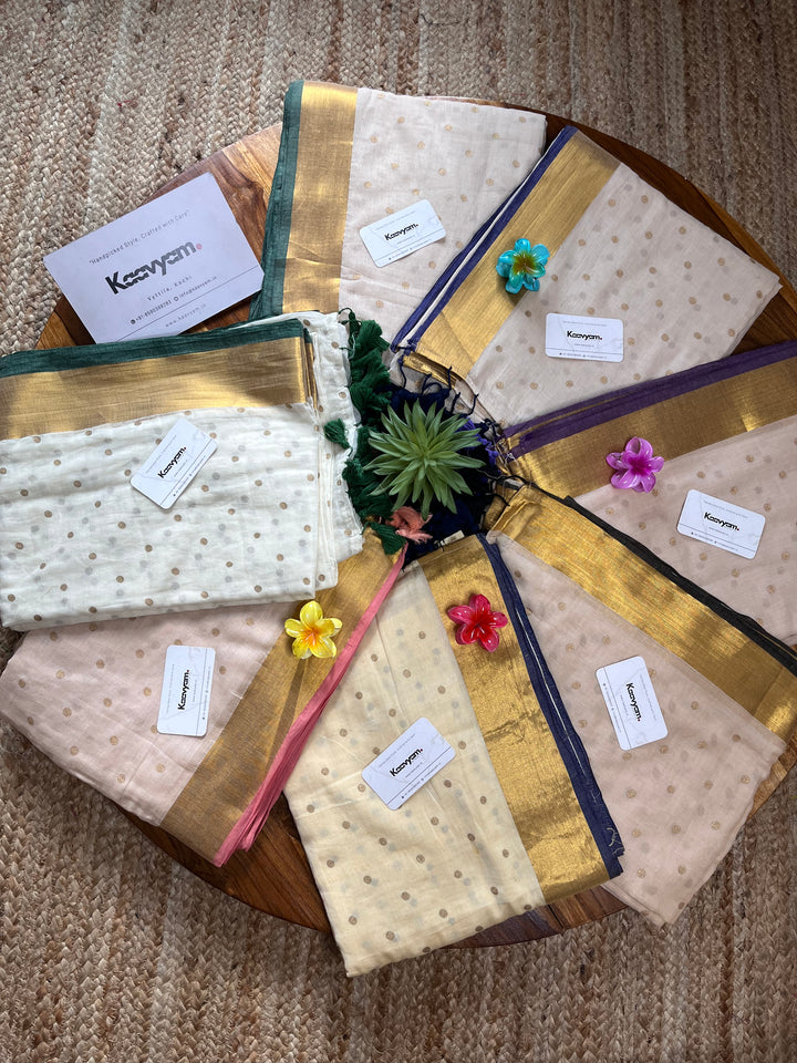 Light weight breathable mul cotton saree with golden polka and kasav and kara border all over the saree ended with finished tassels