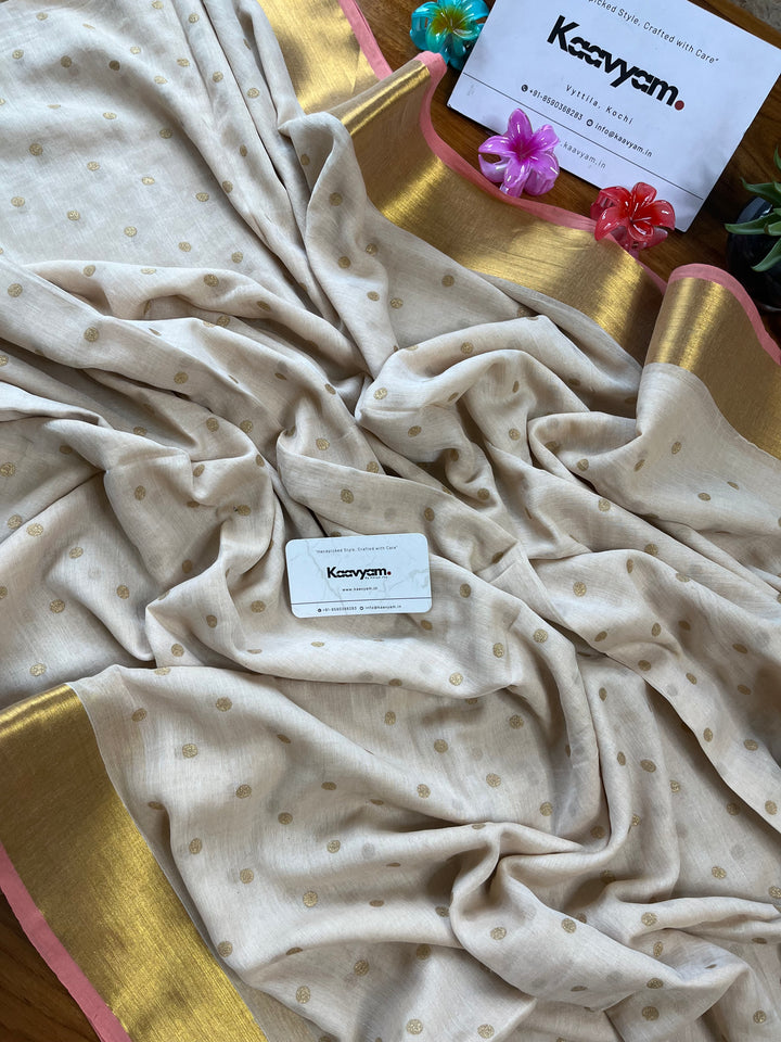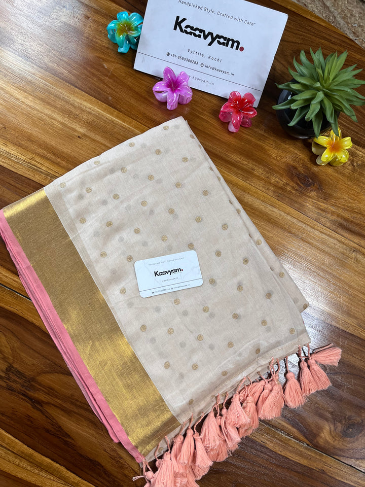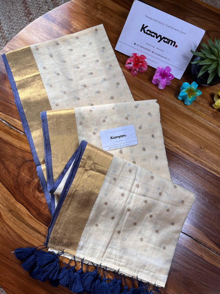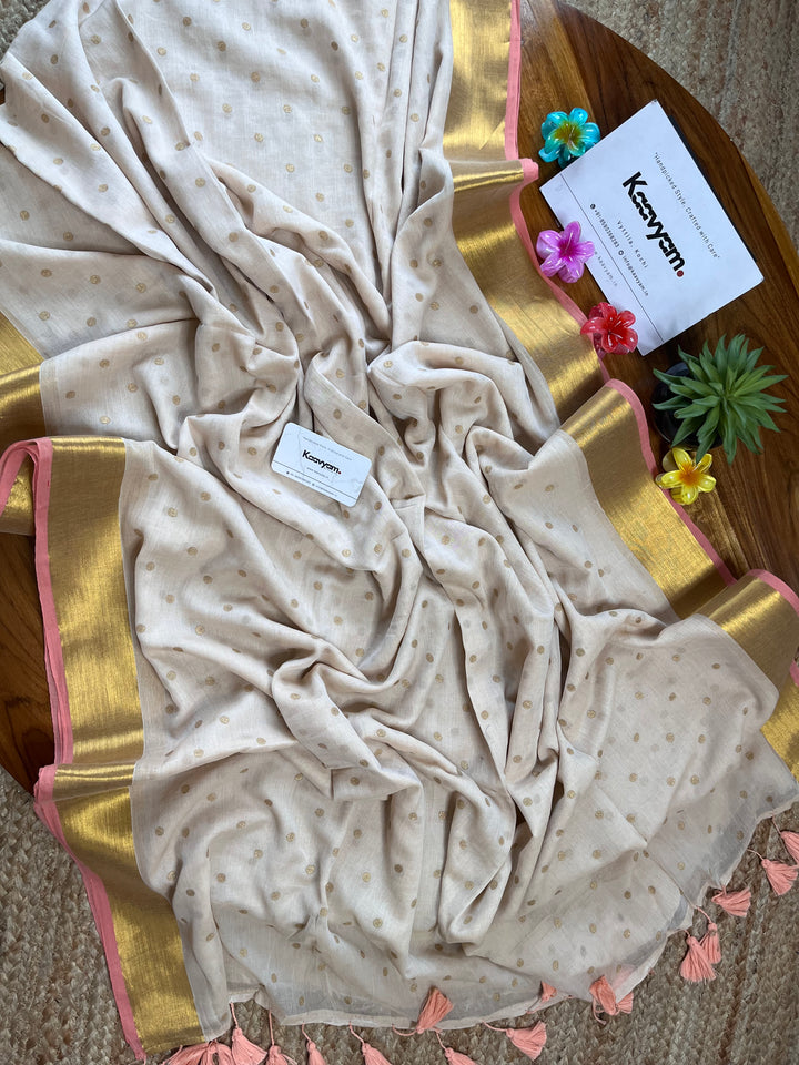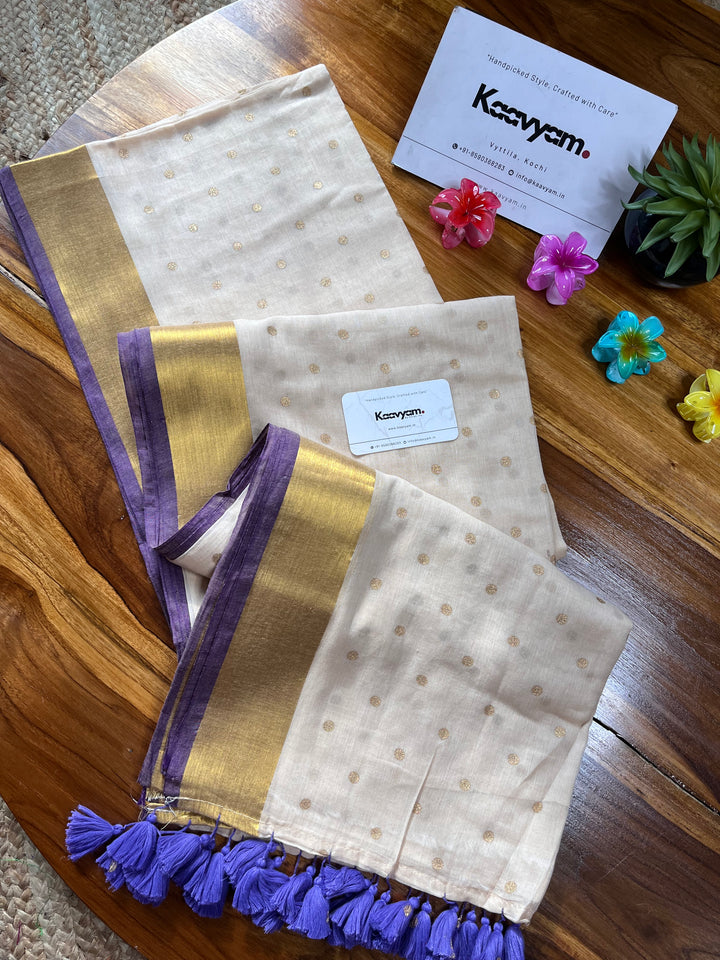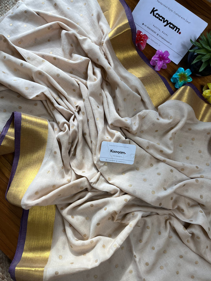 Light weight breathable mul cotton saree with golden polka and kasav and kara border all over the saree ended with finished tassels