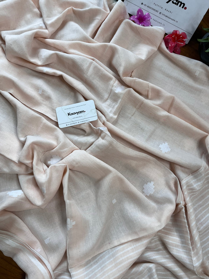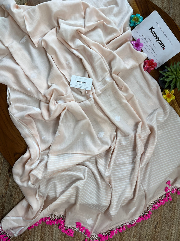 Pure hanloom jamdani red saree with white handloom motifs all over the saree ended with handmade tassels on pallu.