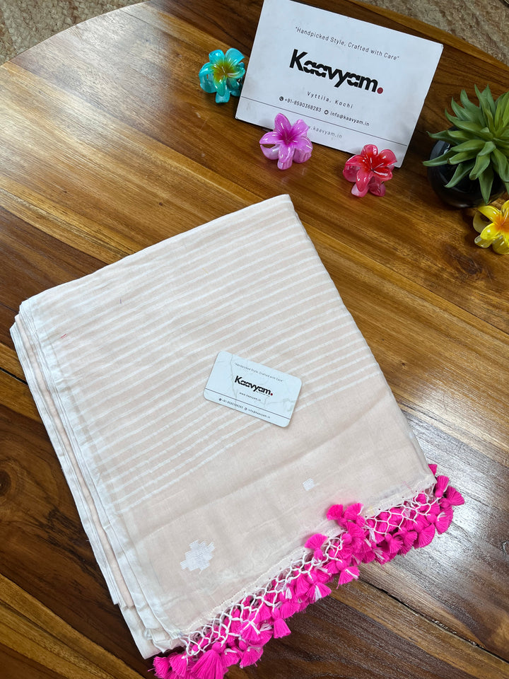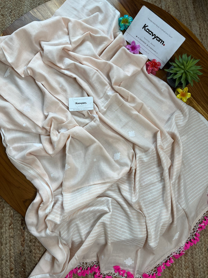 Handloomed and hand painted, resulting in a unique and authentic piece. This saree may contain minor thread pulls and paint stains. Please note that tassels may vary in size and color due to availability.