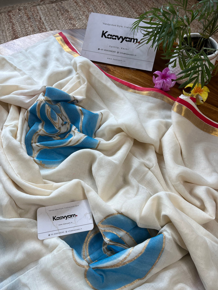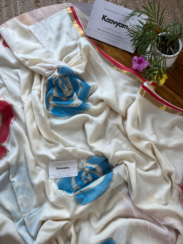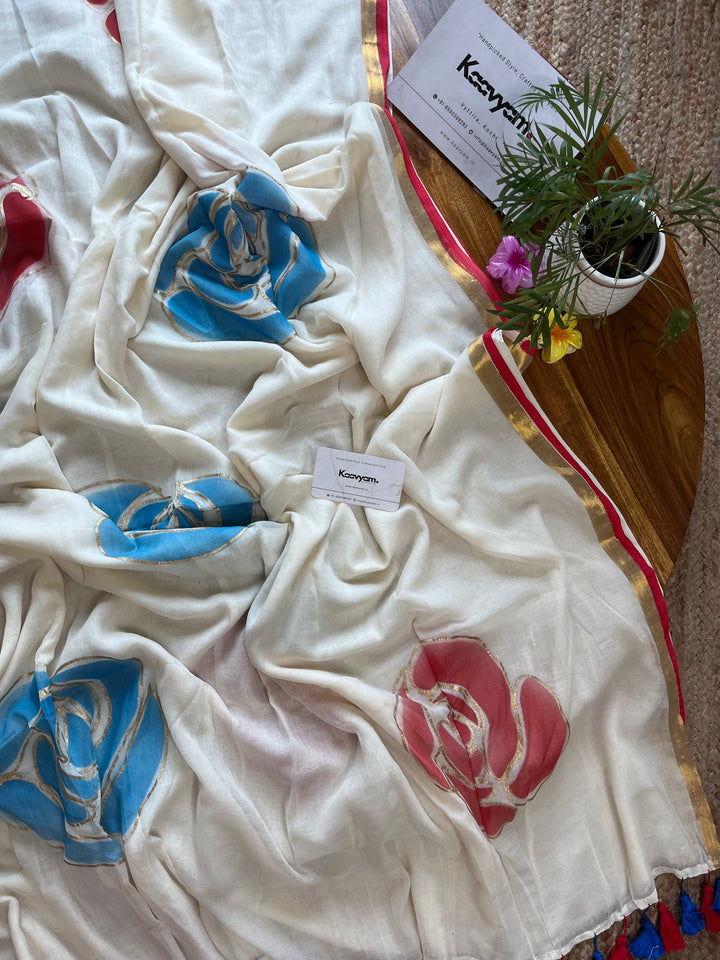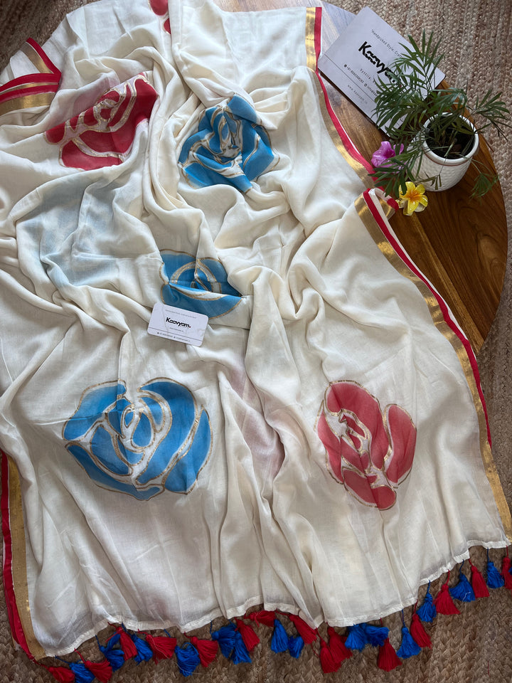 Premium mul cotton saree with rose hand painted along with glitters and golden kasav border all over the saree ended with handmade tassels on pallu.
