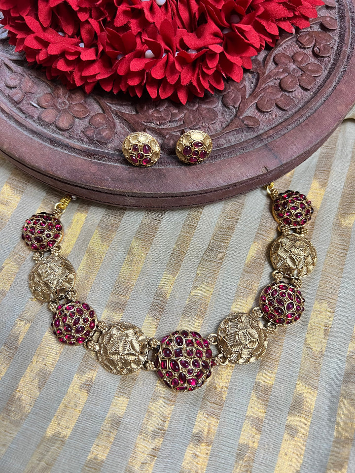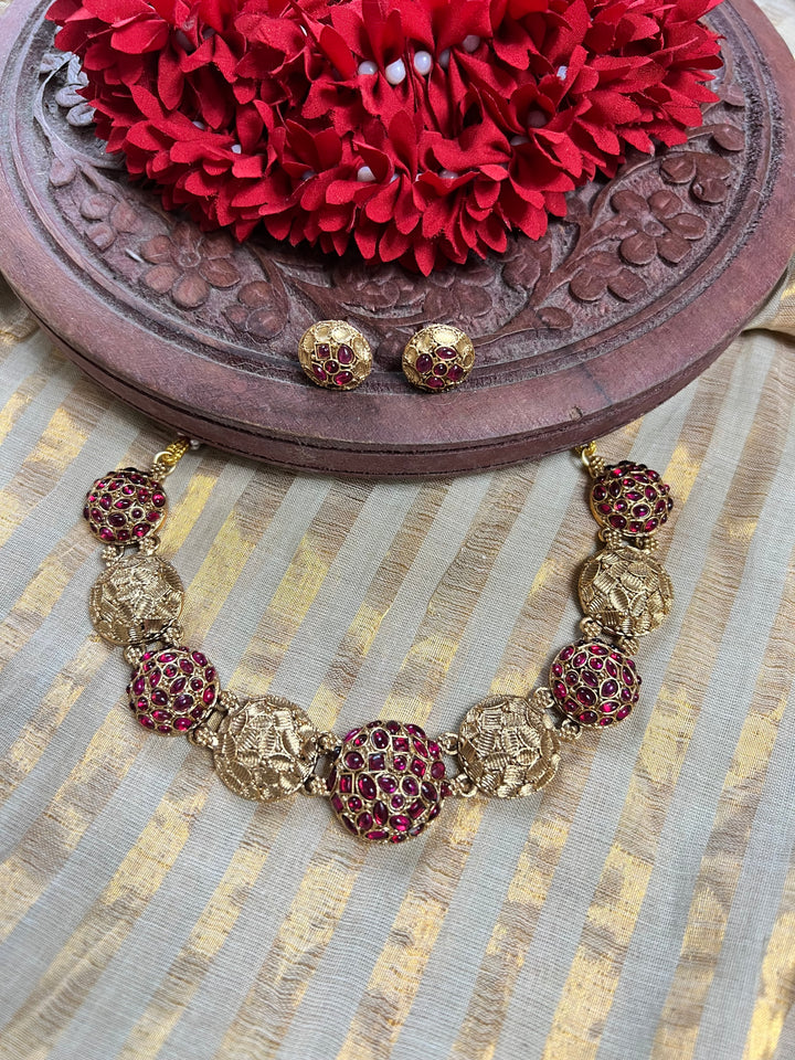Ruby Motif Necklace Product Details:✔ Gold pleated stone Jewellery ✔ Includes: Neckpiece & earrings ✔ Craftsmanship: Premium Indians style finished jewellery ✔ Care: Avoid contact with water & perfume ✔ Actual...