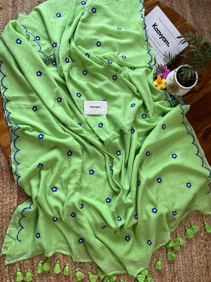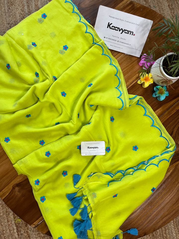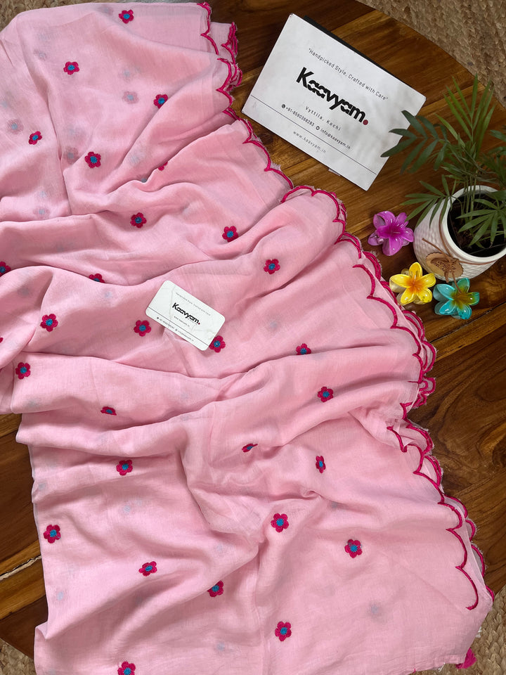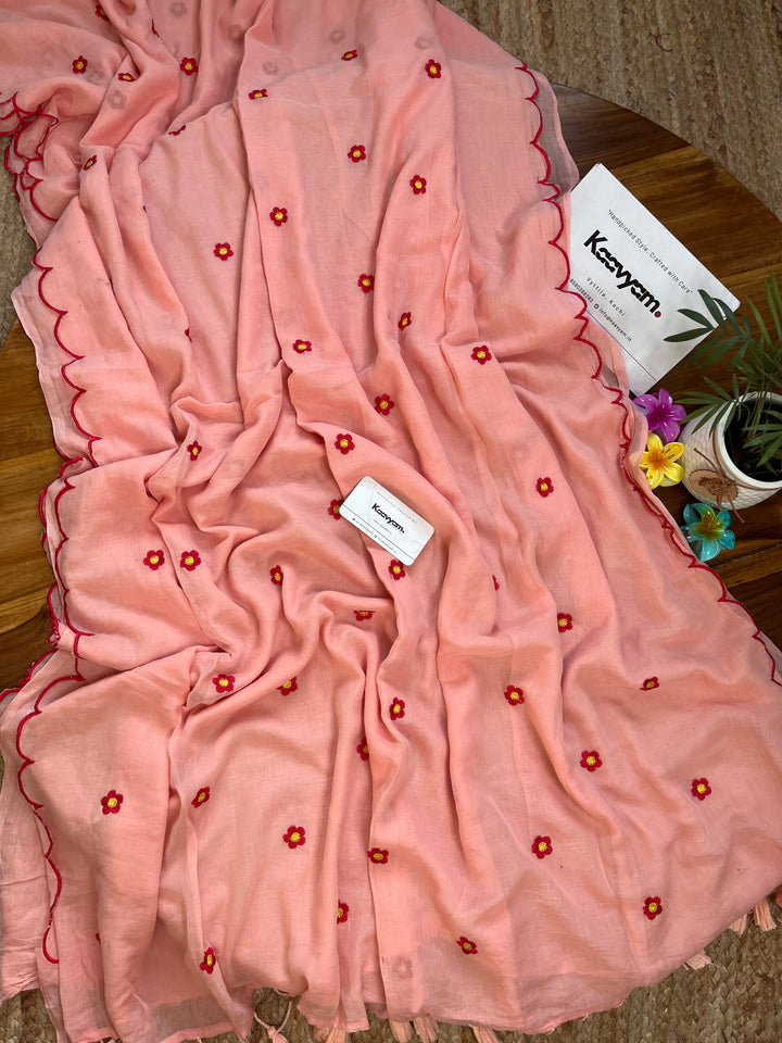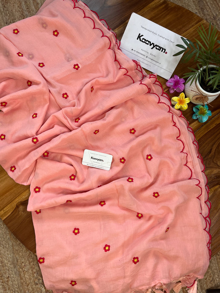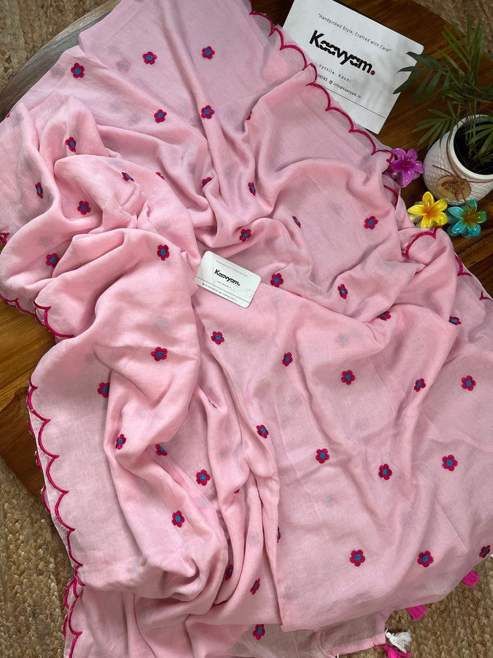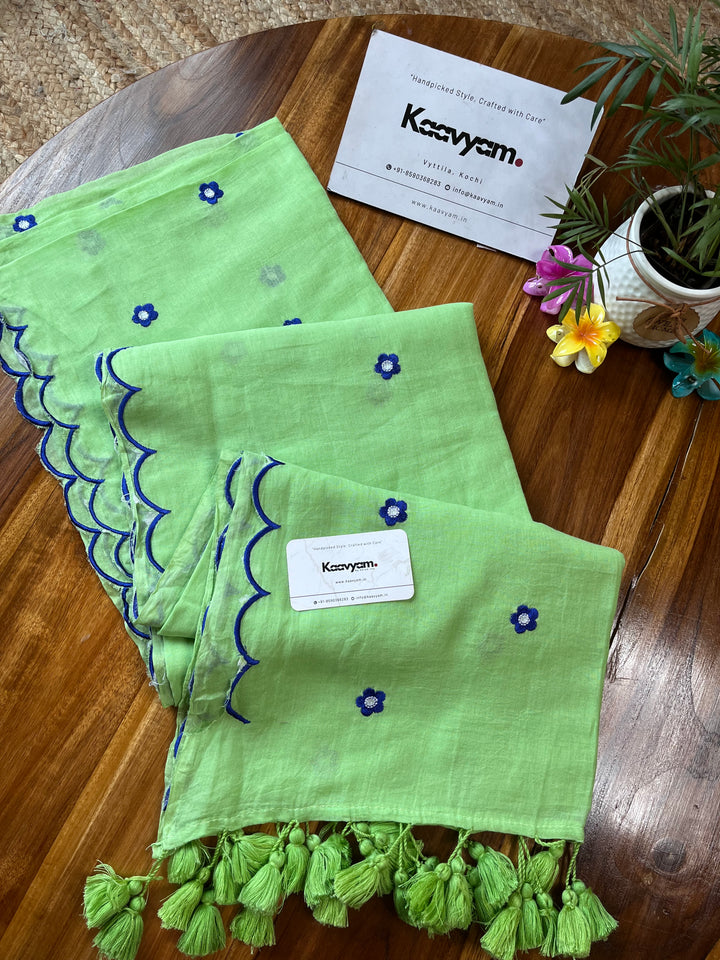 Pure 120 count mul mul cotton saree with contrast color floral embroidery spread and scalloped border all over the saree ended with handmade tassels on pallu.