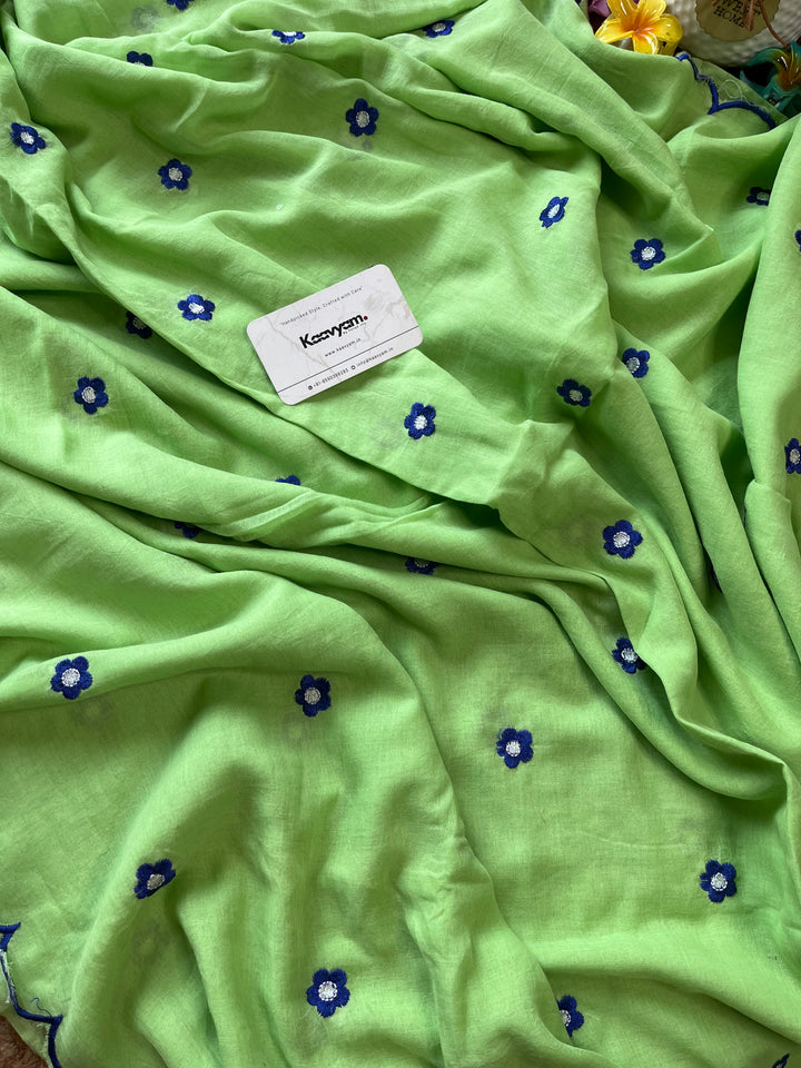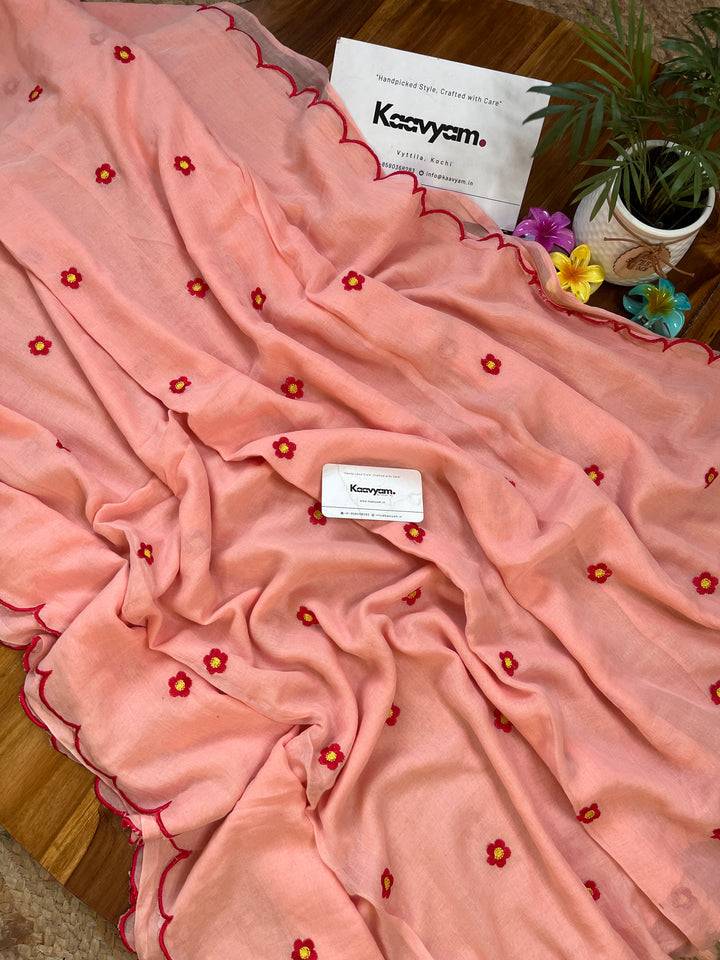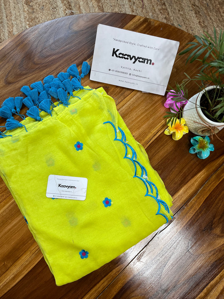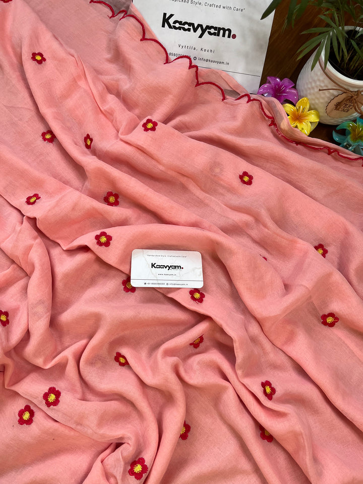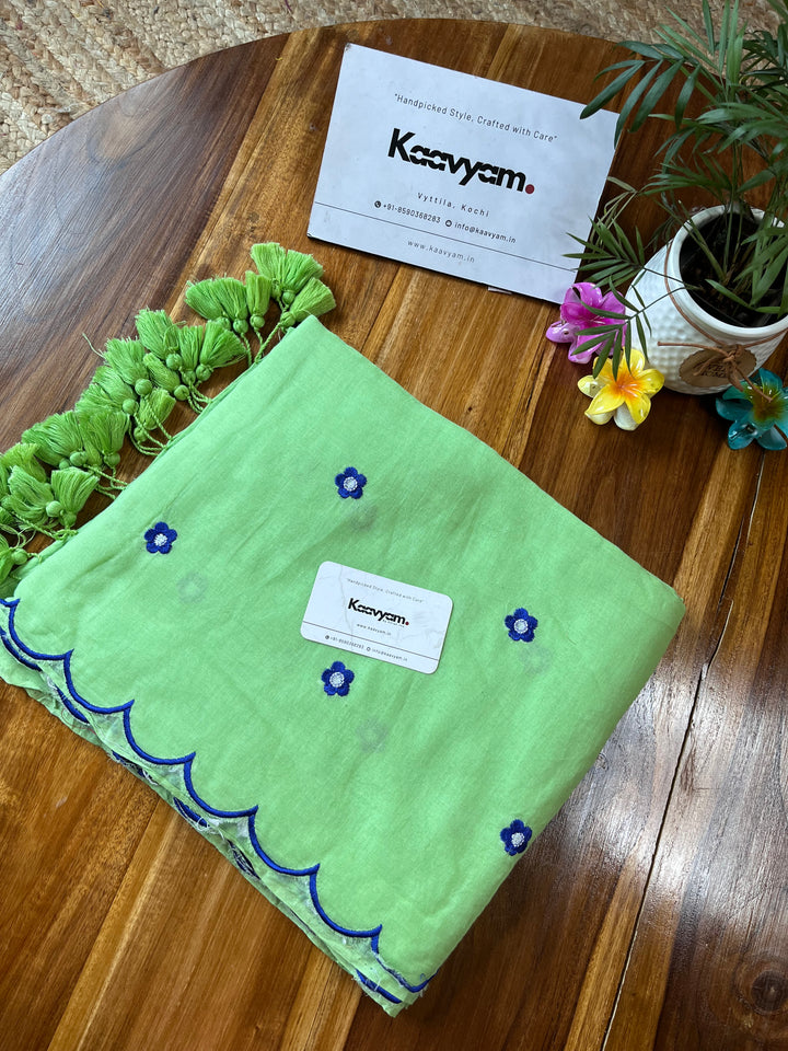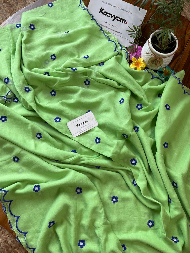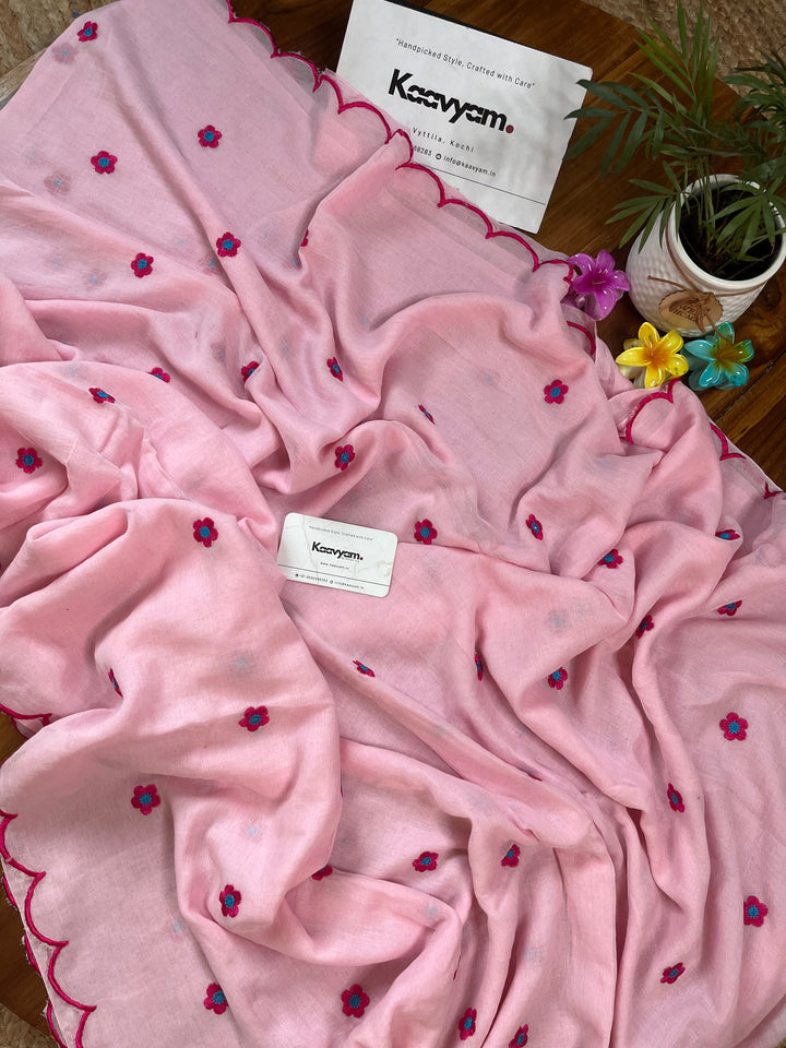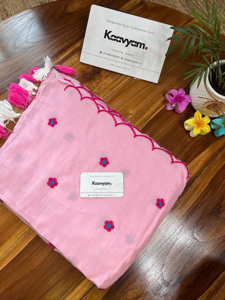 Pure 120 count mul mul cotton saree with contrast color floral embroidery spread and scalloped border all over the saree ended with handmade tassels on pallu.