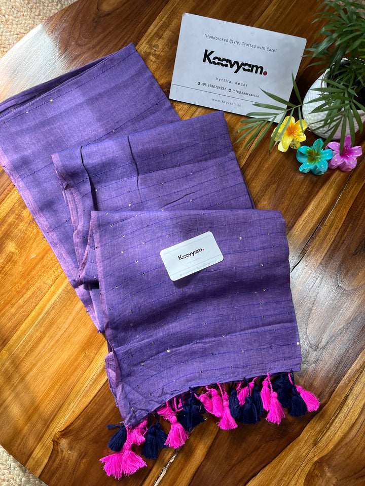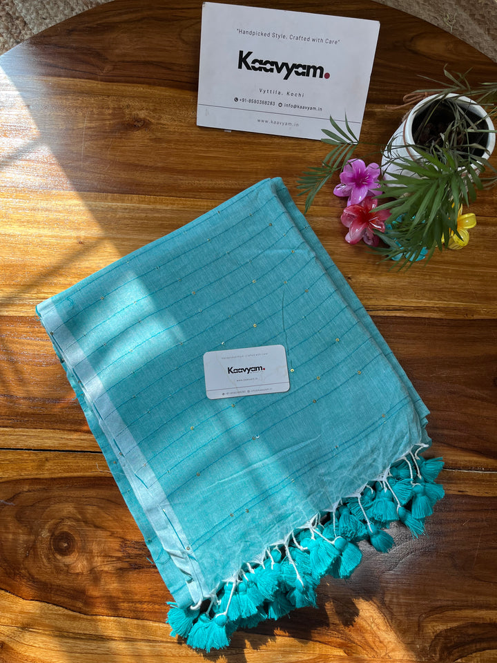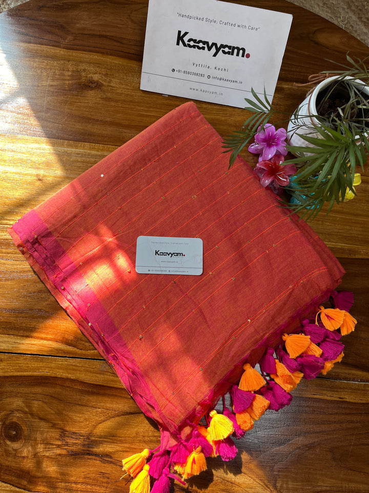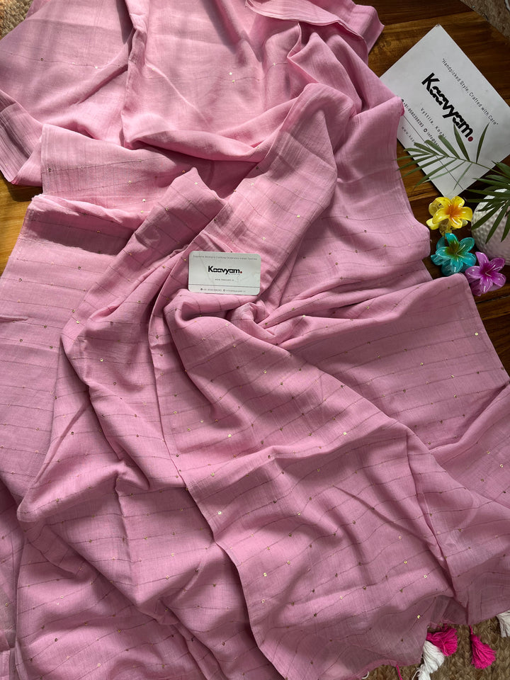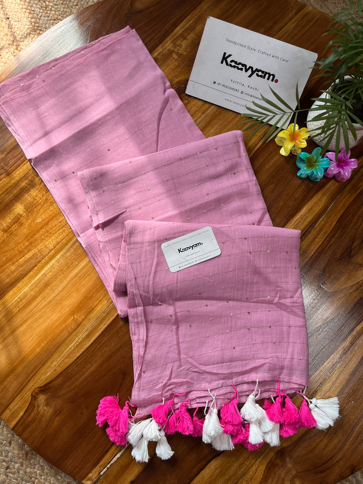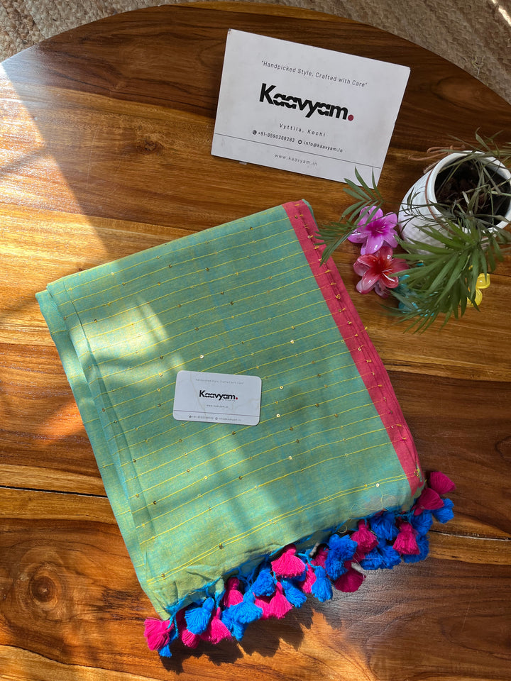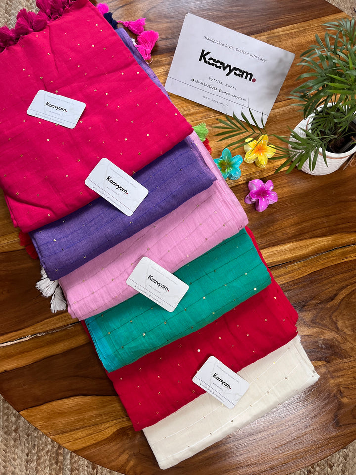 120 count plain soft mul cotton saree with rich sequins stripes all over the saree ended with handmade tassels on pallu