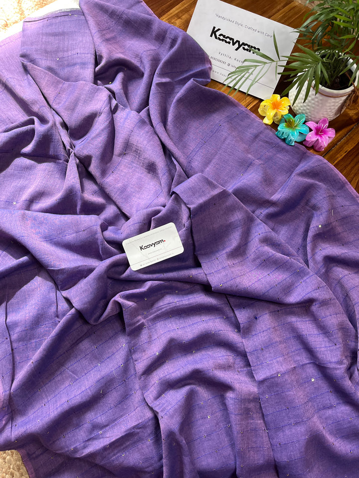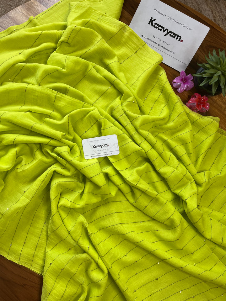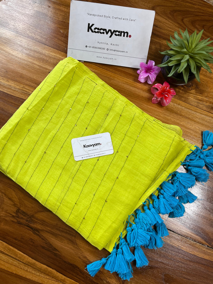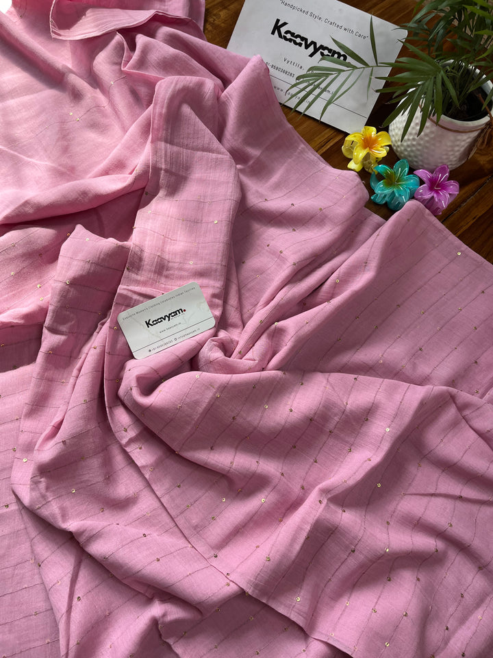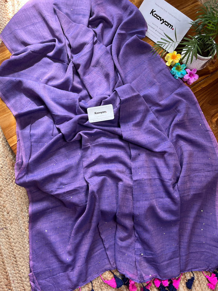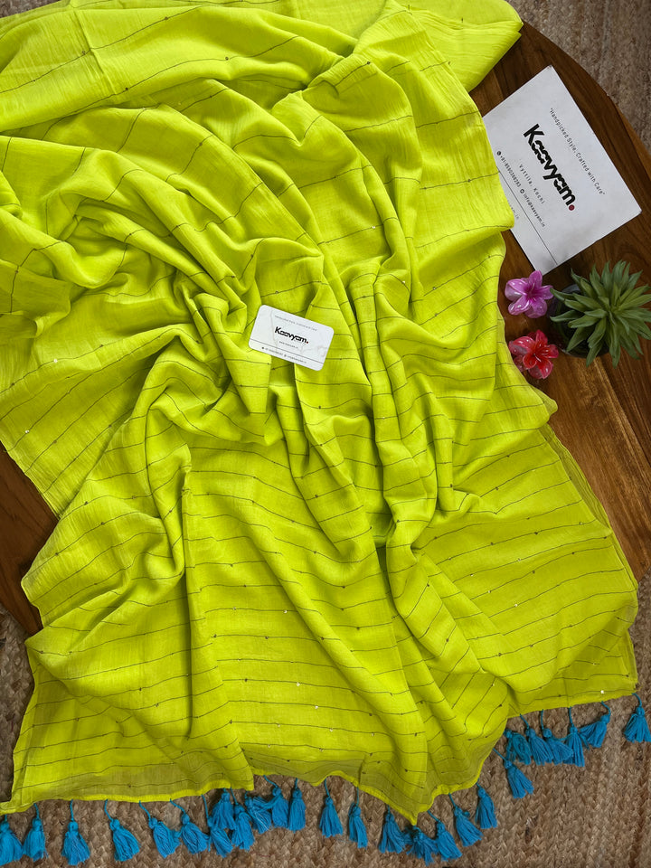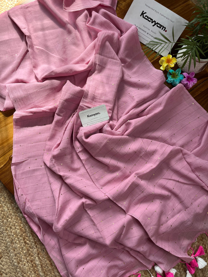 120 count plain soft mul cotton saree with rich sequins stripes all over the saree ended with handmade tassels on pallu