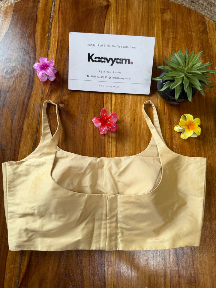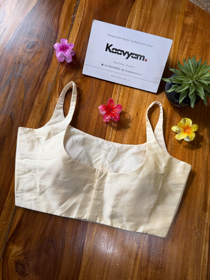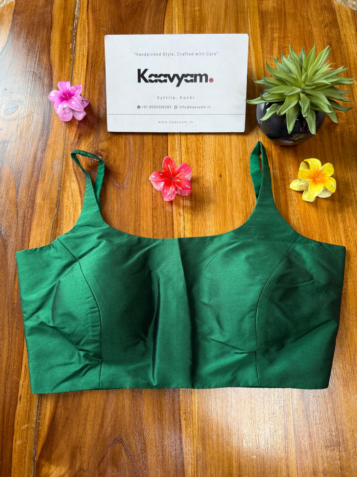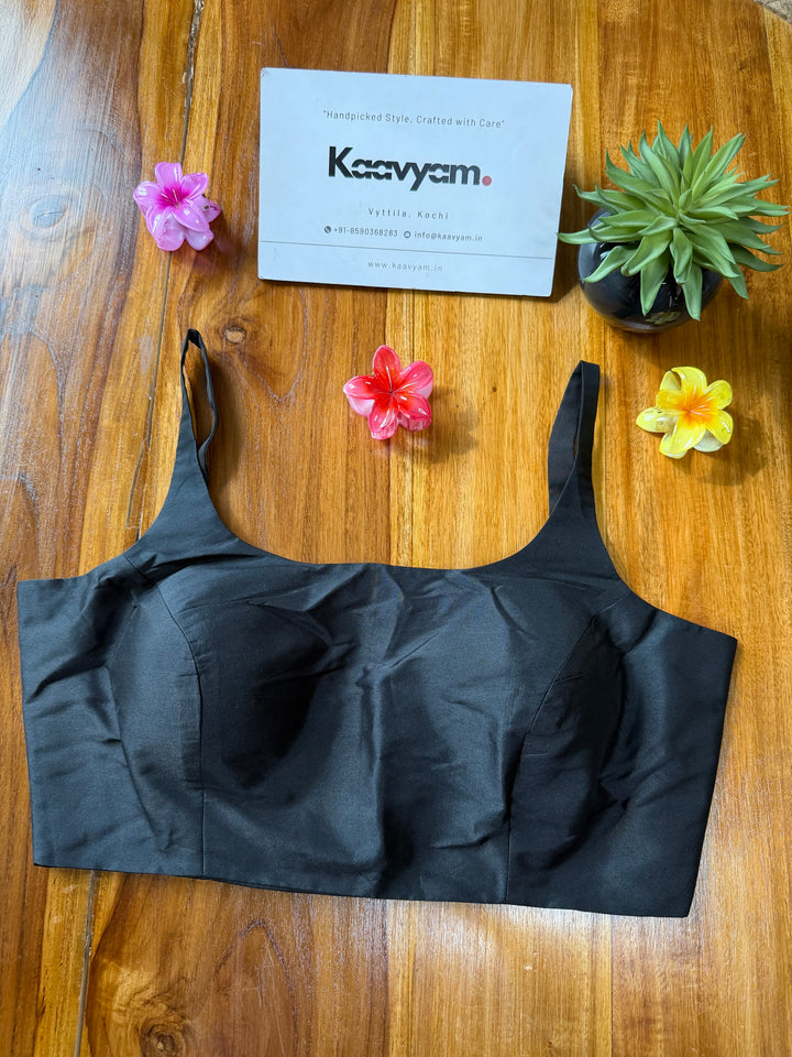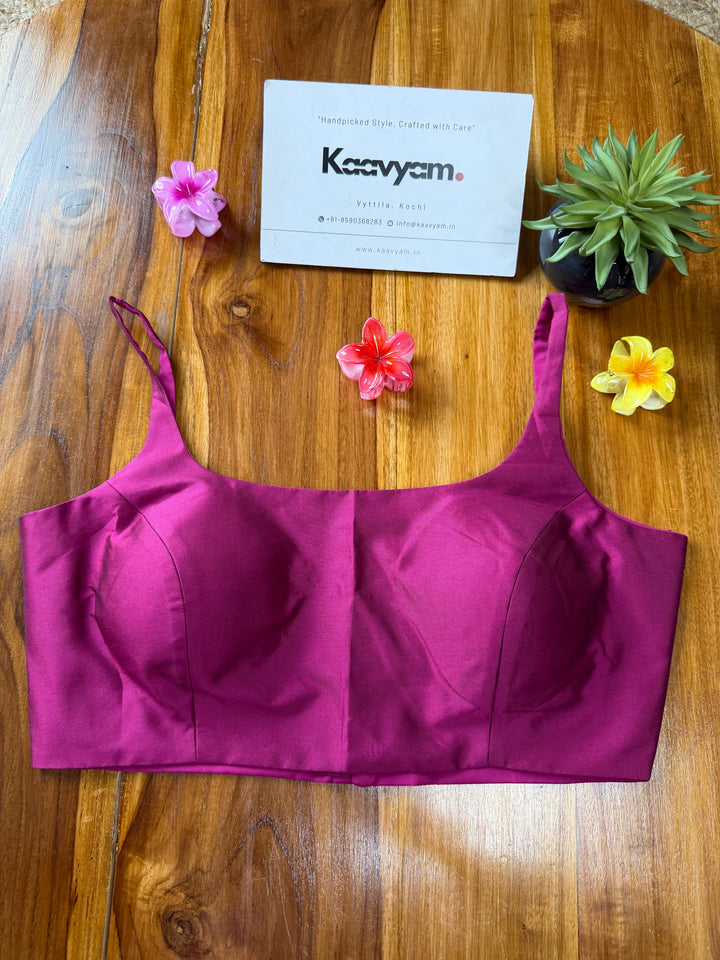 Plain shiny and textured blouse stitched with lining, back open, round neck and padded.