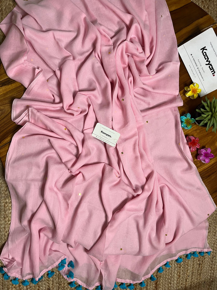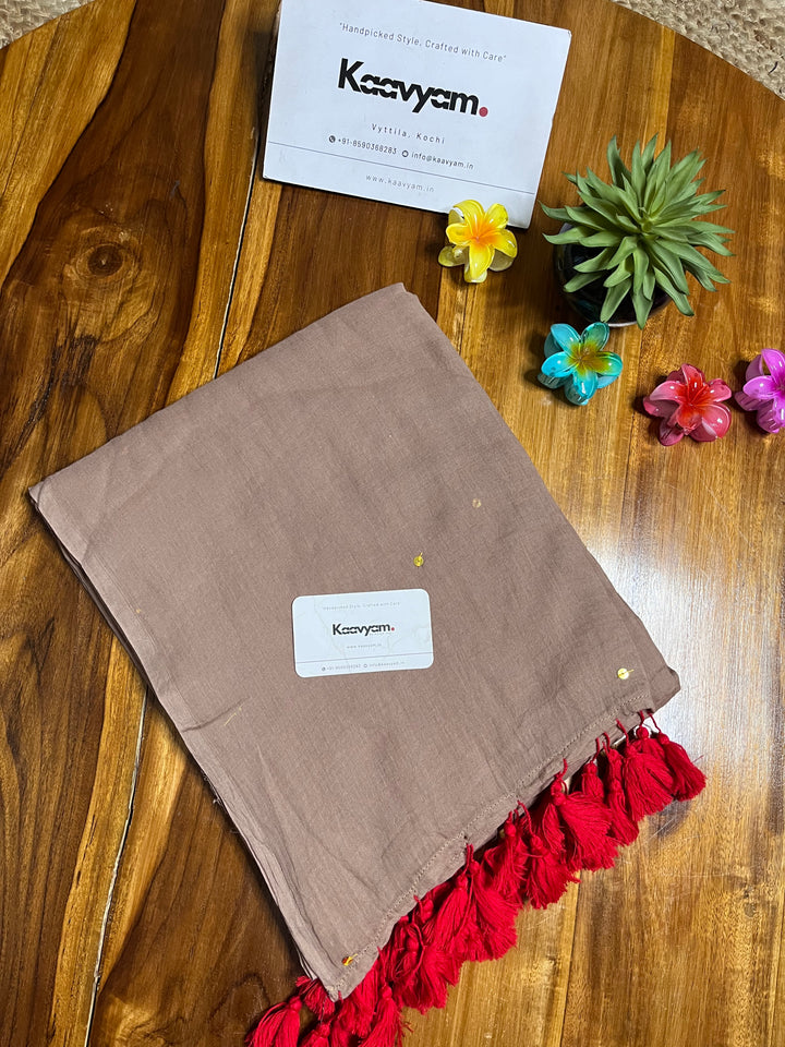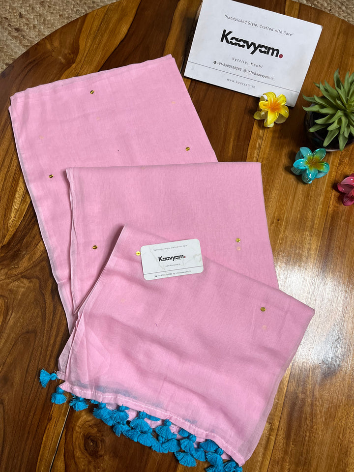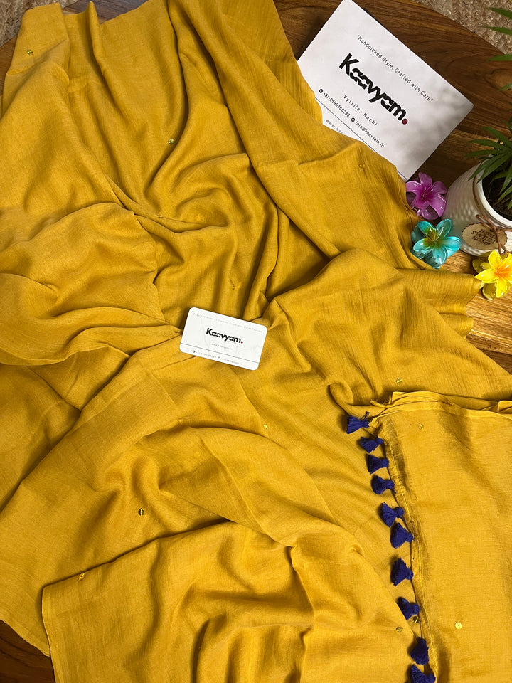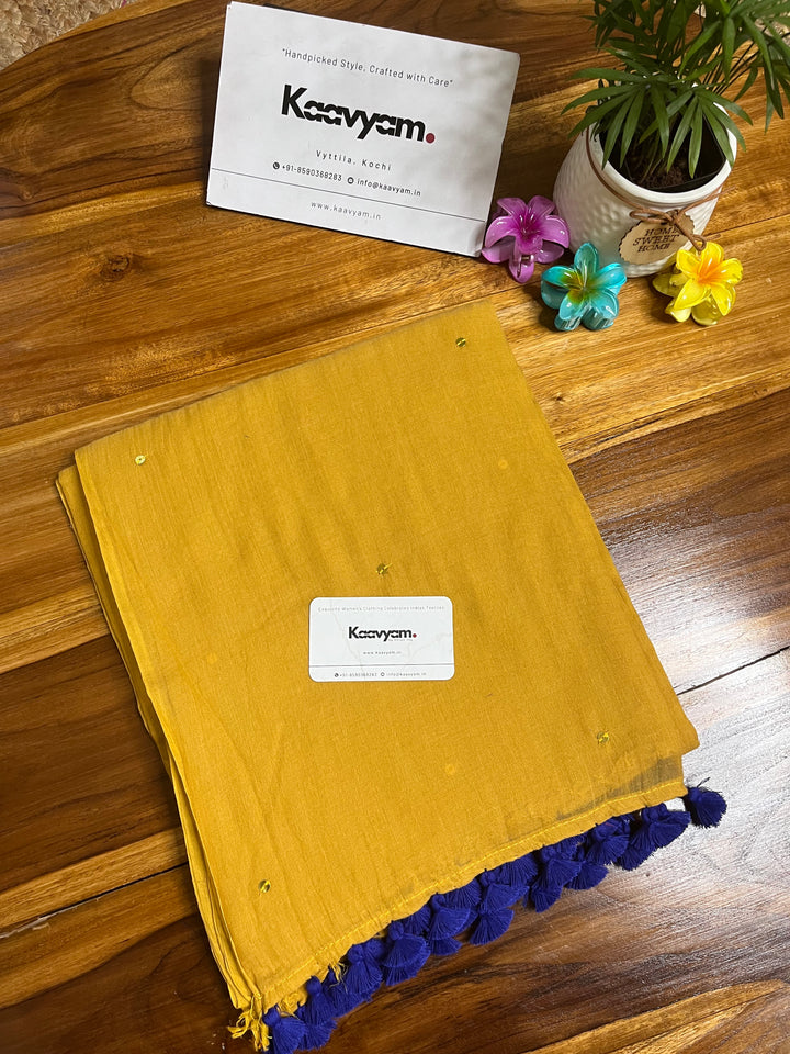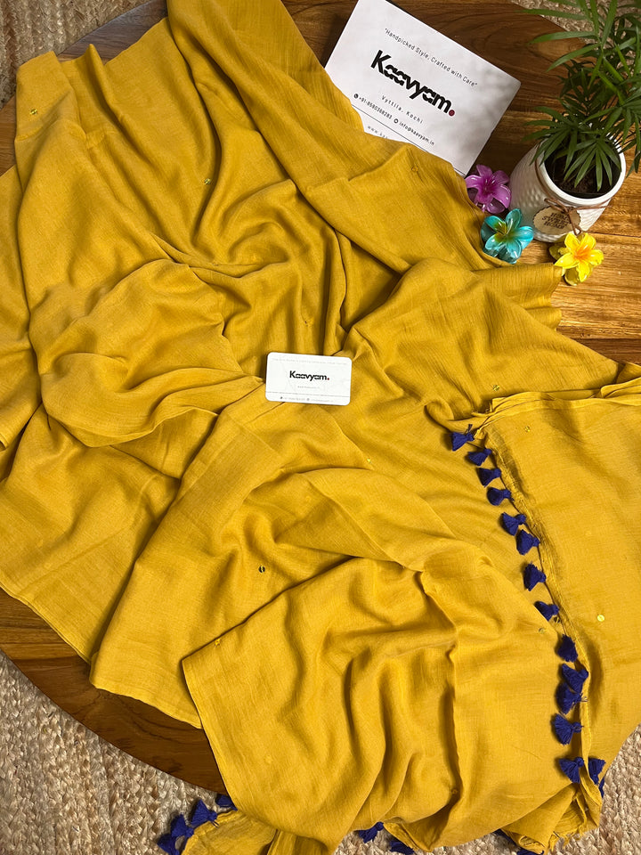 Pure cotton mul mul plain saree with golden small sequins all over the saree ended with handmade tassels on pallu