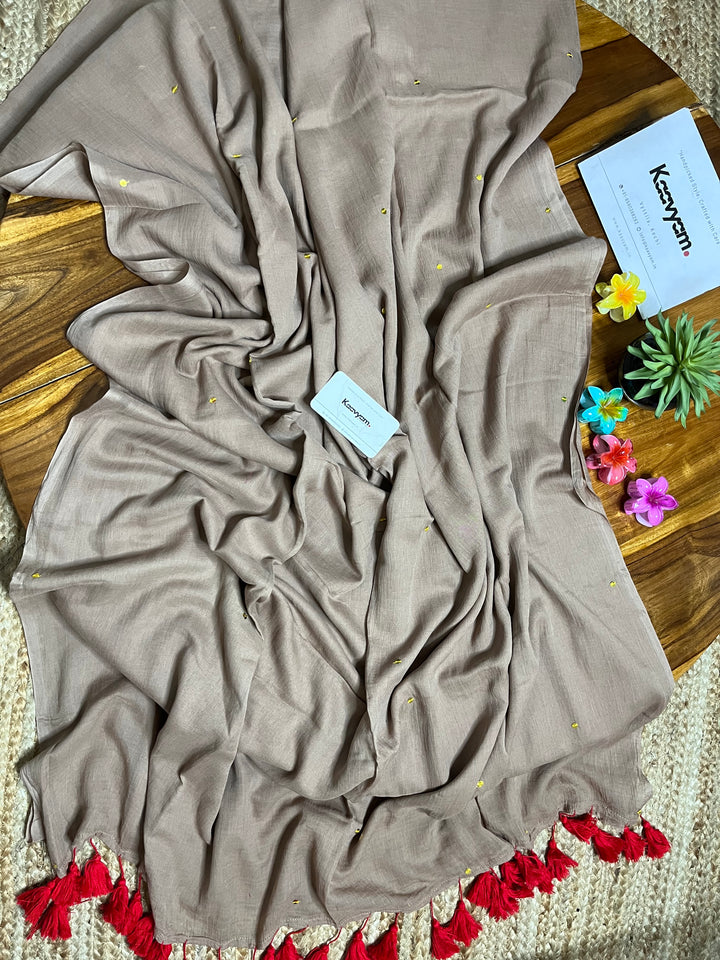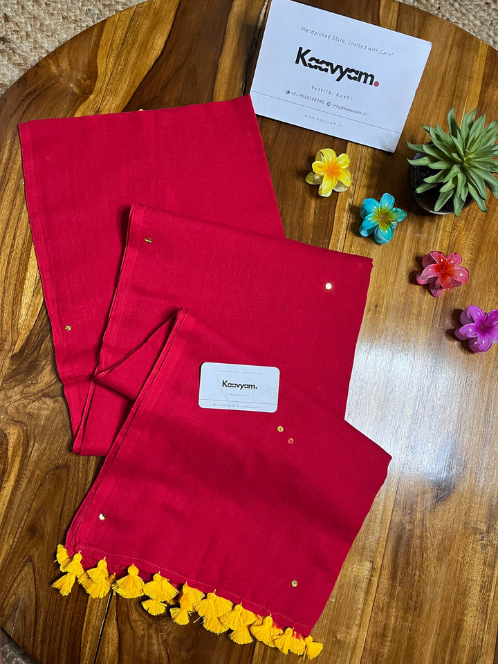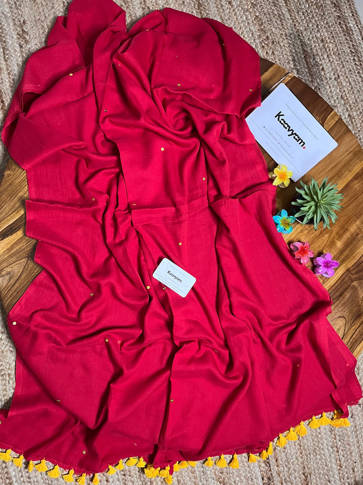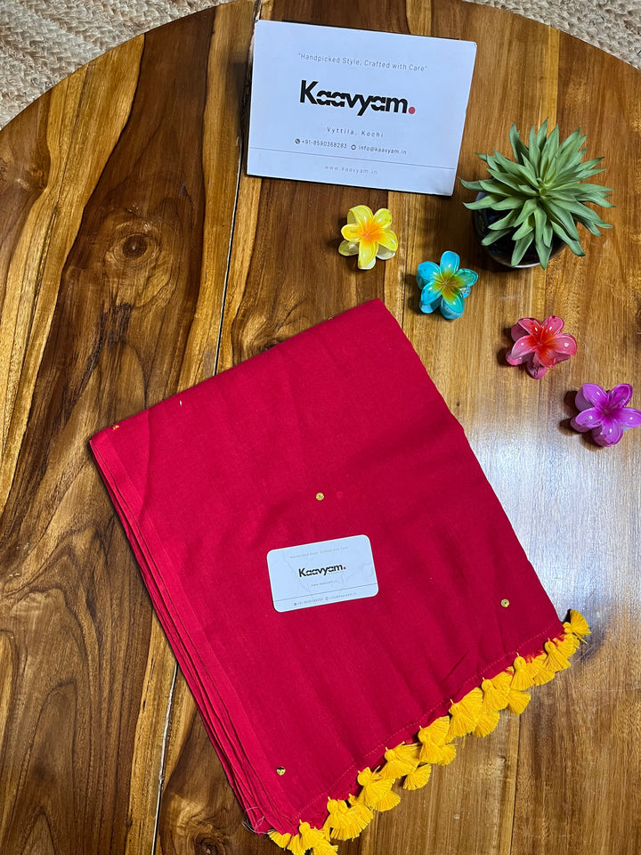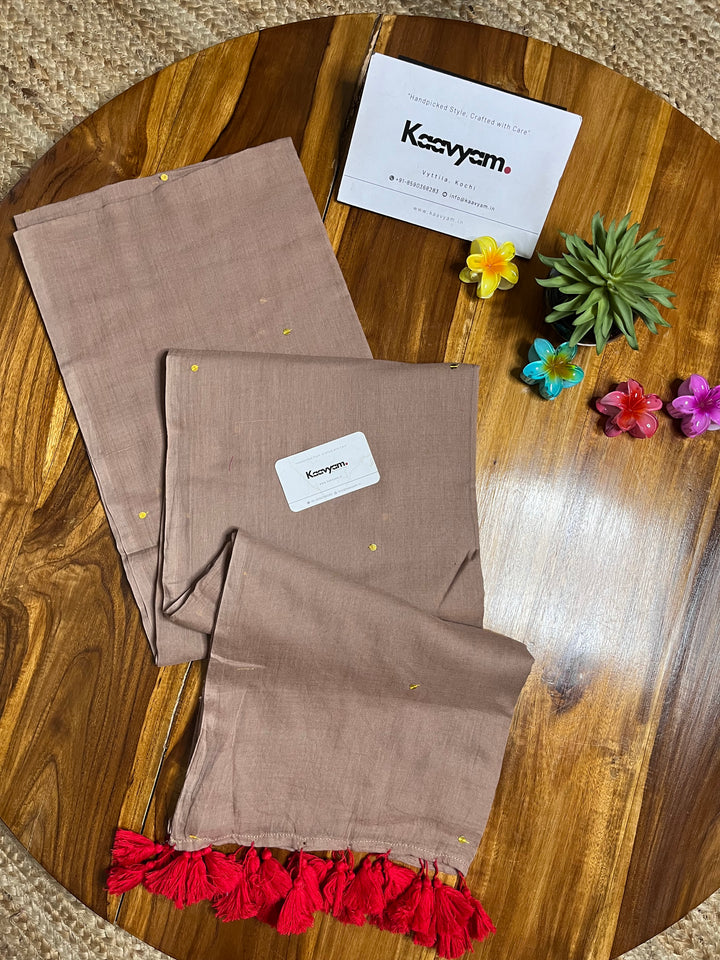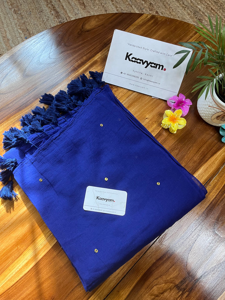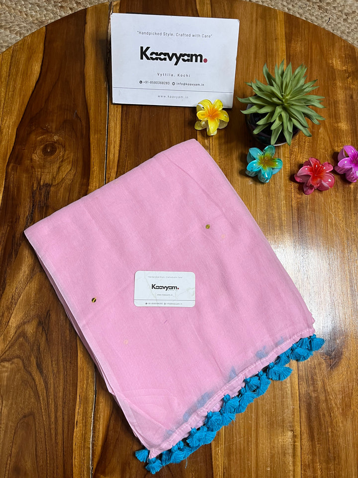 Pure cotton mul mul plain saree with golden small sequins all over the saree ended with handmade tassels on pallu