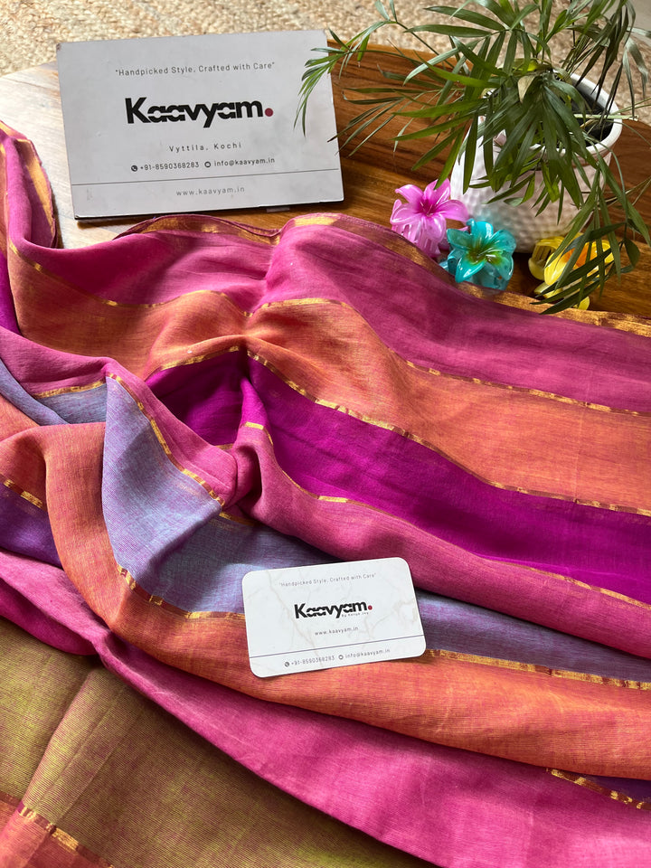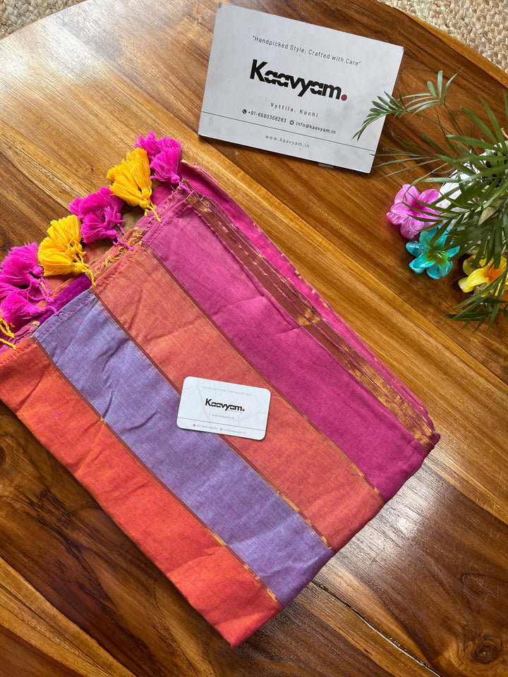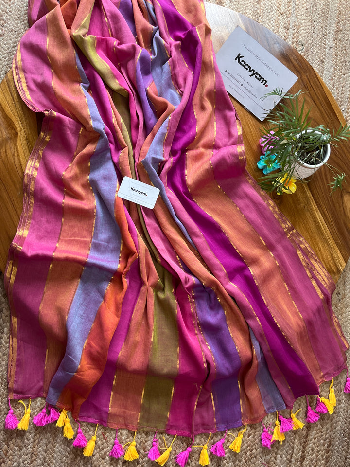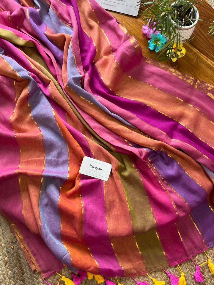 Multi color stripe mul cotton saree with golden zari woven stripes all over the saree ended with handmade tassels on pallu.