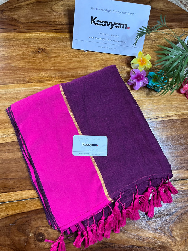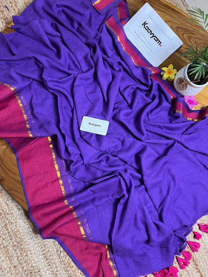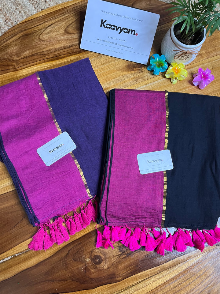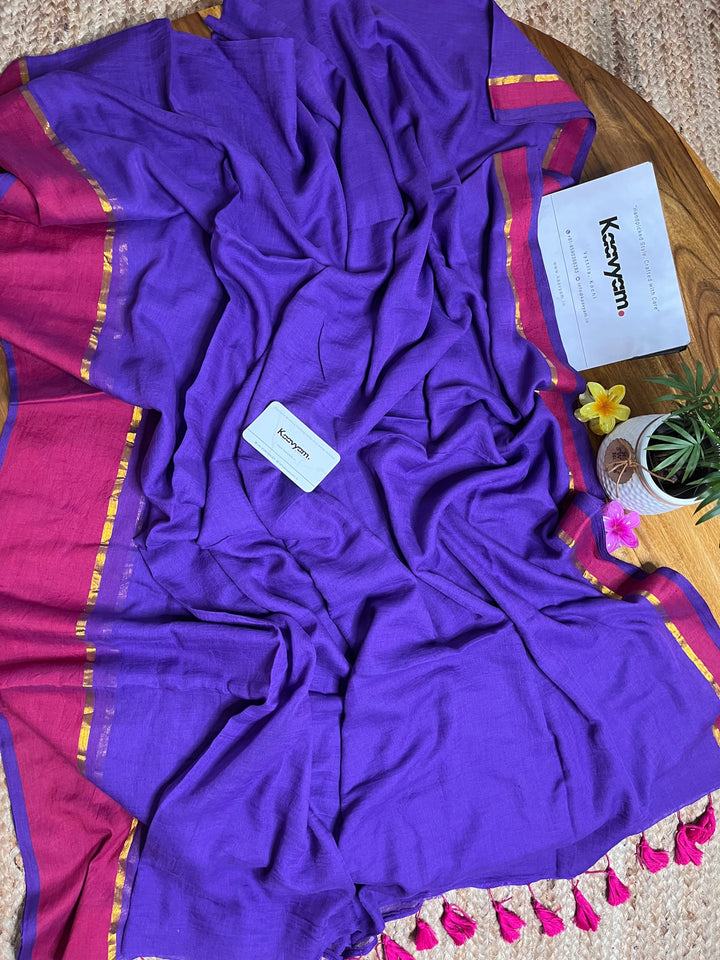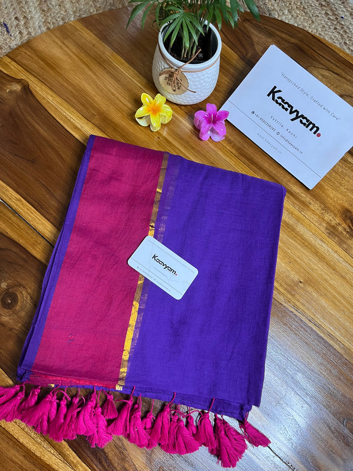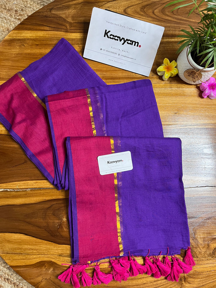 Plain cotton saree with golden zari woven kasav stripe and contrast color border all over the saree ended with handmade tassels on pallu