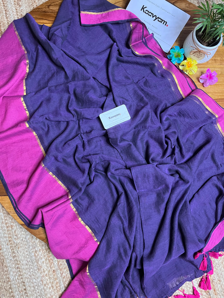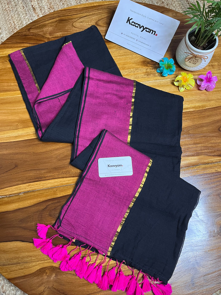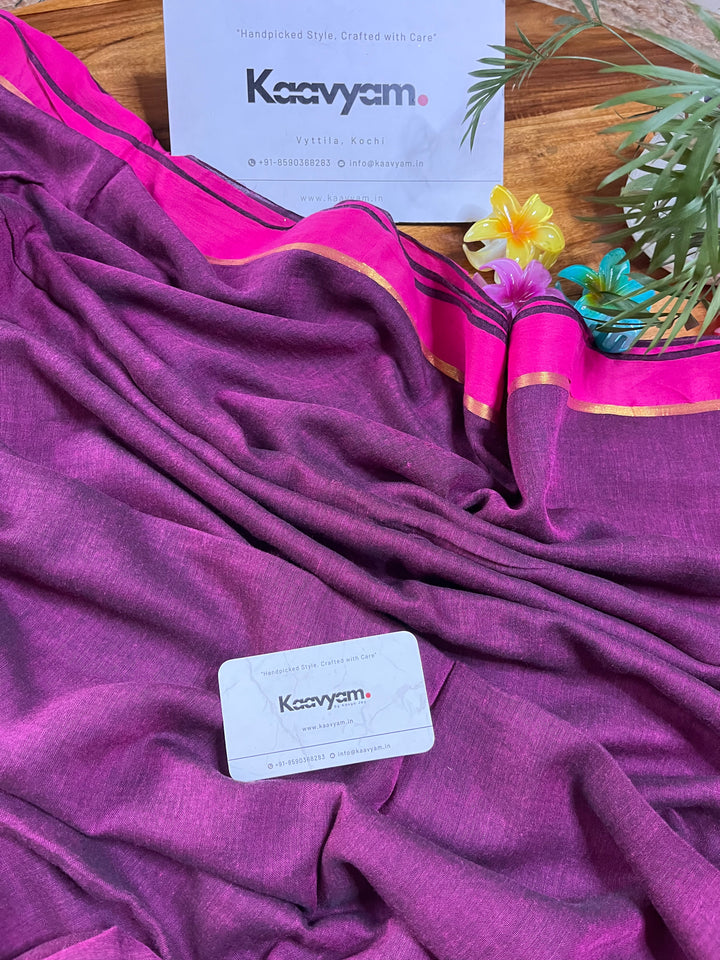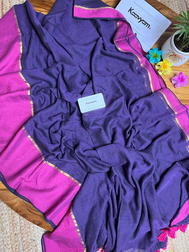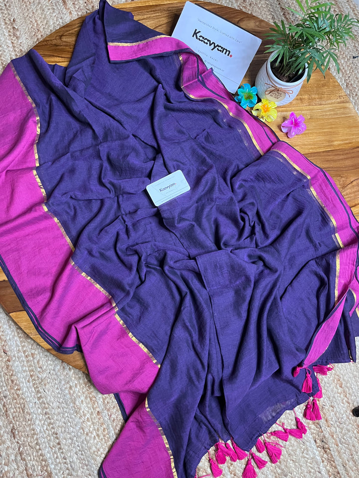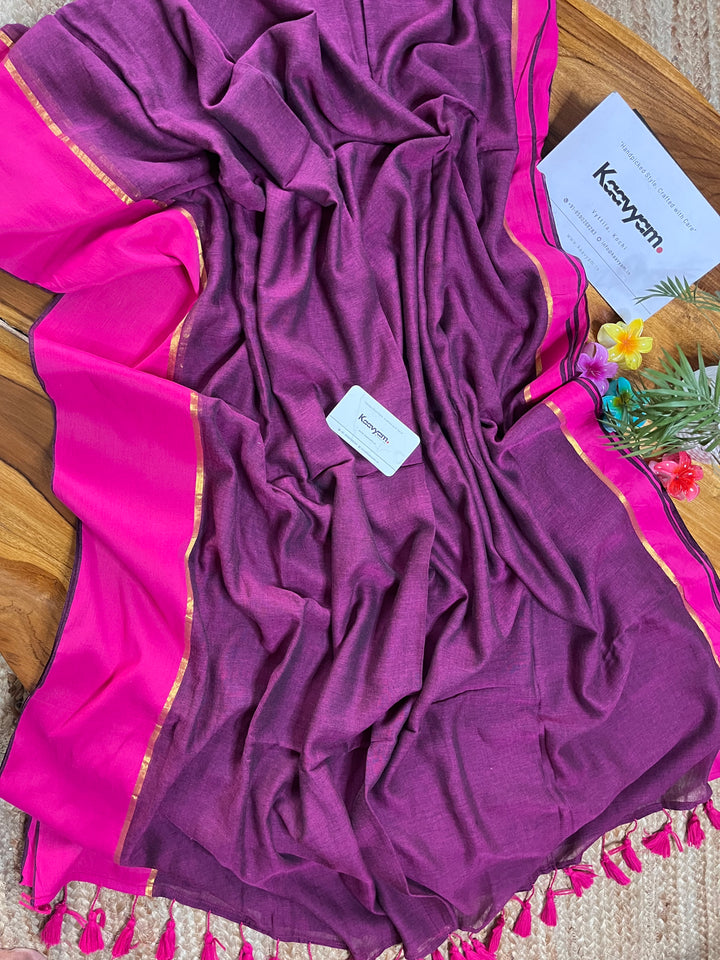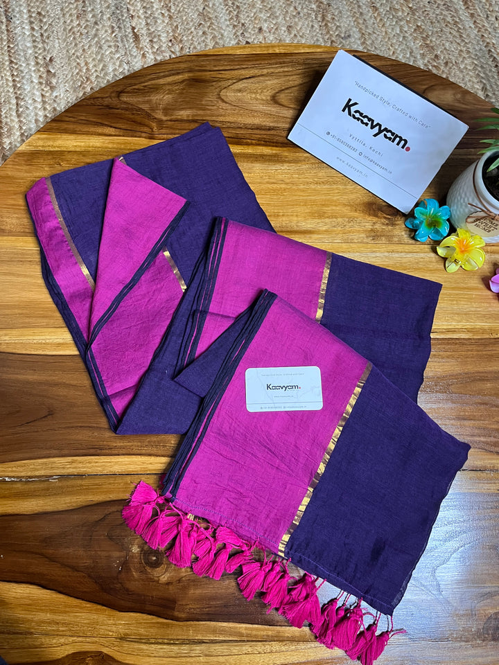 Plain cotton saree with golden zari woven kasav stripe and contrast color border all over the saree ended with handmade tassels on pallu