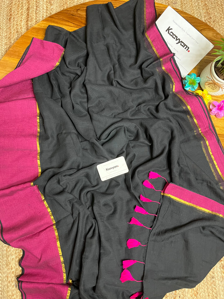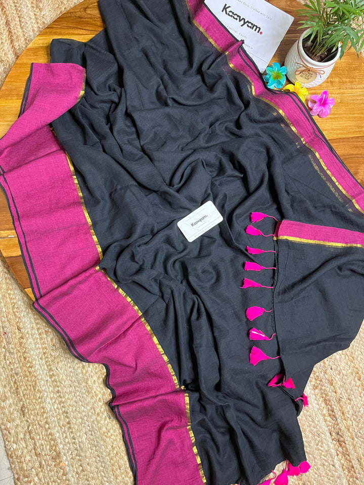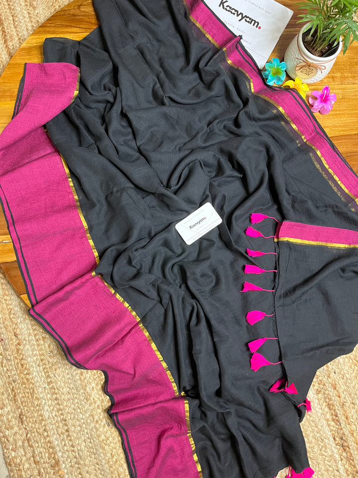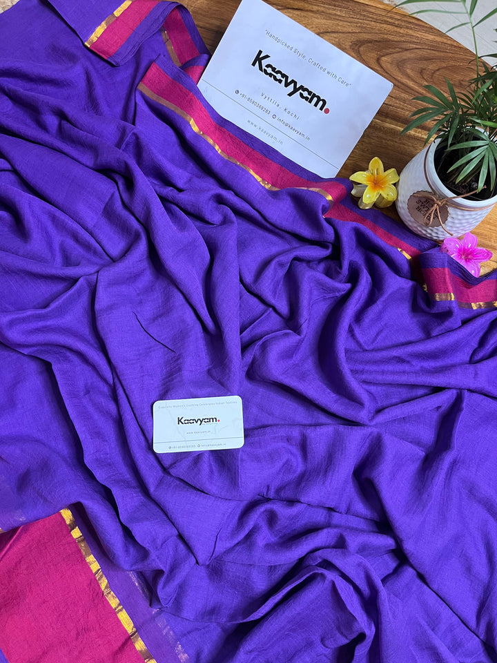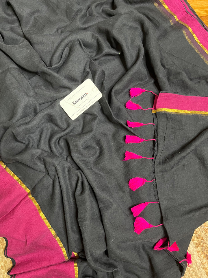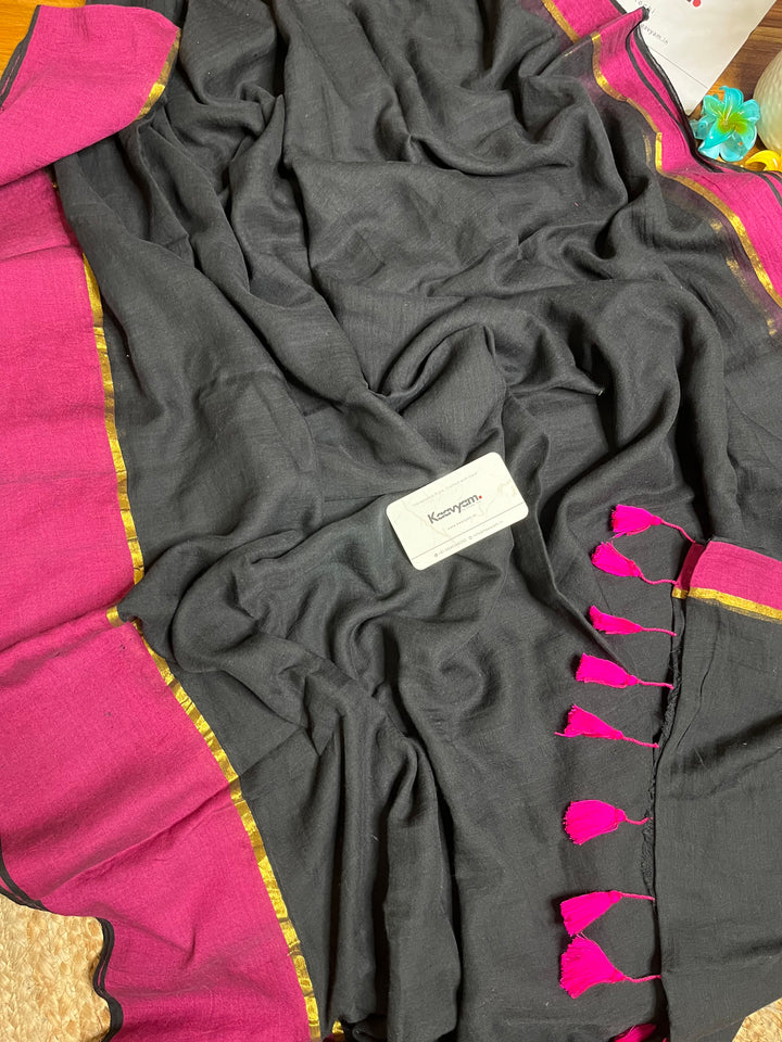 Plain cotton saree with golden zari woven kasav stripe and contrast color border all over the saree ended with handmade tassels on pallu