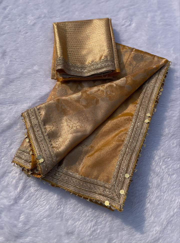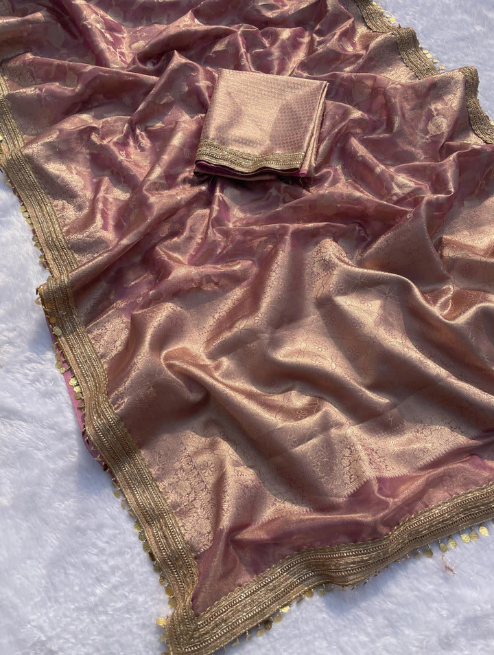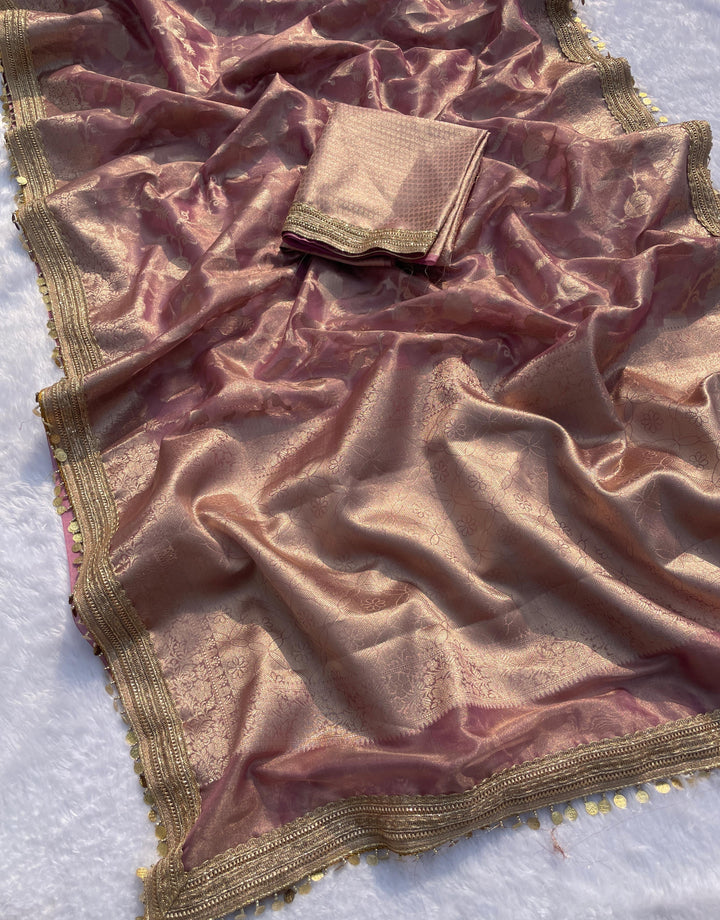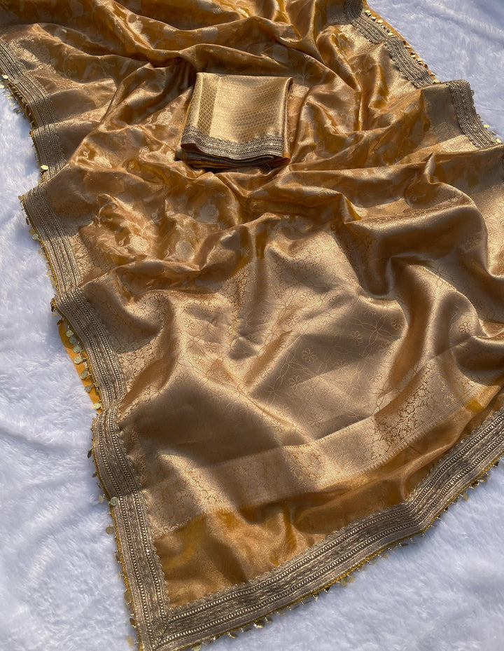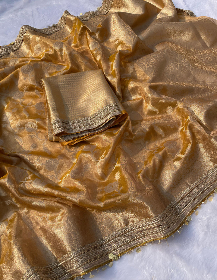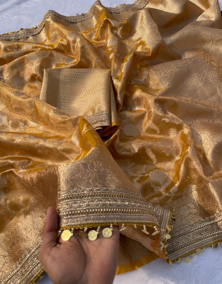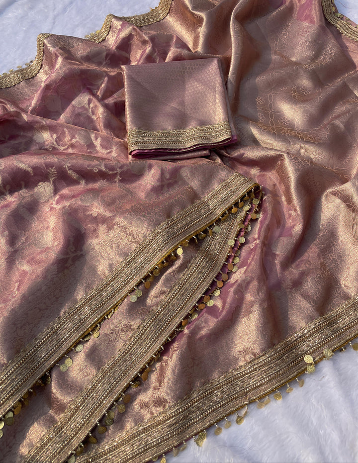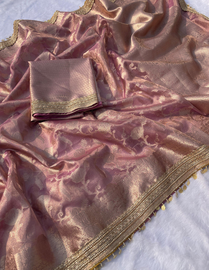Tissue banarasi woven saree with rich banarasi woven border and pallu with premium maharani lace border all over the saree