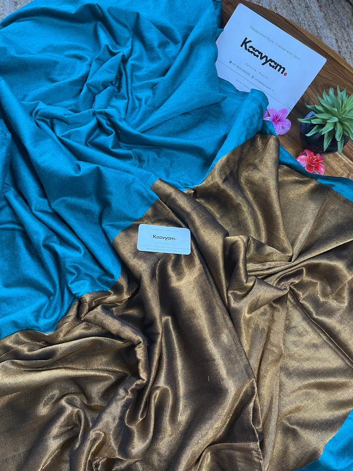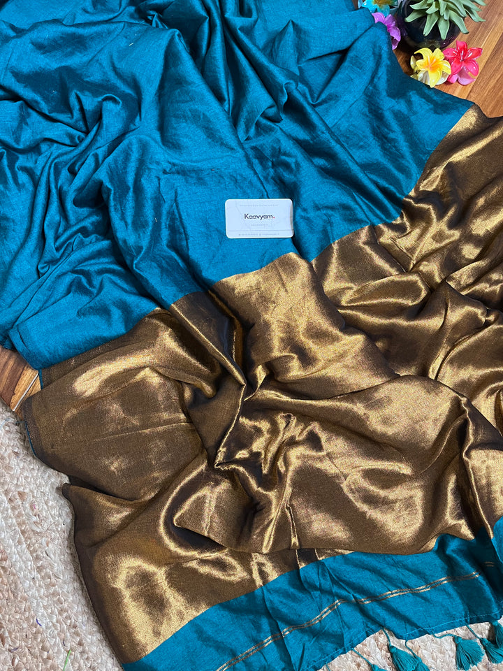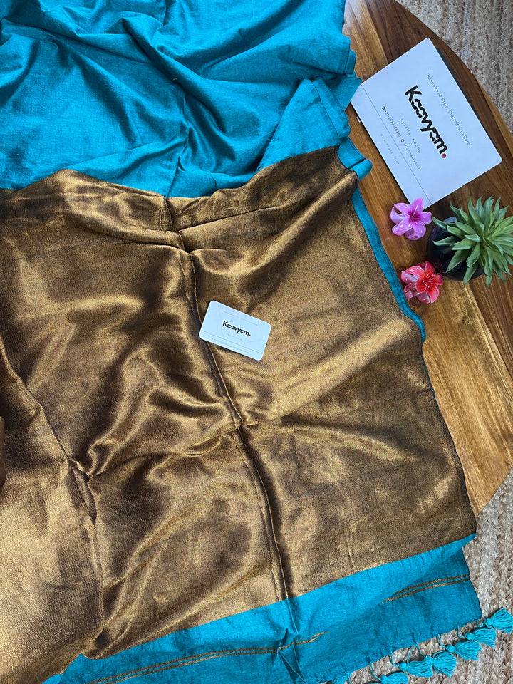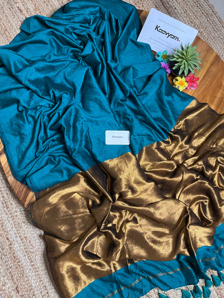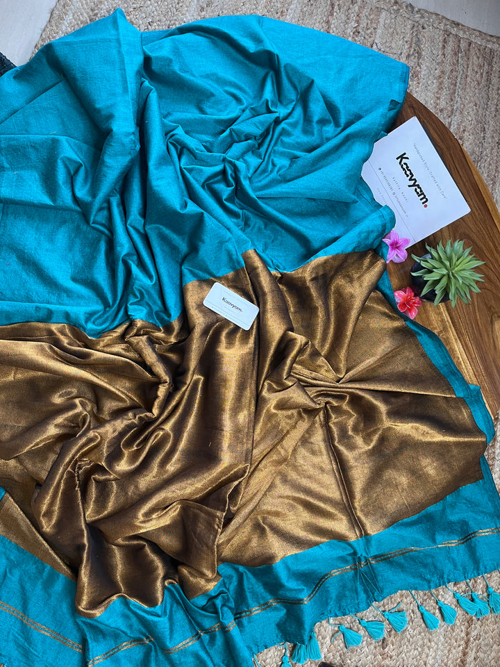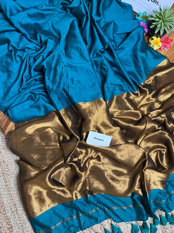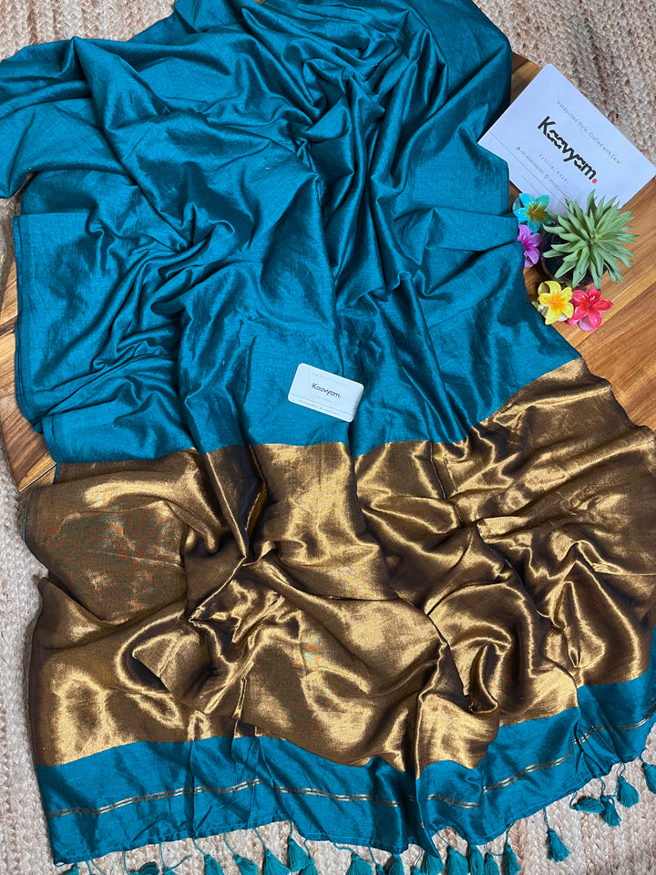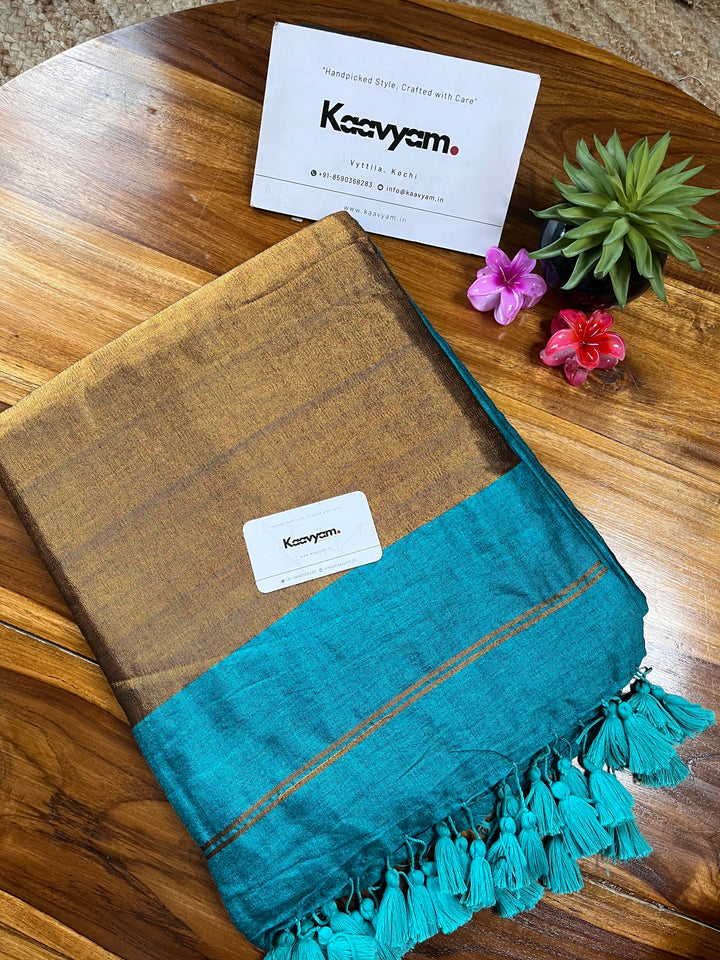 Multi color mul modal shiny look saree with contrast pallu ended with handmade tassels on pallu.