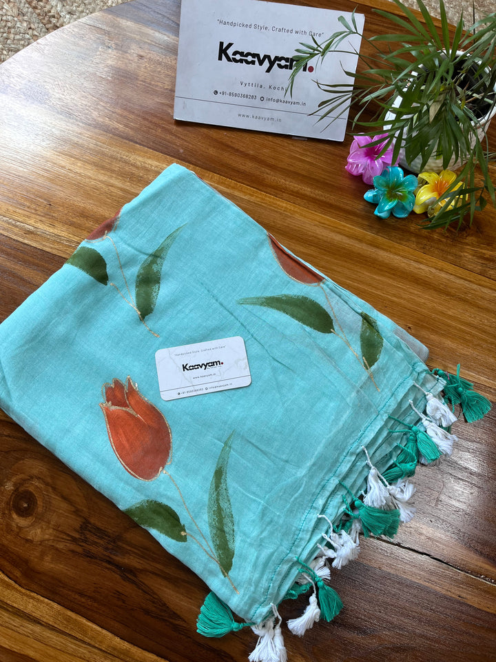 Plain mul cotton saree tulip flower hand painted saree with glitters all over the saree ended with handmade tassels