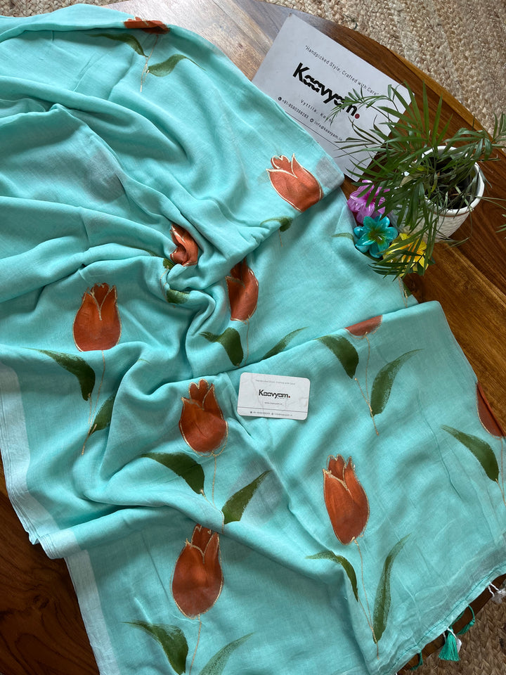 Step in to wedding season with confidence in this breathtaking tulip ensembles from Kaavyam. Fabric - Mul mul cotton Saree only included in this package Plain mul cotton saree tulip flower...