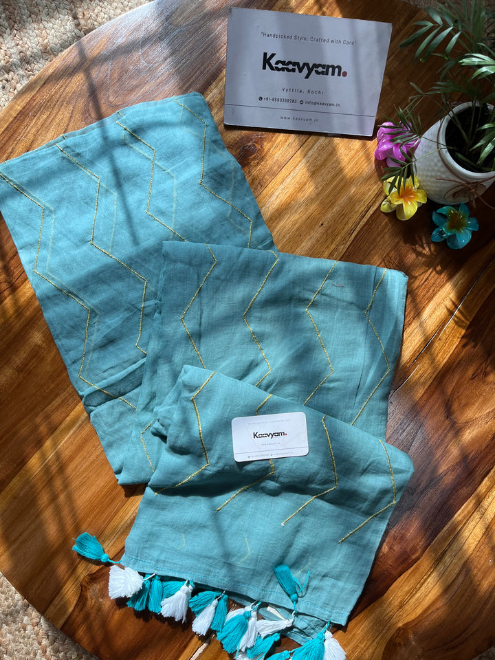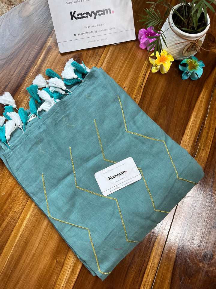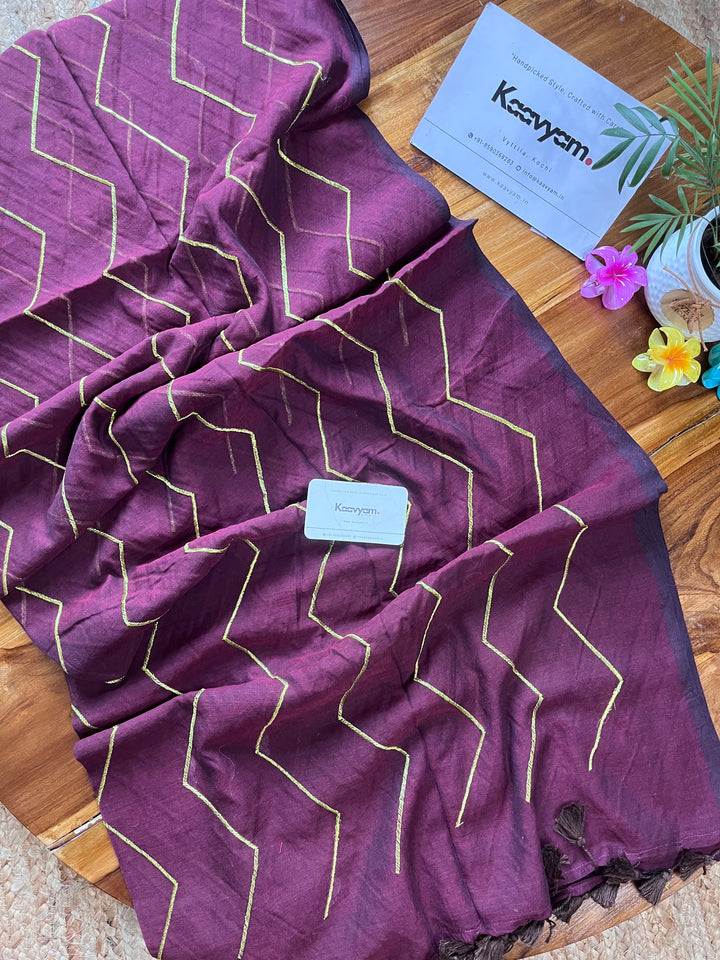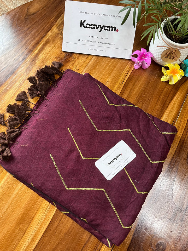 120 count soft plain color mul cotton saree with golden zari woven zig zag lines all over the body of the saree ended with handmade tassels on pallu. Few saree comes with contrast kara border all over the saree.